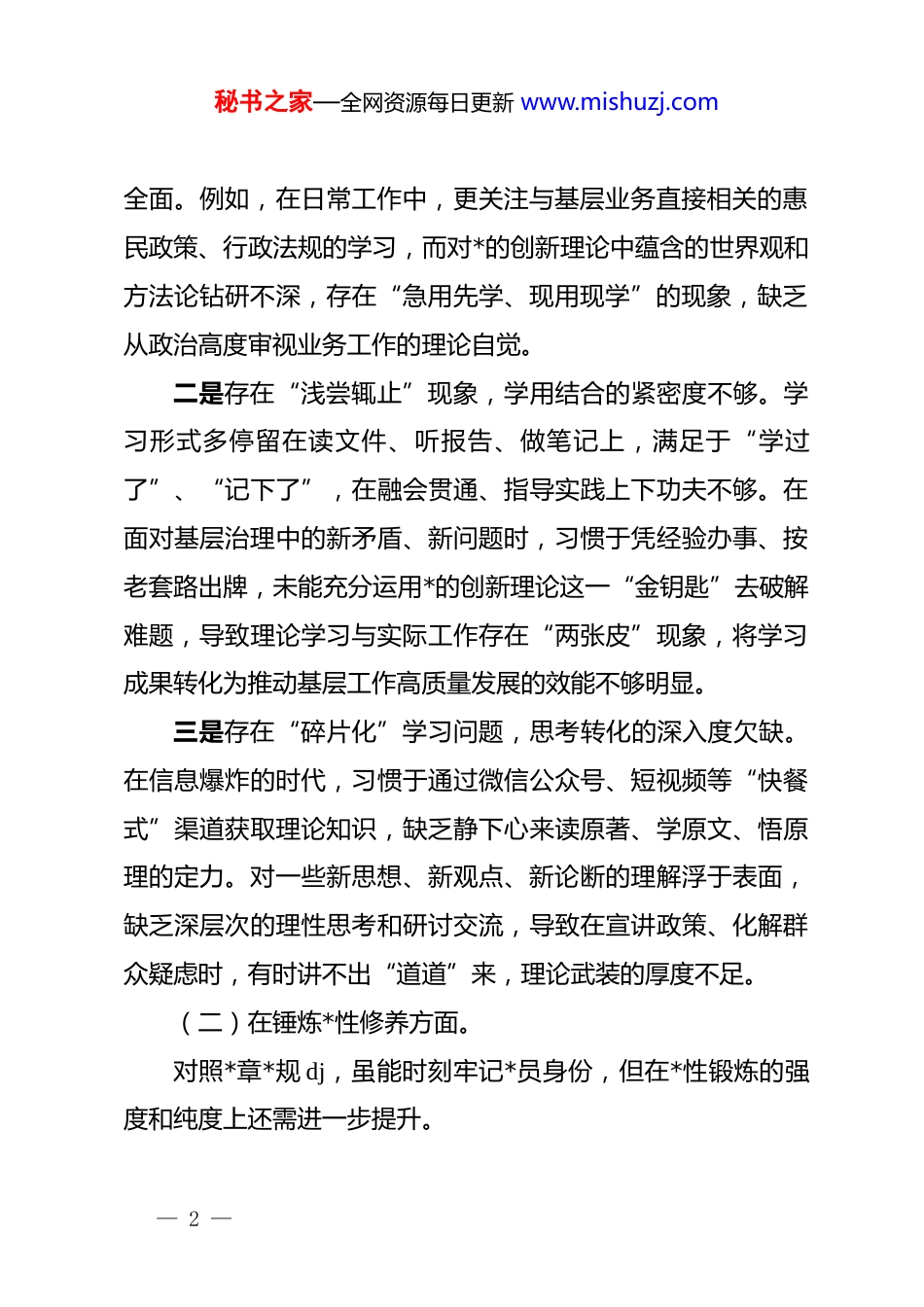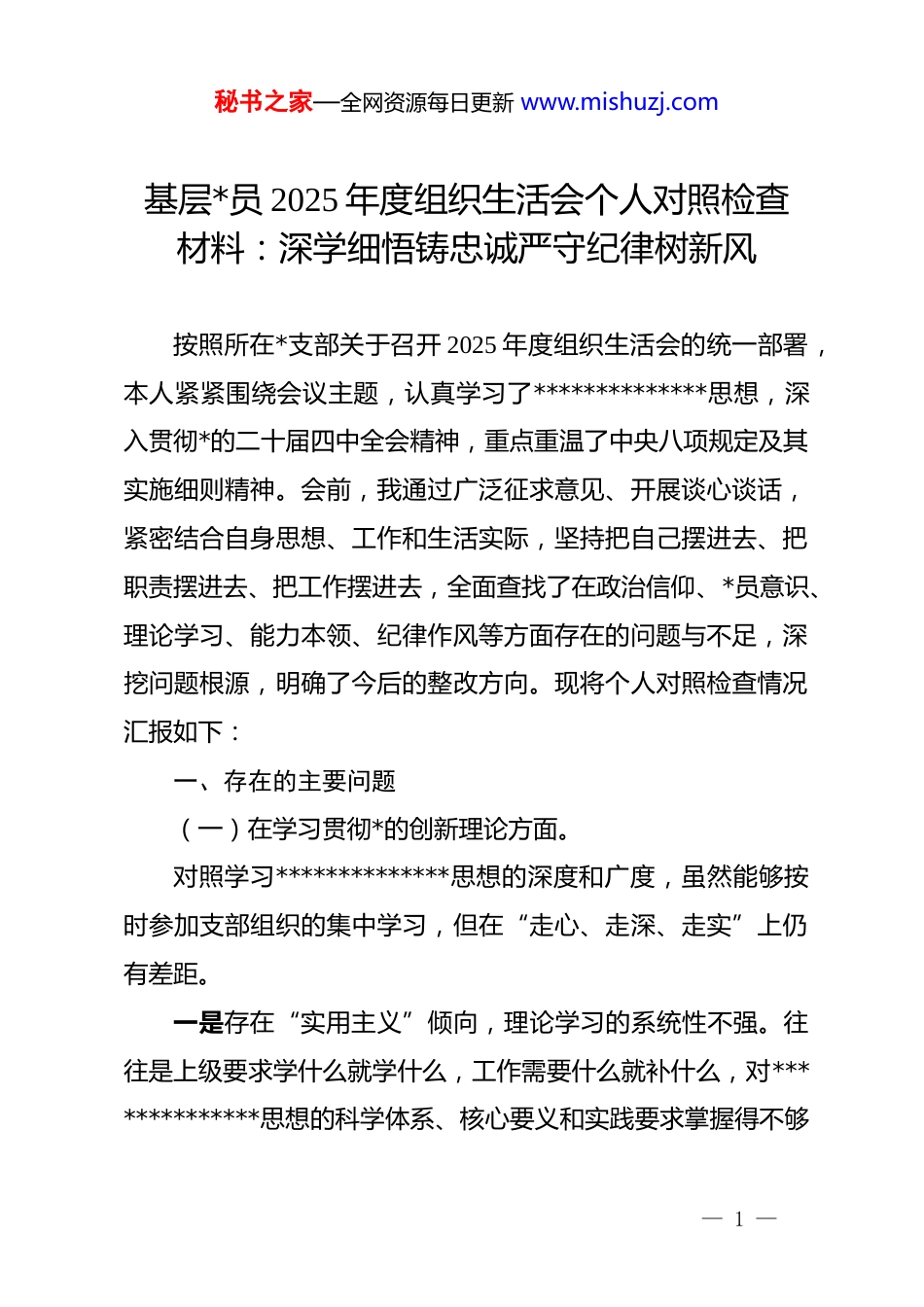 秘书之家—全网资源每日更新 www.mishuzj.com基层*员 2025 年度组织生活会个人对照检查材料:深学细悟铸忠诚严守纪律树新风按照所在*支部关于召开 2025 年度组织生活会的统一部署,本人紧紧围绕会议主题,认真学习了**************思想,深入贯彻*的二十届四中全会精神,重点重温了中央八项规定及其实施细则精神。会前,我通过广泛征求意见、开展谈心谈话,紧密结合自身思想、工作和生活实际,坚持把自己摆进去、把职责摆进去、把工作摆进去,全面查找了在政治信仰、*员意识、理论学习、能力本领、纪律作风等方面存在的问题与不足,深挖问题根源,明确了今后的整改方向。现将个人对照检查情况汇报如下:一、存在的主要问题(一)在学习贯彻*的创新理论方面。对照学习**************思想的深度和广度,虽然能够按时参加支部组织的集中学习,但在“走心、走深、走实”上仍有差距。一是存在“实用主义”倾向,理论学习的系统性不强。往往是上级要求学什么就学什么,工作需要什么就补什么,对**************思想的科学体系、核心要义和实践要求掌握得不够— 1 —秘书之家—全网资源每日更新 www.mishuzj.com全面。例如,在日常工作中,更关注与基层业务直接相关的惠民政策、行政法规的学习,而对*的创新理论中蕴含的世界观和方法论钻研不深,存在“急用先学、现用现学”的现象,缺乏从政治高度审视业务工作的理论自觉。二是存在“浅尝辄止”现象,学用结合的紧密度不够。学习形式多停留在读文件、听报告、做笔记上,满足于“学过了”、“记下了”,在融会贯通、指导实践上下功夫不够。在面对基层治理中的新矛盾、新问题时,习惯于凭经验办事、按老套路出牌,未能充分运用*的创新理论这一“金钥匙”去破解难题,导致理论学习与实际工作存在“两张皮”现象,将学习成果转化为推动基层工作高质量发展的效能不够明显。三是存在“碎片化”学习问题,思考转化的深入度欠缺。在信息爆炸的时代,习惯于通过微信公众号、短视频等“快餐式”渠道获取理论知识,缺乏静下心来读原著、学原文、悟原理的定力。对一些新思想、新观点、新论断的理解浮于表面,缺乏深层次的理性思考和研讨交流,导致在宣讲政策、化解群众疑虑时,有时讲不出“道道”来,理论武装的厚度不足。(二)在锤炼*性修养方面。对照*章*规 dj,虽能时刻牢记*员身份,但在*性锻炼的强度和纯度上还需进一步提升。— 2 —秘书之家—全网资源每日更新 www.mishuzj.com一是政治敏锐性不够强,在是非面前有时存在“老好人”思想。在日常工作和生活中,对社会上、网络上流传的一些关于*的错误言论和消极情绪,虽然能够做到自己不信不传,但缺乏挺身而出、坚决斗争的勇气和底气,有时抱有“多一事不如少一事”的心态,未能旗帜鲜明地进行反驳和纠正。在*内组织生活中,开展自我批评多、相互批评少,即使提意见也是“隔靴搔痒”,怕得罪人、怕伤和气,缺乏“红脸出汗”的辣味。二是大局观念不够牢,存在本位主义思想苗头。在执行上级决策部署时,有时过多考虑本辖区、本岗位的实际困难和利益,对全局性、长远性的工作任务执行不够坚决有力。例如,在配合开展跨部门协同工作时,偶尔存在推诿扯皮、甚至想“把球踢出去”的念头,缺乏“全镇一盘棋”的大局意识,未能完全做到局部利益无条件服从全局利益。三是理想信念的“总开关”拧得不够紧,存在一定的“躺平”心态。随着工龄的增长和基层工作压力的增大,偶尔会产生“船到码头车到站”的松劲情绪。对比革命先辈和先进典型,自己在吃苦耐劳、无私奉献的精神上有所退化,工作中有时满足于由“过得去”向“过得硬”的追求不足,缺乏那种为了*的事业不计得失、甘于奉献的崇高境界。(三)在联系服务群众方面。— 3 —秘书之家—全网资源每日更新 www.mishuzj.com对照全心全意为人民服务的宗旨,虽然心里装着群众,但在具体行动上,服务的温度和精度还有待提高。一是主动服务意识不强,存在“坐等上门”的机关作风。在日常窗口接待或驻村工作中,习惯于坐在办公室里等群众来办事,主动走出机关、走进农户家中听民声、察民情、解民忧的频次不够。对群众的急难愁盼问题,有时还要等...