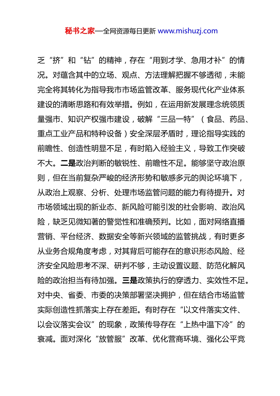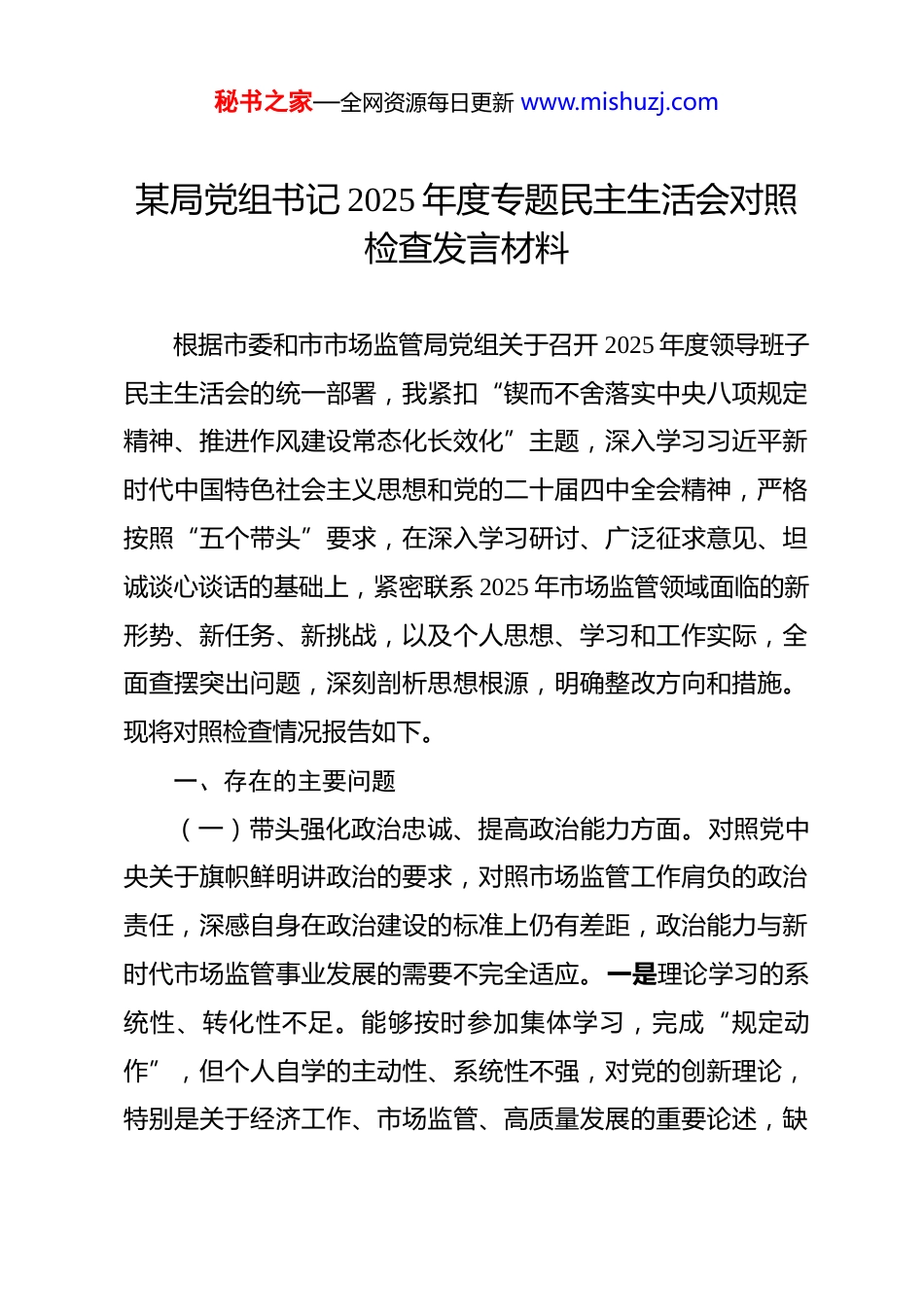 秘书之家—全网资源每日更新 www.mishuzj.com某局党组书记 2025 年度专题民主生活会对照检查发言材料 根据市委和市市场监管局党组关于召开 2025 年度领导班子民主生活会的统一部署,我紧扣“锲而不舍落实中央八项规定精神、推进作风建设常态化长效化”主题,深入学习习近平新时代中国特色社会主义思想和党的二十届四中全会精神,严格按照“五个带头”要求,在深入学习研讨、广泛征求意见、坦诚谈心谈话的基础上,紧密联系 2025 年市场监管领域面临的新形势、新任务、新挑战,以及个人思想、学习和工作实际,全面查摆突出问题,深刻剖析思想根源,明确整改方向和措施。现将对照检查情况报告如下。一、存在的主要问题(一)带头强化政治忠诚、提高政治能力方面。对照党中央关于旗帜鲜明讲政治的要求,对照市场监管工作肩负的政治责任,深感自身在政治建设的标准上仍有差距,政治能力与新时代市场监管事业发展的需要不完全适应。一是理论学习的系统性、转化性不足。能够按时参加集体学习,完成“规定动作”,但个人自学的主动性、系统性不强,对党的创新理论,特别是关于经济工作、市场监管、高质量发展的重要论述,缺秘书之家—全网资源每日更新 www.mishuzj.com乏“挤”和“钻”的精神,存在“用到才学、急用才补”的情况。对蕴含其中的立场、观点、方法理解把握不够透彻,未能完全将其转化为指导我市市场监管改革、服务现代化产业体系建设的清晰思路和有效举措。例如,在运用新发展理念统领质量强市、知识产权强市建设,破解“三品一特”(食品、药品、重点工业产品和特种设备)安全深层矛盾时,理论指导实践的前瞻性、创造性明显不足,有时陷入经验主义,导致工作突破不大。二是政治判断的敏锐性、前瞻性不足。能够坚守政治原则,但在当前复杂严峻的经济形势和敏感多元的舆论环境下,从政治上观察、分析、处理市场监管问题的能力有待提升。对市场领域出现的新业态、新风险可能引发的社会影响、政治风险,缺乏见微知著的警觉性和准确预判。比如,面对网络直播营销、平台经济、数据安全等新兴领域的监管挑战,有时更多从业务合规角度考虑,对其背后可能存在的意识形态风险、经济安全风险思考不深、研判不够,主动设置议题、防范化解风险的政治担当有待加强。三是政策执行的穿透力、实效性不足。对中央、省委、市委的决策部署坚决拥护,但在结合市场监管实际创造性抓落实上存在差距。有时存在“以文件落实文件、以会议落实会议”的现象,政策传导存在“上热中温下冷”的衰减。面对深化“放管服”改革、优化营商环境、强化公平竞秘书之家—全网资源每日更新 www.mishuzj.com争审查等硬任务,有时顾虑多、闯劲减,担心触碰既有利益格局,导致部分改革举措推进缓慢、效果打折扣。在推动商事制度改革红利直达基层、惠及企业“最后一公里”上,跟踪问效、闭环管理不够严格,企业和群众的获得感有待进一步增强。(二)带头固本培元、增强党性方面。对照党章党规,对照初心使命,深感在持续锤炼党性、永葆政治本色上仍需加压用力,理想信念的基础需进一步夯实。一是党性修养的自觉性、经常性不足。有时将党性锻炼视为“软指标”,认为抓好业务是“硬任务”,存在“业务忙冲淡党性修养”的现象。参加组织生活有时满足于人到、会到,在思想交锋、灵魂洗礼上投入不够。面对繁重的“三品一特”安全监管、重点领域专项整治等压力,有时会产生疲劳心态,锐意进取、攻坚克难的精神状态有所起伏,未能时刻以党员领导干部的高标准来激励斗志、校正偏差。对市场监管队伍中可能出现的“审批监管中的微腐败”“人情执法”等苗头性问题,从党性高度进行警示、反思的深度不够。二是理论联系实际的紧密度、实效性不足。在学习党的创新理论时,有时“学用脱节”,未能完全将学习成果内化为坚定的理想信念和强大的精神动力,外化为服务高质量发展、保障高品质生活的具体行动。在谋划工作时,从政治角度考量、用政治标尺衡量的意识不够强。例如,在推动标准、秘书之家—全网资源每日更新 www.mishuzj.com计量、认证认可、检验检测等市场监管基础体系建设服务先进制造业集群发展时,对其政治意义和战...