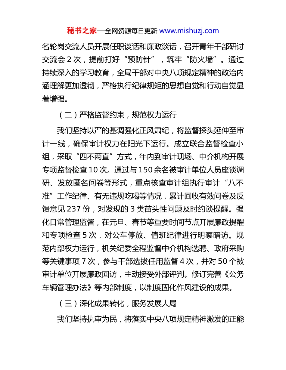 秘书之家—全网资源每日更新 www.mishuzj.com某市审计局领导班子 2025 年度民主生活会对照检查材料(五个带头)根据本次民主生活会统一部署和要求,局领导班子紧扣会议主题,在深入学习党的创新理论、广泛征求意见建议、坦诚开展谈心谈话的基础上,全面对照党的二十届四中全会精神和党中央关于作风建设的最新部署,对照党章党规党纪,对照初心使命,紧密联系审计工作实际,深入查摆突出问题,深刻剖析问题根源,明确整改方向与措施。现将对照检查情况报告如下:一、2025 年度深入贯彻中央八项规定精神情况及学习教育成效(一)强化学习教育,筑牢思想堤坝我们坚持将理论武装贯穿始终,把学习贯彻中央八项规定精神与落实党的二十届四中全会精神紧密结合,着力夯实拒腐防变的思想根基。局党组全年组织专题学习研讨 14 次,举办读书班 1 期,领导班子成员带头讲授专题党课,引导全局干部深刻认识作风建设的极端重要性。突出警示教育针对性,分层分类组织观看警示教育片 3 次,聚焦审计权力运行关键环节和“四风”问题新表现,深入剖析本系统反面典型案例。紧盯“关键少数”和重点岗位,年内对 50 名新任职干部、11秘书之家—全网资源每日更新 www.mishuzj.com名轮岗交流人员开展任职谈话和廉政谈话,召开青年干部研讨交流会 2 次,提前打好“预防针”,筑牢“防火墙”。通过持续深入的学习教育,全局干部对中央八项规定精神的政治内涵理解更加透彻,严格执行纪律规矩的思想自觉和行动自觉显著增强。(二)严格监督约束,规范权力运行我们坚持以严的基调强化正风肃纪,将监督探头延伸至审计一线,确保审计权力在阳光下运行。成立联合监督检查小组,采取“四不两直”方式,年内到审计现场、中介机构开展专项监督检查 10 次。通过与 150 余名被审计单位人员座谈调研、发放匿名问卷等形式,重点核查审计组执行审计“八不准”工作纪律、有无违规吃喝等情况,累计回收有效问卷及反馈意见 237 份,对发现的 3 类苗头性问题及时约谈提醒。强化日常管理监督,在元旦、春节等重要时间节点开展廉政提醒和专项检查 5 次,对公车停放、值班纪律进行明察暗访。规范内部权力运行,机关纪委全程监督中介机构选聘、政府采购等关键事项 7 次,参与干部选拔任用监督 4 次,并对 50 个被审计单位开展廉政回访,主动接受外部评判。修订完善《公务车辆管理办法》等内部制度,以制度固化作风建设的成果。(三)深化成果转化,服务发展大局我们坚持执审为民,将落实中央八项规定精神激发的正能秘书之家—全网资源每日更新 www.mishuzj.com量,转化为依法忠诚履行审计监督职责的实际效能。2025年,我们科学制定并实施年度审计项目计划,紧紧围绕市委、市政府中心工作,安排了涵盖政策跟踪、财政、民生等 6 个方面的 32 项审计任务,涉及具体项目 63 个。截至年底,已完成开发区高质量发展、“两重”“两新”政策落实等 46 个项目的现场审计。坚持审计力量下沉,联合市政府督查室组成16 个核查组,对年度 15 件市办实事进行全覆盖跟踪核查,重点关注资金效益与项目实效,推动民生政策落地生根。在服务反腐治乱中积极作为,年内共向市纪委监委移送问题线索26 件,围绕群众身边不正之风和腐败问题开展专项审计,有力维护了群众利益。全年上报的 29 篇审计专报获市委市政府领导批示 27 篇次,审计建设性作用得到有效发挥。二、对照检查存在的突出问题(一)在带头强化政治忠诚,提高政治能力方面1.政治判断的敏锐性与前瞻性尚有不足。面对复杂严峻的经济形势和“十五五”开局的新任务,领导班子运用政治眼光观察和分析经济社会运行问题的能力有待加强。例如,在2025 年开展的政府债务审计中,虽揭示了部分区县债务率偏高的问题,但对债务结构背后的区域性金融风险联动性、以及对全市中长期财政可持续性的潜在影响,缺乏足够深度的预警研判,审计专报的“治未病”功能未能充分发挥。全年形成的秘书之家—全网资源每日更新 www.mishuzj.com风险预警类专报仅占专报总数的 15%,与审计署关于强化风险预警的要求存在差距。再如,在贯彻落实党的二十届四中全会精神,...