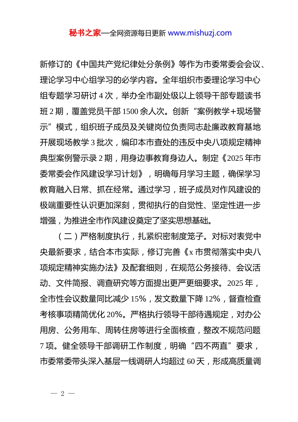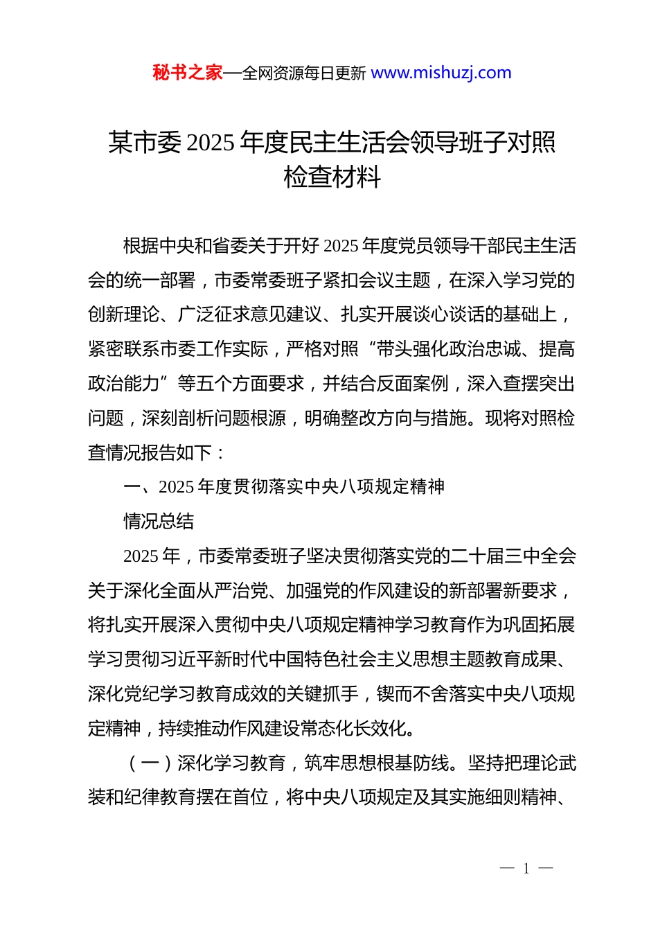 秘书之家—全网资源每日更新 www.mishuzj.com某市委 2025 年度民主生活会领导班子对照检查材料根据中央和省委关于开好 2025 年度党员领导干部民主生活会的统一部署,市委常委班子紧扣会议主题,在深入学习党的创新理论、广泛征求意见建议、扎实开展谈心谈话的基础上,紧密联系市委工作实际,严格对照“带头强化政治忠诚、提高政治能力”等五个方面要求,并结合反面案例,深入查摆突出问题,深刻剖析问题根源,明确整改方向与措施。现将对照检查情况报告如下:一、2025 年度贯彻落实中央八项规定精神情况总结2025 年,市委常委班子坚决贯彻落实党的二十届三中全会关于深化全面从严治党、加强党的作风建设的新部署新要求,将扎实开展深入贯彻中央八项规定精神学习教育作为巩固拓展学习贯彻习近平新时代中国特色社会主义思想主题教育成果、深化党纪学习教育成效的关键抓手,锲而不舍落实中央八项规定精神,持续推动作风建设常态化长效化。(一)深化学习教育,筑牢思想根基防线。坚持把理论武装和纪律教育摆在首位,将中央八项规定及其实施细则精神、— 1 —秘书之家—全网资源每日更新 www.mishuzj.com新修订的《中国共产党纪律处分条例》等作为市委常委会会议、理论学习中心组学习的必学内容。全年组织市委理论学习中心组专题学习研讨 4 次,举办全市副处级以上领导干部专题读书班 2 期,覆盖党员干部 1500 余人次。创新“案例教学+现场警示”模式,组织班子成员及关键岗位负责同志赴廉政教育基地开展现场教学 3 批次,编印本市查处的违反中央八项规定精神典型案例警示录 2 期,用身边事教育身边人。制定《2025 年市委常委会作风建设学习计划》,明确每月学习主题,确保学习教育融入日常、抓在经常。通过学习,班子成员对作风建设的极端重要性认识更加深刻,贯彻执行的自觉性、坚定性进一步增强,为推进全市作风建设奠定了坚实思想基础。(二)严格制度执行,扎紧织密制度笼子。对标对表党中央最新要求,结合本市实际,修订完善《x 市贯彻落实中央八项规定精神实施办法》及配套细则,在规范公务接待、会议活动、文件简报、调查研究等方面提出更严更细要求。2025 年,全市性会议数量同比减少 15%,发文数量下降 12%,督查检查考核事项精简优化 20%。严格执行领导干部待遇规定,对办公用房、公务用车、周转住房等进行全面核查,整改不规范问题7 项。健全领导干部调研工作制度,明确“四不两直”要求,市委常委带头深入基层一线调研人均超过 60 天,形成高质量调— 2 —秘书之家—全网资源每日更新 www.mishuzj.com研报告 25 篇,推动解决了一批发展难题和民生诉求。强化财政预算刚性约束,“三公”经费预算连续三年压减,2025 年同比下降 8.5%,切实把制度优势转化为治理效能。(三)强化监督执纪,保持从严高压态势。市委切实履行主体责任,常委会定期听取市纪委监委关于作风建设监督情况的汇报,分析研判形势,部署推进重点任务。市纪委监委聚焦“关键少数”和重要节点,紧盯隐形变异“四风”问题,加大明察暗访和通报曝光力度。2025 年,全市共查处违反中央八项规定精神问题 87 起,处理党员干部 124 人,其中党纪政务处分89 人,市管干部 5 人,公开通报典型案例 12 批 28 起。深化运用“四种形态”,特别是在第一种形态上下更大功夫,针对苗头性、倾向性问题开展谈话提醒、批评教育 430 人次。推动各类监督贯通协调,将作风建设情况纳入市委巡察、政治生态分析、领导班子考核的重要内容,对发现问题较多的 3 个单位党组织负责人进行约谈,释放了越往后执纪越严的强烈信号,有效遏制了“四风”问题反弹回潮。二、存在的突出问题常委班子对照 5 个方面要求,深入查摆,主要存在以下问题:(一)在带头强化政治忠诚,提高政治能力方面— 3 —秘书之家—全网资源每日更新 www.mishuzj.com1.理论武装向实践转化的穿透力有待增强。对党的创新理论,特别是其中蕴含的领导方法、思想方法、工作方法,学习领悟有时停留在概念层面,与市情实际、分管领域工作结合不够紧密,运用其立场观点方法破解复杂矛盾、驾驭风险局面的能力尚...
