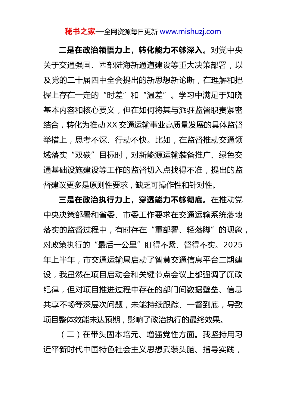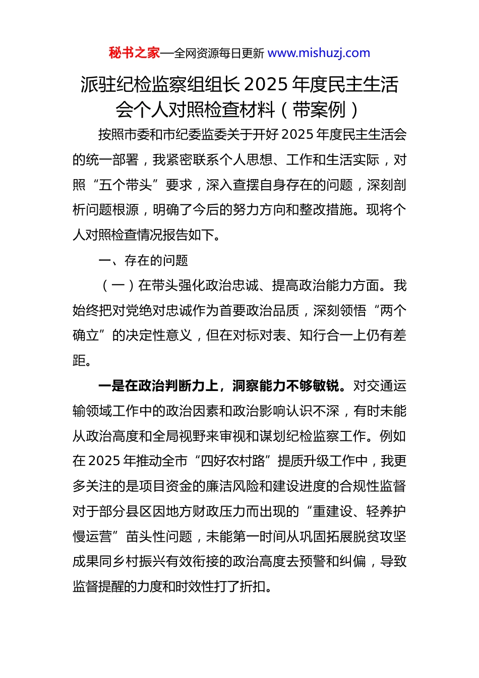 秘书之家—全网资源每日更新 www.mishuzj.com派驻纪检监察组组长 2025 年度民主生活会个人对照检查材料(带案例)按照市委和市纪委监委关于开好 2025 年度民主生活会的统一部署,我紧密联系个人思想、工作和生活实际,对照“五个带头”要求,深入查摆自身存在的问题,深刻剖析问题根源,明确了今后的努力方向和整改措施。现将个人对照检查情况报告如下。一、存在的问题(一)在带头强化政治忠诚、提高政治能力方面。我始终把对党绝对忠诚作为首要政治品质,深刻领悟“两个确立”的决定性意义,但在对标对表、知行合一上仍有差距。一是在政治判断力上,洞察能力不够敏锐。对交通运输领域工作中的政治因素和政治影响认识不深,有时未能从政治高度和全局视野来审视和谋划纪检监察工作。例如在 2025 年推动全市“四好农村路”提质升级工作中,我更多关注的是项目资金的廉洁风险和建设进度的合规性监督对于部分县区因地方财政压力而出现的“重建设、轻养护慢运营”苗头性问题,未能第一时间从巩固拓展脱贫攻坚成果同乡村振兴有效衔接的政治高度去预警和纠偏,导致监督提醒的力度和时效性打了折扣。秘书之家—全网资源每日更新 www.mishuzj.com二是在政治领悟力上,转化能力不够深入。对党中央关于交通强国、西部陆海新通道建设等重大决策部署,以及党的二十届四中全会提出的新思想新论断,在理解和把握上存在一定的“时差”和“温差”。学习中满足于知晓基本内容和核心要义,但在如何将其与派驻监督职责紧密结合,转化为推动 XX 交通运输事业高质量发展的具体监督举措上,思考不深、行动不快。比如,在监督推动交通领域落实“双碳”目标时,对新能源运输装备推广、绿色交通基础设施建设等工作的监督切入点找得不准,提出的监督建议更多是原则性要求,缺乏可操作性和针对性。三是在政治执行力上,穿透能力不够彻底。在推动党中央决策部署和省委、市委工作要求在交通运输系统落地落实的监督过程中,有时存在“重部署、轻落脚”的现象,对政策执行的“最后一公里”盯得不紧、督得不实。2025年上半年,市交通运输局启动了智慧交通信息平台二期建设,我虽然在项目启动会和关键节点会议上都强调了廉政纪律,但对项目推进过程中存在的部门间数据壁垒、信息共享不畅等深层次问题,未能持续跟踪、一督到底,导致项目整体效能未达预期,影响了政治执行的最终效果。(二)在带头固本培元、增强党性方面。我坚持用习近平新时代中国特色社会主义思想武装头脑、指导实践,秘书之家—全网资源每日更新 www.mishuzj.com但对照共产党人精神追求,党性修养仍需持续锤炼。一是理论武装的系统性不好。学习习近平新时代中国特色社会主义思想存在碎片化、零散化现象,满足于“干什么学什么、缺什么补什么”,缺乏全面系统、融会贯通的深入钻研。对蕴含其中的世界观、方法论掌握不牢,运用党的创新理论解决交通运输领域监督执纪难题的能力不足。例如,在处理一起涉及交通工程变更的信访举报时,虽然依规依纪进行了核查,但未能运用系统观念深入分析工程变更背后可能存在的制度漏洞和管理短板,导致监督停留在个案处理上,未能推动系统性的以案促改、以案促治。二是理想信念的坚定性不好。在长期面对交通领域腐败问题和不正之风的复杂斗争中,有时会产生一丝懈怠情绪和“歇歇脚”的想法,认为经过持续高压反腐,存量问题已基本肃清,可以稍微松口气。这种思想上的松懈,反映出对党风廉政建设和反腐败斗争的长期性、复杂性、艰巨性认识不足,革命意志和斗争精神有所衰减。在 2025 年的一次内部工作会议上,我曾提到“当前交通系统的政治生态已大为好转”,这种表述虽然符合事实,但也无形中流露出了盲目乐观的情绪。三是党性锻炼的主动性不好。参加组织生活多是以秘书之家—全网资源每日更新 www.mishuzj.com“监督者”的身份出现,以普通党员身份把自己摆进去、接受党内监督的自觉性不强。在参加局机关党支部组织生活会时,听取他人发言多,主动开展批评与自我批评少,对一些同志在发言中存在的“闯关”思想和“过关”心态未能及时严肃地予以指正。这说明我在党内政治生活的“熔炉”中淬炼党性的主...