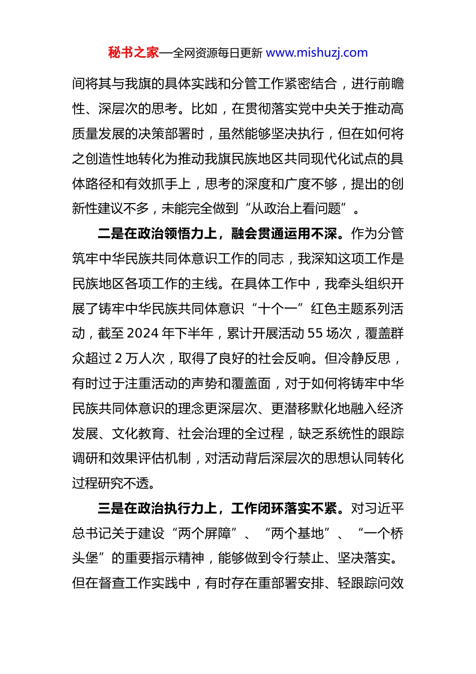 秘书之家—全网资源每日更新 www.mishuzj.com旗委办副主任 2025 年度民主生活会个人对照检查材料(带案例)根据旗委关于召开 2025 年度民主生活会的统一安排部署,本人在会前系统深入学习了习近平新时代中国特色社会主义思想,全面学习领会了党的二十届三中、四中全会精神和习近平总书记对内蒙古系列重要讲话重要指示精神并紧扣本次民主生活会主题,积极参加了旗委办公室组织的集中学习研讨。同时,本着对组织、对同志、对自己高度负责的态度,我与其余班子成员、分管科室负责同志以及基层干部群众代表广泛开展了谈心谈话,真诚征求意见建议,并在此基础上,对照“五个带头”的具体要求,深入查摆自身存在的问题,深刻剖析问题根源,明确了今后的努力方向和整改措施。现将个人对照检查情况报告如下。一、存在的问题(一)在带头强化政治忠诚、提高政治能力方面本人能够深刻领悟“两个确立”的决定性意义,在思想上政治上行动上始终同以习近平同志为核心的党中央保持高度一致,但在对标对表、从严从实的要求下,仍存在一些差距和不足。一是在政治判断力上,洞察力敏锐性不强。对一些重大政策和理论的理解,有时停留在宏观层面,未能第一时秘书之家—全网资源每日更新 www.mishuzj.com间将其与我旗的具体实践和分管工作紧密结合,进行前瞻性、深层次的思考。比如,在贯彻落实党中央关于推动高质量发展的决策部署时,虽然能够坚决执行,但在如何将之创造性地转化为推动我旗民族地区共同现代化试点的具体路径和有效抓手上,思考的深度和广度不够,提出的创新性建议不多,未能完全做到“从政治上看问题”。二是在政治领悟力上,融会贯通运用不深。作为分管筑牢中华民族共同体意识工作的同志,我深知这项工作是民族地区各项工作的主线。在具体工作中,我牵头组织开展了铸牢中华民族共同体意识“十个一”红色主题系列活动,截至 2024 年下半年,累计开展活动 55 场次,覆盖群众超过 2 万人次,取得了良好的社会反响。但冷静反思,有时过于注重活动的声势和覆盖面,对于如何将铸牢中华民族共同体意识的理念更深层次、更潜移默化地融入经济发展、文化教育、社会治理的全过程,缺乏系统性的跟踪调研和效果评估机制,对活动背后深层次的思想认同转化过程研究不透。三是在政治执行力上,工作闭环落实不紧。对习近平总书记关于建设“两个屏障”、“两个基地”、“一个桥头堡”的重要指示精神,能够做到令行禁止、坚决落实。但在督查工作实践中,有时存在重部署安排、轻跟踪问效秘书之家—全网资源每日更新 www.mishuzj.com的现象。例如,在 2025 年上半年对某项重点工作的专项督查中,初期制定的督查方案非常详尽,但在中后期,由于多项任务交叉,未能对个别进展缓慢的单位进行足够频次的“回头看”,导致该单位的问题未能在第一时间得到彻底解决,影响了整体工作进度,反映出我在狠抓落实、一抓到底的韧劲上还有所欠缺。(二)在带头固本培元、增强党性方面我始终坚持用习近平新时代中国特色社会主义思想武装头脑,但对照更高标准,在党性修养的自觉性和彻底性上仍有不足。一是在理论学习系统性上,全面领悟有差距。对习近平新时代中国特色社会主义思想的学习,存在一定的“实用主义”倾向,与分管工作密切相关的内容学得比较多、比较深,而对于其中蕴含的马克思主义立场、观点、方法,特别是关于世界观、人生观、价值观“总开关”的系统论述,主动钻研、深入思考的功夫下得不够。学习方式上,参加集中学习多,静下心来读原著、学原文、悟原理的时间相对较少,导致理论武装的系统性和全面性不强。二是在理想信念坚定性上,精神补钙有差距。能够坚守共产党人的精神追求,但在面对当前复杂多变的内外环境和意识形态领域的激烈斗争时,对一些社会上的错误思秘书之家—全网资源每日更新 www.mishuzj.com潮和模糊认识,虽然能做到不认同、不传播,但主动站出来进行有力批驳和坚决斗争的意识和行动不够。这反映出自身在运用党的创新理论辨别政治是非、保持政治定力方面的能力仍需锤炼,理想信念的根基扎得还不够深。三是在党规党纪敬畏性上,知行合一有差距。能够认真学习党章党规党...