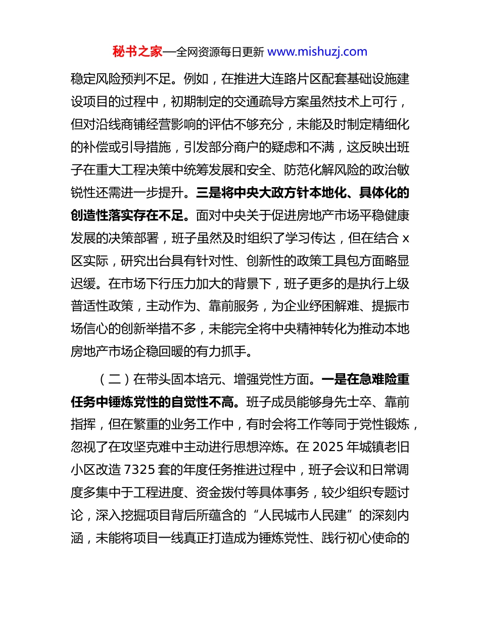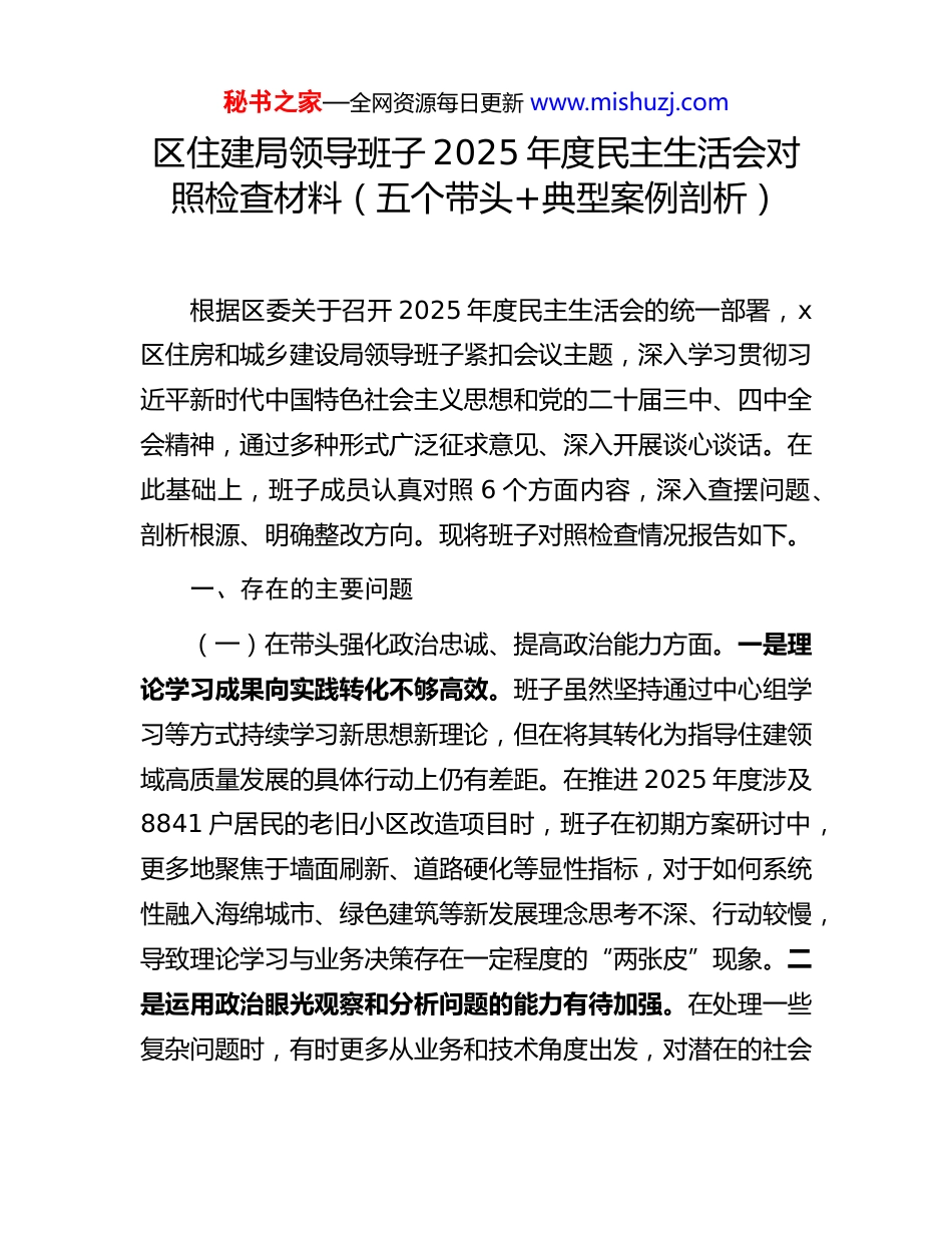 秘书之家—全网资源每日更新 www.mishuzj.com区住建局领导班子 2025 年度民主生活会对照检查材料(五个带头+典型案例剖析)根据区委关于召开 2025 年度民主生活会的统一部署,x区住房和城乡建设局领导班子紧扣会议主题,深入学习贯彻习近平新时代中国特色社会主义思想和党的二十届三中、四中全会精神,通过多种形式广泛征求意见、深入开展谈心谈话。在此基础上,班子成员认真对照 6 个方面内容,深入查摆问题、剖析根源、明确整改方向。现将班子对照检查情况报告如下。一、存在的主要问题(一)在带头强化政治忠诚、提高政治能力方面。一是理论学习成果向实践转化不够高效。班子虽然坚持通过中心组学习等方式持续学习新思想新理论,但在将其转化为指导住建领域高质量发展的具体行动上仍有差距。在推进 2025 年度涉及8841 户居民的老旧小区改造项目时,班子在初期方案研讨中,更多地聚焦于墙面刷新、道路硬化等显性指标,对于如何系统性融入海绵城市、绿色建筑等新发展理念思考不深、行动较慢,导致理论学习与业务决策存在一定程度的“两张皮”现象。二是运用政治眼光观察和分析问题的能力有待加强。在处理一些复杂问题时,有时更多从业务和技术角度出发,对潜在的社会秘书之家—全网资源每日更新 www.mishuzj.com稳定风险预判不足。例如,在推进大连路片区配套基础设施建设项目的过程中,初期制定的交通疏导方案虽然技术上可行,但对沿线商铺经营影响的评估不够充分,未能及时制定精细化的补偿或引导措施,引发部分商户的疑虑和不满,这反映出班子在重大工程决策中统筹发展和安全、防范化解风险的政治敏锐性还需进一步提升。三是将中央大政方针本地化、具体化的创造性落实存在不足。面对中央关于促进房地产市场平稳健康发展的决策部署,班子虽然及时组织了学习传达,但在结合 x区实际,研究出台具有针对性、创新性的政策工具包方面略显迟缓。在市场下行压力加大的背景下,班子更多的是执行上级普适性政策,主动作为、靠前服务,为企业纾困解难、提振市场信心的创新举措不多,未能完全将中央精神转化为推动本地房地产市场企稳回暖的有力抓手。(二)在带头固本培元、增强党性方面。一是在急难险重任务中锤炼党性的自觉性不高。班子成员能够身先士卒、靠前指挥,但在繁重的业务工作中,有时会将工作等同于党性锻炼,忽视了在攻坚克难中主动进行思想淬炼。在 2025 年城镇老旧小区改造 7325 套的年度任务推进过程中,班子会议和日常调度多集中于工程进度、资金拨付等具体事务,较少组织专题讨论,深入挖掘项目背后所蕴含的“人民城市人民建”的深刻内涵,未能将项目一线真正打造成为锤炼党性、践行初心使命的秘书之家—全网资源每日更新 www.mishuzj.com“大熔炉”。二是开展批评与自我批评的“辣味”尚显不足。在民主生活会或组织生活会上,班子成员间的相互批评有时还停留在“提希望”“提建议”的层面,存在以工作建议代替思想交锋的现象。在复盘一些工程质量监管不到位的问题时,批评意见往往点到为止,未能深挖背后是否存在“老好人”思想或是不愿得罪人的心态,自我批评也偶有避重就轻、对深层次思想问题触及不深的情况。三是党性原则在具体决策中的“压舱石”作用发挥不充分。面对一些两难抉择时,有时会不自觉地以实用主义代替党性原则。在一次为确保老旧小区加装 36台电梯的年度任务按时完成的供应商选择中,班子曾倾向于一家报价较低、承诺工期最短但过往社区协调经验相对欠缺的企业。这种重效率轻群众工作的思维倾向,反映出在具体决策中,以人民为中心的根本立场和党性原则的衡量标尺树得还不够牢固。(三)在带头敬畏人民、敬畏组织、敬畏法纪方面。一是“四下基层”制度落实得不够深入。虽然班子成员经常下到项目工地和社区,但有时存在“被安排”调研的现象,未能完全做到“身入”更“心入”。在部分老旧小区改造项目启动前的意见征询环节,虽然召开了居民代表会,但会议议程偏向于政策解读和方案通报,对居民提出的施工噪音、建筑垃圾清运等个性化、细节化问题未能当场给予充分回应和吸纳,导致后续秘书之家—全网资源每日更新 www.mishuzj.com施工...