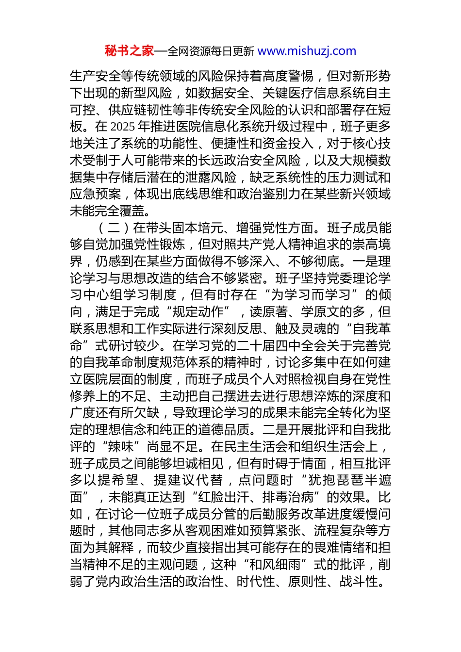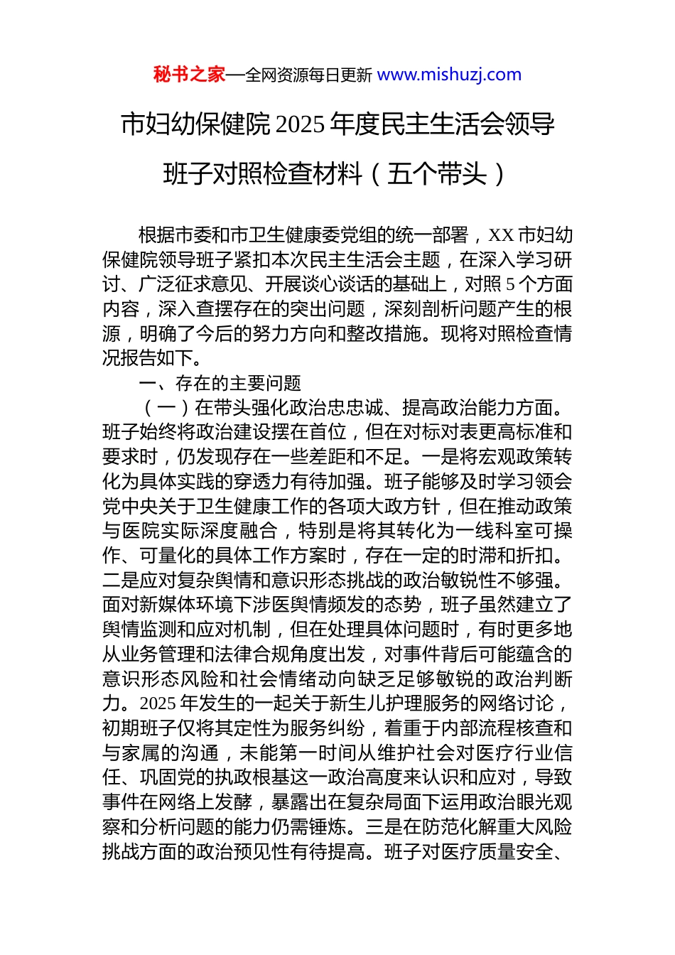 秘书之家—全网资源每日更新 www.mishuzj.com市妇幼保健院 2025 年度民主生活会领导班子对照检查材料(五个带头)根据市委和市卫生健康委党组的统一部署,XX 市妇幼保健院领导班子紧扣本次民主生活会主题,在深入学习研讨、广泛征求意见、开展谈心谈话的基础上,对照 5 个方面内容,深入查摆存在的突出问题,深刻剖析问题产生的根源,明确了今后的努力方向和整改措施。现将对照检查情况报告如下。一、存在的主要问题(一)在带头强化政治忠忠诚、提高政治能力方面。班子始终将政治建设摆在首位,但在对标对表更高标准和要求时,仍发现存在一些差距和不足。一是将宏观政策转化为具体实践的穿透力有待加强。班子能够及时学习领会党中央关于卫生健康工作的各项大政方针,但在推动政策与医院实际深度融合,特别是将其转化为一线科室可操作、可量化的具体工作方案时,存在一定的时滞和折扣。二是应对复杂舆情和意识形态挑战的政治敏锐性不够强。面对新媒体环境下涉医舆情频发的态势,班子虽然建立了舆情监测和应对机制,但在处理具体问题时,有时更多地从业务管理和法律合规角度出发,对事件背后可能蕴含的意识形态风险和社会情绪动向缺乏足够敏锐的政治判断力。2025 年发生的一起关于新生儿护理服务的网络讨论,初期班子仅将其定性为服务纠纷,着重于内部流程核查和与家属的沟通,未能第一时间从维护社会对医疗行业信任、巩固党的执政根基这一政治高度来认识和应对,导致事件在网络上发酵,暴露出在复杂局面下运用政治眼光观察和分析问题的能力仍需锤炼。三是在防范化解重大风险挑战方面的政治预见性有待提高。班子对医疗质量安全、秘书之家—全网资源每日更新 www.mishuzj.com生产安全等传统领域的风险保持着高度警惕,但对新形势下出现的新型风险,如数据安全、关键医疗信息系统自主可控、供应链韧性等非传统安全风险的认识和部署存在短板。在 2025 年推进医院信息化系统升级过程中,班子更多地关注了系统的功能性、便捷性和资金投入,对于核心技术受制于人可能带来的长远政治安全风险,以及大规模数据集中存储后潜在的泄露风险,缺乏系统性的压力测试和应急预案,体现出底线思维和政治鉴别力在某些新兴领域未能完全覆盖。(二)在带头固本培元、增强党性方面。班子成员能够自觉加强党性锻炼,但对照共产党人精神追求的崇高境界,仍感到在某些方面做得不够深入、不够彻底。一是理论学习与思想改造的结合不够紧密。班子坚持党委理论学习中心组学习制度,但有时存在“为学习而学习”的倾向,满足于完成“规定动作”,读原著、学原文的多,但联系思想和工作实际进行深刻反思、触及灵魂的“自我革命”式研讨较少。在学习党的二十届四中全会关于完善党的自我革命制度规范体系的精神时,讨论多集中在如何建立医院层面的制度,而班子成员个人对照检视自身在党性修养上的不足、主动把自己摆进去进行思想淬炼的深度和广度还有所欠缺,导致理论学习的成果未能完全转化为坚定的理想信念和纯正的道德品质。二是开展批评和自我批评的“辣味”尚显不足。在民主生活会和组织生活会上,班子成员之间能够坦诚相见,但有时碍于情面,相互批评多以提希望、提建议代替,点问题时“犹抱琵琶半遮面”,未能真正达到“红脸出汗、排毒治病”的效果。比如,在讨论一位班子成员分管的后勤服务改革进度缓慢问题时,其他同志多从客观困难如预算紧张、流程复杂等方面为其解释,而较少直接指出其可能存在的畏难情绪和担当精神不足的主观问题,这种“和风细雨”式的批评,削弱了党内政治生活的政治性、时代性、原则性、战斗性。秘书之家—全网资源每日更新 www.mishuzj.com三是党性原则在日常工作中的标尺作用未能时时彰显。在处理一些日常管理事务时,班子成员有时会不自觉地用实用主义代替党性原则。例如,在干部选拔任用酝酿阶段,有时会过多考虑业务能力的匹配度和人际关系的平衡,而对于干部的政治表现、廉洁自律等方面的考察虽然程序上做到位,但在内心深处对其权重和决定性作用的认识还不够深刻。这种细微之处的偏差,说明将党性修养内化于心、外化于行的自觉性仍有待进一步提升,未能始终如一地用...