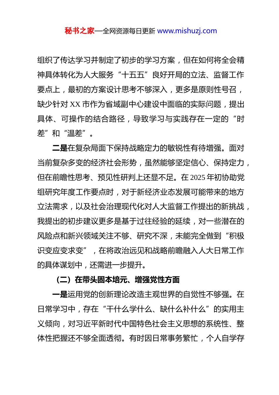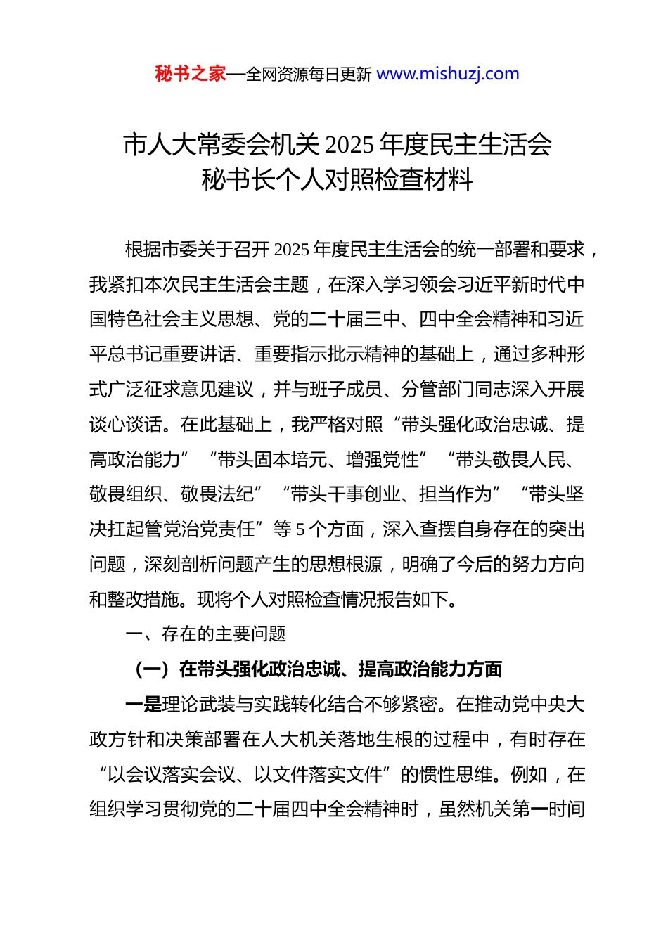 秘书之家—全网资源每日更新 www.mishuzj.com市人大常委会机关 2025 年度民主生活会秘书长个人对照检查材料根据市委关于召开 2025 年度民主生活会的统一部署和要求,我紧扣本次民主生活会主题,在深入学习领会习近平新时代中国特色社会主义思想、党的二十届三中、四中全会精神和习近平总书记重要讲话、重要指示批示精神的基础上,通过多种形式广泛征求意见建议,并与班子成员、分管部门同志深入开展谈心谈话。在此基础上,我严格对照“带头强化政治忠诚、提高政治能力”“带头固本培元、增强党性”“带头敬畏人民、敬畏组织、敬畏法纪”“带头干事创业、担当作为”“带头坚决扛起管党治党责任”等 5 个方面,深入查摆自身存在的突出问题,深刻剖析问题产生的思想根源,明确了今后的努力方向和整改措施。现将个人对照检查情况报告如下。一、存在的主要问题(一)在带头强化政治忠诚、提高政治能力方面一是理论武装与实践转化结合不够紧密。在推动党中央大政方针和决策部署在人大机关落地生根的过程中,有时存在“以会议落实会议、以文件落实文件”的惯性思维。例如,在组织学习贯彻党的二十届四中全会精神时,虽然机关第一时间秘书之家—全网资源每日更新 www.mishuzj.com组织了传达学习并制定了初步的学习方案,但在如何将全会精神具体转化为人大服务“十五五”良好开局的立法、监督工作要点上,最初的方案设计思考不够深入,更多是原则性号召,缺少针对 XX 市作为省域副中心建设中面临的实际问题,提出具体、可操作的结合路径,导致学习与实践存在一定的“时差”和“温差”。二是在复杂局面下保持战略定力的敏锐性有待增强。面对当前复杂多变的经济社会形势,虽然能够坚定信心、保持定力,但在前瞻性思考、预见性研判上还显不足。在 2025 年初协助党组研究年度工作要点时,对于新经济业态发展可能带来的地方立法需求,以及社会治理现代化对人大监督工作提出的新挑战,我提出的初步建议更多是基于过往经验的延续,对一些潜在的风险点和新兴领域关注不够、研究不深,未能完全做到“积极识变应变求变”,在将政治远见和战略前瞻融入人大日常工作的具体谋划中,还需进一步提升。(二)在带头固本培元、增强党性方面一是运用党的创新理论改造主观世界的自觉性不够强。在日常学习中,存在“干什么学什么、缺什么补什么”的实用主义倾向,对习近平新时代中国特色社会主义思想的系统性、整体性把握还不够全面透彻。有时因日常事务繁忙,个人自学存秘书之家—全网资源每日更新 www.mishuzj.com在碎片化现象,在常委会会议、主任会议等工作高度饱和期间,原定的个人理论学习计划会被动推迟或精简,用参加集体学习替代个人深度钻研,导致对一些重要论述的理解停留在“知其然”的层面,离“知其所以然”还有差距,用党的创新理论持续“补钙壮骨”、解决世界观人生观价值观“总开关”问题的韧劲和恒心有所减弱。二是党性锤炼融入日常工作生活的标准不够高。虽然能够坚守共产党人的精神追求,但在将党性原则内化为行为习惯、外化为工作标准上还存在不足。例如,在机关内部管理中,有时对一些同志出现的“差不多就行”的懈怠思想,更多是口头提醒和工作要求,缺少从党性高度进行深入的批评教育,没有真正做到“红脸出汗、排毒治病”。在处理一些程序性、事务性工作时,偶尔会不自觉地把工作标准等同于“完成任务”,而忽视了每一项工作背后都蕴含着对党忠诚、为民服务的党性要求。三是传承红色基因、赓续革命传统的力度不够大。XX 市是 XX 会议的召开地,拥有宝贵的红色资源。作为在 XX 工作的党员领导干部,虽然经常参加各类红色教育活动,但在如何将 XX 会议精神更深层次地融入人大机关的文化建设和干部队伍建设中,思考和行动还不够系统。例如,在筹划机关青年干秘书之家—全网资源每日更新 www.mishuzj.com部理论学习小组活动时,虽然也安排了红色基地的现场教学,但在后续的研讨和成果转化上,未能有效引导青年干部从革命传统中深刻汲取自我革命、敢于斗争的智慧和力量,红色教育的实效性有待进一步提升。(三)在带头敬畏人民、敬畏组织、敬畏法纪方面一是践行新时代...