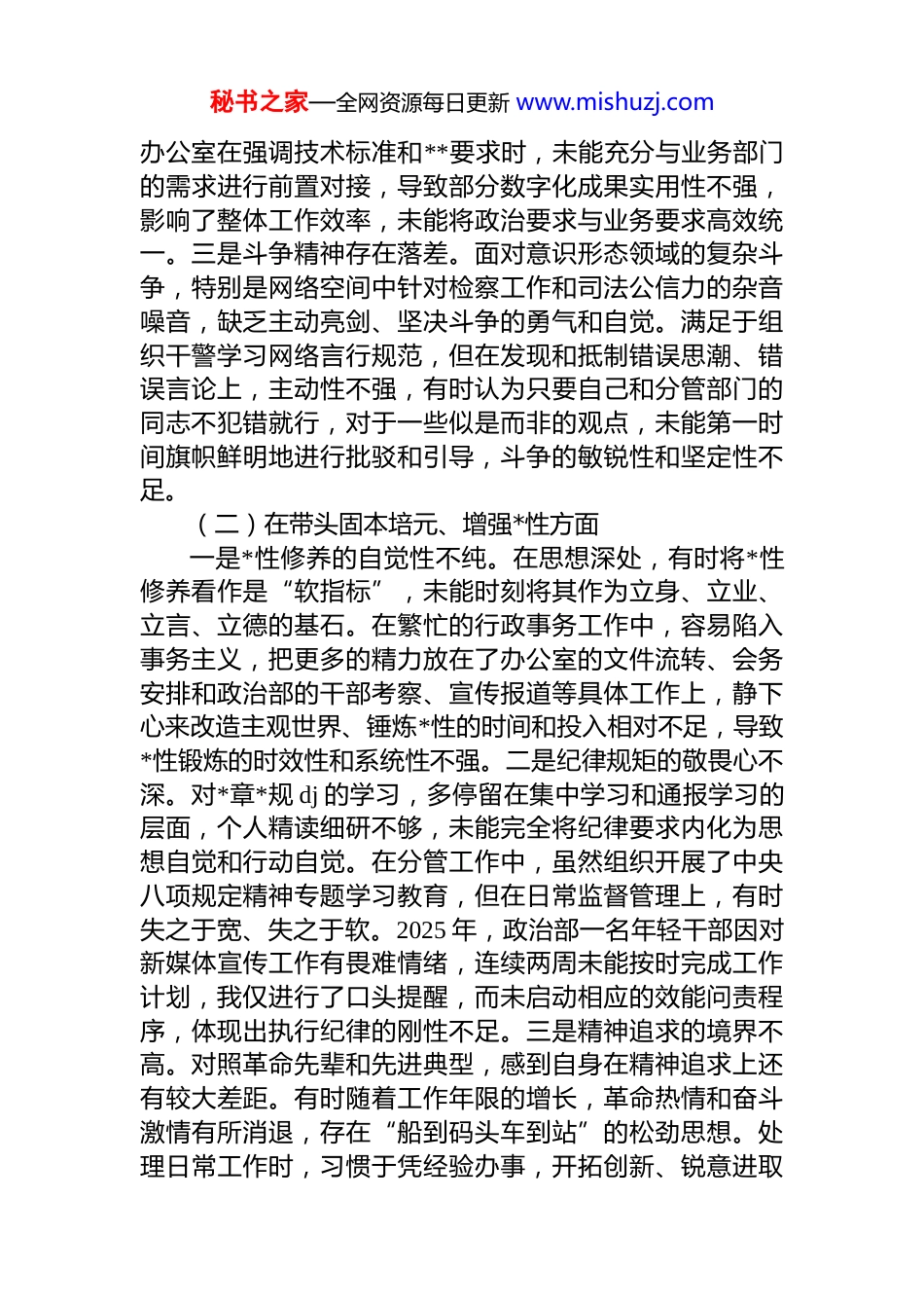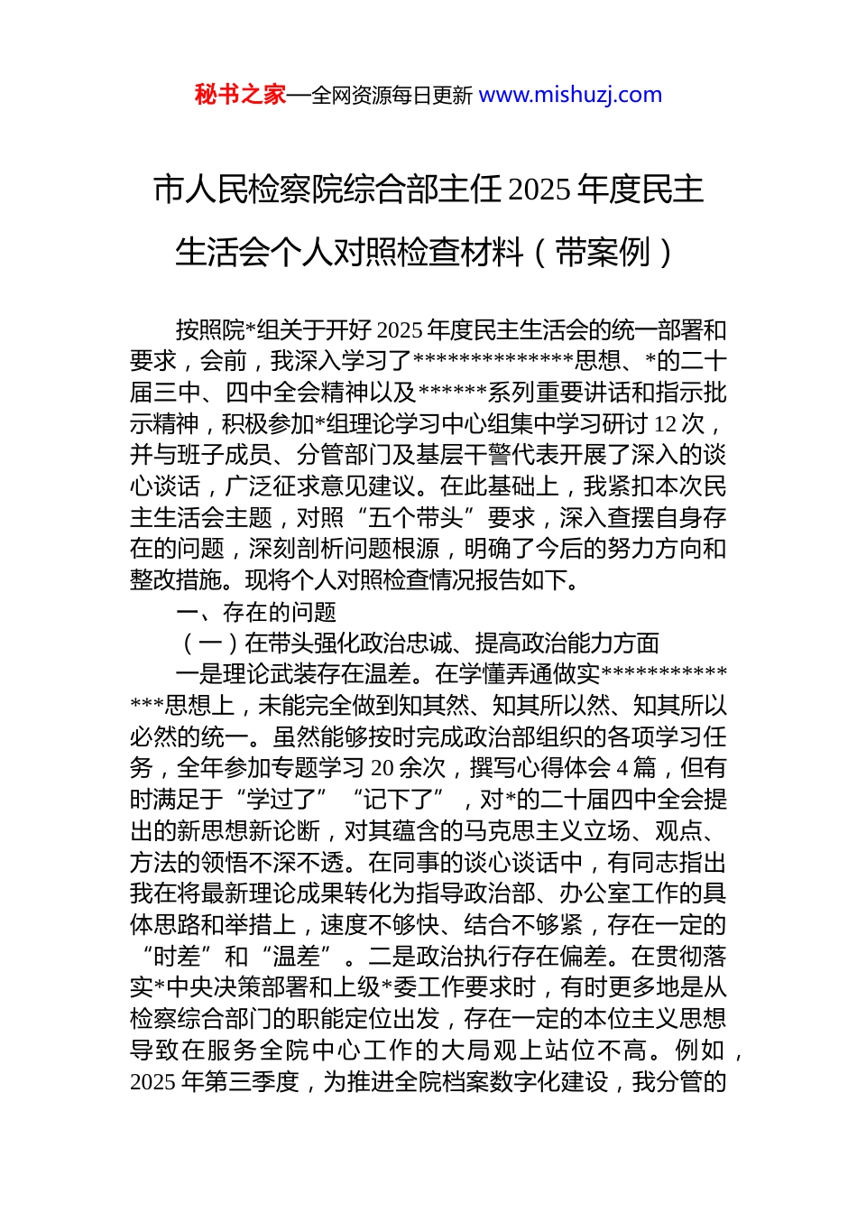 秘书之家—全网资源每日更新 www.mishuzj.com市人民检察院综合部主任 2025 年度民主生活会个人对照检查材料(带案例)按照院*组关于开好 2025 年度民主生活会的统一部署和要求,会前,我深入学习了**************思想、*的二十届三中、四中全会精神以及******系列重要讲话和指示批示精神,积极参加*组理论学习中心组集中学习研讨 12 次,并与班子成员、分管部门及基层干警代表开展了深入的谈心谈话,广泛征求意见建议。在此基础上,我紧扣本次民主生活会主题,对照“五个带头”要求,深入查摆自身存在的问题,深刻剖析问题根源,明确了今后的努力方向和整改措施。现将个人对照检查情况报告如下。一、存在的问题(一)在带头强化政治忠诚、提高政治能力方面一是理论武装存在温差。在学懂弄通做实**************思想上,未能完全做到知其然、知其所以然、知其所以必然的统一。虽然能够按时完成政治部组织的各项学习任务,全年参加专题学习 20 余次,撰写心得体会 4 篇,但有时满足于“学过了”“记下了”,对*的二十届四中全会提出的新思想新论断,对其蕴含的马克思主义立场、观点、方法的领悟不深不透。在同事的谈心谈话中,有同志指出我在将最新理论成果转化为指导政治部、办公室工作的具体思路和举措上,速度不够快、结合不够紧,存在一定的“时差”和“温差”。二是政治执行存在偏差。在贯彻落实*中央决策部署和上级*委工作要求时,有时更多地是从检察综合部门的职能定位出发,存在一定的本位主义思想导致在服务全院中心工作的大局观上站位不高。例如,2025 年第三季度,为推进全院档案数字化建设,我分管的秘书之家—全网资源每日更新 www.mishuzj.com办公室在强调技术标准和**要求时,未能充分与业务部门的需求进行前置对接,导致部分数字化成果实用性不强,影响了整体工作效率,未能将政治要求与业务要求高效统一。三是斗争精神存在落差。面对意识形态领域的复杂斗争,特别是网络空间中针对检察工作和司法公信力的杂音噪音,缺乏主动亮剑、坚决斗争的勇气和自觉。满足于组织干警学习网络言行规范,但在发现和抵制错误思潮、错误言论上,主动性不强,有时认为只要自己和分管部门的同志不犯错就行,对于一些似是而非的观点,未能第一时间旗帜鲜明地进行批驳和引导,斗争的敏锐性和坚定性不足。(二)在带头固本培元、增强*性方面一是*性修养的自觉性不纯。在思想深处,有时将*性修养看作是“软指标”,未能时刻将其作为立身、立业、立言、立德的基石。在繁忙的行政事务工作中,容易陷入事务主义,把更多的精力放在了办公室的文件流转、会务安排和政治部的干部考察、宣传报道等具体工作上,静下心来改造主观世界、锤炼*性的时间和投入相对不足,导致*性锻炼的时效性和系统性不强。二是纪律规矩的敬畏心不深。对*章*规 dj 的学习,多停留在集中学习和通报学习的层面,个人精读细研不够,未能完全将纪律要求内化为思想自觉和行动自觉。在分管工作中,虽然组织开展了中央八项规定精神专题学习教育,但在日常监督管理上,有时失之于宽、失之于软。2025 年,政治部一名年轻干部因对新媒体宣传工作有畏难情绪,连续两周未能按时完成工作计划,我仅进行了口头提醒,而未启动相应的效能问责程序,体现出执行纪律的刚性不足。三是精神追求的境界不高。对照革命先辈和先进典型,感到自身在精神追求上还有较大差距。有时随着工作年限的增长,革命热情和奋斗激情有所消退,存在“船到码头车到站”的松劲思想。处理日常工作时,习惯于凭经验办事,开拓创新、锐意进取秘书之家—全网资源每日更新 www.mishuzj.com的精神状态有所下滑,未能时时以共产*人应有的精神境界来要求自己,艰苦奋斗、无私奉献的精神有所淡化。(三)在带头敬畏人民、敬畏组织、敬畏法纪方面一是深入基层服务群众不实。践行新时代*的群众路线存在“温差”,落实“四下基层”制度不扎实。2025 年全年,我带队下基层调研 8 次,但真正沉下身子与群众面对面交流的时间占比不足 30%。比如在去年 10 月赴**乡开展普法宣传活动时,主要依赖乡镇干部组织的座谈会了解情况对群众反映的法律援助渠道不畅的...