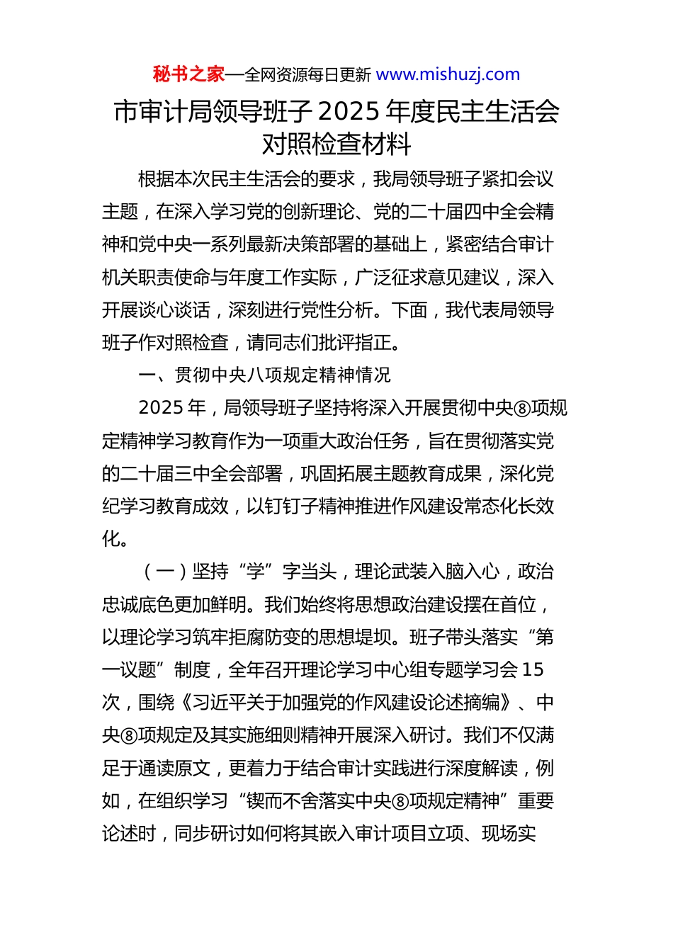 秘书之家—全网资源每日更新 www.mishuzj.com市审计局领导班子 2025 年度民主生活会对照检查材料根据本次民主生活会的要求,我局领导班子紧扣会议主题,在深入学习党的创新理论、党的二十届四中全会精神和党中央一系列最新决策部署的基础上,紧密结合审计机关职责使命与年度工作实际,广泛征求意见建议,深入开展谈心谈话,深刻进行党性分析。下面,我代表局领导班子作对照检查,请同志们批评指正。一、贯彻中央八项规定精神情况2025 年,局领导班子坚持将深入开展贯彻中央⑧项规定精神学习教育作为一项重大政治任务,旨在贯彻落实党的二十届三中全会部署,巩固拓展主题教育成果,深化党纪学习教育成效,以钉钉子精神推进作风建设常态化长效化。(一)坚持“学”字当头,理论武装入脑入心,政治忠诚底色更加鲜明。我们始终将思想政治建设摆在首位,以理论学习筑牢拒腐防变的思想堤坝。班子带头落实“第一议题”制度,全年召开理论学习中心组专题学习会 15次,围绕《习近平关于加强党的作风建设论述摘编》、中央⑧项规定及其实施细则精神开展深入研讨。我们不仅满足于通读原文,更着力于结合审计实践进行深度解读,例如,在组织学习“锲而不舍落实中央⑧项规定精神”重要论述时,同步研讨如何将其嵌入审计项目立项、现场实秘书之家—全网资源每日更新 www.mishuzj.com施、报告出具的全流程,将“作风建设常态化机制”具化为审计质量控制标准。我们创新学习形式,采取“线上+线下”“理论+案例”相结合的模式,举办专题读书班 4 期,开展“以案说纪”警示教育会 6 场,覆盖全局党员干部,引导大家从通报的全国 27977 起违反中央⑧项规定精神问题中汲取教训,深刻认识“四风”问题的顽固性、变异性。通过学习,领导班子“政治三力”显著提升,在谋划年度 40 项审计项目计划时,自觉将贯彻落实党中央关于“十五五”规划的重大决策部署作为首要考量,确保审计监督始终沿着正确政治方向前进。(二)聚焦“查”字破题,对照检视动真碰硬,问题导向贯穿始终。我们树立“查不出问题是最大问题”的导向,将严肃查摆作为深化学习、改进作风的关键环节。领导班子率先垂范,对照中央要求、党纪党规和群众期盼,带头查摆在履职尽责、服务发展方面可能存在的不足。我们拓宽查摆渠道,不仅通过民主生活会前发放征求意见表、设置意见箱收集外部意见 32 条,更主动“刀刃向内”,运用审计业务会、项目复盘会等方式,系统梳理在审计监督中是否存在不担当、不作为、乱作为的苗头性倾向。例如,在复核某民生政策落实审计项目时,我们不仅审视审计发现的问题,更反向检视审计组自身在调查深度、取证规范性上是否存在“走过场”的形式主义风险。我们坚持将查摆与业务深度融合,针对 2025 年已完成并出秘书之家—全网资源每日更新 www.mishuzj.com具报告的 18 个审计项目中反映的 326 条问题,逐条回溯审计程序是否严谨、审计建议是否精准,深挖背后可能存在的作风根源。通过多轮次、立体化的“政治体检”,共查摆出班子层面在调查研究、攻坚克难等方面存在的问题11 个,为精准整改奠定了坚实基础。(三)着力“改”字见效,建章立制固本培元,长效机制稳步构建。我们坚持“当下改”与“长久立”相结合,以务实整改祛除作风积弊,以制度创新巩固教育成果。针对查摆出的问题,建立“问题、责任、整改”三张清单,实行台账管理和销号制度,截至目前,班子层面的11 个问题已完成整改 9 个,剩余 2 个需长期坚持的已制定阶段性目标。我们注重将整改成果转化为制度优势,年内修订完善了《审计现场管理办法》、《审计廉政回访制度》等 4 项内部规章,将落实中央⑧项规定精神的要求细化到审计权力运行的各个环节。例如,新修订的廉政回访制度,明确要求对 30%以上的被审计单位进行抽查回访,重点了解审计人员遵守工作纪律、廉洁纪律情况,扎紧制度笼子。我们强化监督贯通协同,在年初制定审计项目计划时,主动征求市纪委监委、市委巡察办等 22 个部门意见,并在审计中加强线索移送与成果共享,年内向相关部门移送问题线索 5 条,推动审计监督与各类监督形成合力,构建起更为严...