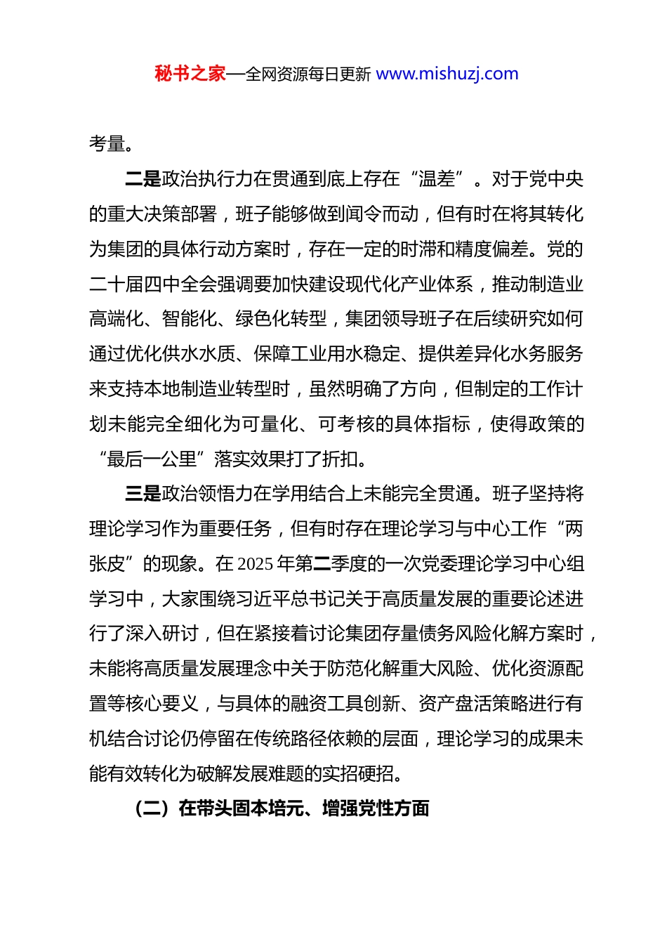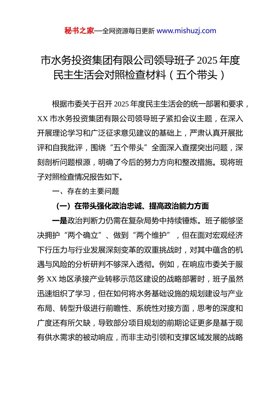 秘书之家—全网资源每日更新 www.mishuzj.com市水务投资集团有限公司领导班子 2025 年度民主生活会对照检查材料(五个带头)根据市委关于召开 2025 年度民主生活会的统一部署和要求,XX 市水务投资集团有限公司领导班子紧扣会议主题,在深入开展理论学习和广泛征求意见建议的基础上,严肃认真开展批评和自我批评,围绕“五个带头”全面深入查摆突出问题,深刻剖析问题根源,明确了今后的努力方向和整改措施。现将班子对照检查情况报告如下。一、存在的主要问题(一)在带头强化政治忠诚、提高政治能力方面一是政治判断力仍需在复杂局势中持续锤炼。班子能够坚决拥护“两个确立”、做到“两个维护”,但在面对宏观经济下行压力与行业发展深刻变革的双重挑战时,对其中蕴含的机遇与风险的分析研判不够深入透彻。例如,在响应市委关于服务 XX 地区承接产业转移示范区建设的战略部署时,班子虽然迅速组织了学习,但在如何将水务基础设施的规划建设与产业布局、转型升级进行前瞻性、系统性对接方面,思考的深度和广度还有所欠缺,导致部分项目规划的前期论证更多是基于现有供水需求的被动响应,而非主动引领和支撑区域发展的战略秘书之家—全网资源每日更新 www.mishuzj.com考量。二是政治执行力在贯通到底上存在“温差”。对于党中央的重大决策部署,班子能够做到闻令而动,但有时在将其转化为集团的具体行动方案时,存在一定的时滞和精度偏差。党的二十届四中全会强调要加快建设现代化产业体系,推动制造业高端化、智能化、绿色化转型,集团领导班子在后续研究如何通过优化供水水质、保障工业用水稳定、提供差异化水务服务来支持本地制造业转型时,虽然明确了方向,但制定的工作计划未能完全细化为可量化、可考核的具体指标,使得政策的“最后一公里”落实效果打了折扣。三是政治领悟力在学用结合上未能完全贯通。班子坚持将理论学习作为重要任务,但有时存在理论学习与中心工作“两张皮”的现象。在 2025 年第二季度的一次党委理论学习中心组学习中,大家围绕习近平总书记关于高质量发展的重要论述进行了深入研讨,但在紧接着讨论集团存量债务风险化解方案时,未能将高质量发展理念中关于防范化解重大风险、优化资源配置等核心要义,与具体的融资工具创新、资产盘活策略进行有机结合讨论仍停留在传统路径依赖的层面,理论学习的成果未能有效转化为破解发展难题的实招硬招。(二)在带头固本培元、增强党性方面秘书之家—全网资源每日更新 www.mishuzj.com一是理想信念的“总开关”拧得不够紧实。班子成员能够坚定共产主义远大理想和中国特色社会主义共同理想,但在日常工作中,偶尔会不自觉地将业务指标的完成度置于党性原则的检视之上。在推进年度重点项目建设时,面对工期紧张的压力,个别时候会优先考虑工程进度,而在一定程度上放松了对项目全过程党建工作的同步谋划和监督,反映出在处理“显绩”与“潜绩”关系时,党性修养的统领作用发挥还不够充分。二是党性锤炼的主动性和自觉性有待加强。班子成员能够认真学习党章党规党纪,但在持之以恒、常态长效的自我修炼上有所松懈。比如,在没有硬性要求的情况下,主动重温入党誓词、回顾党的光辉历程、对照先进典型检视自身的思想和行动还不够经常。有时满足于参加集体学习和组织生活,但在“八小时之外”的自我净化、自我完善、自我革新、自我提高上下的功夫还不足,导致党性修养未能完全内化为一种高度的政治自觉和行动自觉。三是自我革命精神的锋芒有所减弱。面对集团改革发展进入深水区,一些长期存在的“硬骨头”问题,班子有时存在畏难情绪和求稳心态。在研究某下属单位的混合所有制改革试点工作时,尽管认识到改革是激发企业活力的关键一招,但考虑到资产评估复杂、员工安置难度大、战略投资者引入不确定性秘书之家—全网资源每日更新 www.mishuzj.com高等因素,在推进过程中表现得较为审慎,未能以刀刃向内的勇气和刮骨疗毒的决心果断决策、迅速突破,革命精神和斗争精神的成色尚有不足。(三)在带头敬畏人民、敬畏组织、敬畏法纪方面一是践行新时代党的群众路线不够深入。班子成员能够坚持“四下基层”制度,...