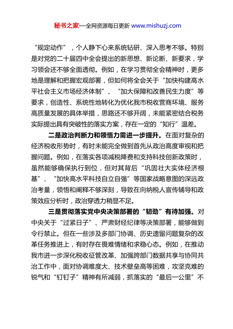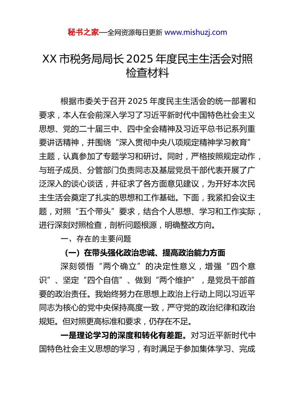 秘书之家—全网资源每日更新 www.mishuzj.comXX 市税务局局长 2025 年度民主生活会对照检查材料根据市委关于召开 2025 年度民主生活会的统一部署和要求,本人在会前深入学习了习近平新时代中国特色社会主义思想、党的二十届三中、四中全会精神及习近平总书记系列重要讲话精神,并围绕“深入贯彻中央八项规定精神学习教育”主题,认真参加了专题学习和研讨。同时,严格按照规定动作,与班子成员、分管部门负责同志及基层党员干部代表开展了广泛深入的谈心谈话,并征求了各方面意见建议,为开好本次民主生活会奠定了扎实的思想和工作基础。下面,我紧扣会议主题,对照“五个带头”要求,结合个人思想、学习和工作实际,进行深刻对照检查,剖析问题根源,明确整改方向。一、存在的主要问题(一)在带头强化政治忠诚、提高政治能力方面深刻领悟“两个确立”的决定性意义,增强“四个意识”、坚定“四个自信”、做到“两个维护”,是党员干部首要的政治责任。我始终努力在思想上政治上行动上同以习近平同志为核心的党中央保持高度一致,严守党的政治纪律和政治规矩。但对照更高标准和要求,仍存在不足。一是理论学习的深度和转化有差距。对习近平新时代中国特色社会主义思想的学习,有时满足于参加集体学习、完成秘书之家—全网资源每日更新 www.mishuzj.com“规定动作”,个人静下心来系统钻研、深入思考不够。特别是对党的二十届四中全会提出的新思想、新论断、新要求,学习领会还不够全面透彻。例如,在学习贯彻全会精神时,更多地是理解和把握宏观部署,但如何将全会关于“加快构建高水平社会主义市场经济体制”、“加大保障和改善民生力度”等要求,创造性、系统性地转化为优化我市税收营商环境、服务高质量发展的具体举措,思路还不够开阔,未能紧密结合税务实际提出具有突破性的落实方案,存在一定的“知行”温差。二是政治判断力和领悟力需进一步提升。在面对复杂的经济税收形势时,有时未能完全做到首先从政治高度审视和把握问题。例如,在落实各项减税降费和支持科技创新政策时,虽然能够确保执行到位,但对其背后“巩固壮大实体经济根基”、“加快高水平科技自立自强”等国家战略意图的深远政治考量,领悟和阐释不够深刻,导致在向纳税人宣传辅导和政策效应分析时,政治穿透力稍显不足。三是贯彻落实党中央决策部署的“韧劲”有待加强。对中央关于“过紧日子”、严肃财经纪律等决策部署,能够做到令行禁止。但在一些涉及多部门协调、历史遗留问题复杂的改革任务推进上,有时存在畏难情绪和求稳心态。例如,在推动我市进一步深化税收征管改革、加强跨部门数据共享与协同共治工作中,面对协调难度大、技术壁垒高等困难,攻坚克难的锐气和“钉钉子”精神有所减弱,抓落实的“最后一公里”不秘书之家—全网资源每日更新 www.mishuzj.com够彻底。(二)在带头固本培元、增强党性方面坚持把政治修养摆在党性修养的首位,自觉以习近平新时代中国特色社会主义思想凝心铸魂,是共产党人锤炼党性的根本要求。反思自身,在持续“补钙壮骨”、解决好世界观、人生观、价值观“总开关”问题上,仍有提升空间。一是党性锤炼的主动性有所放松。随着工作阅历增长,有时不自觉地产生了“党性修养已经比较扎实”的模糊认识,参加党内政治生活的标准有所降低。在参加支部组织生活会时,自我批评能够做到揭短亮丑,但对其他同志的批评,有时存在“和风细雨”多、“红脸出汗”少的情况,顾虑情面,辣味不足,未能充分发挥党内政治生活“熔炉”作用。二是理想信念的根基在复杂考验前需持续加固。面对当前经济下行压力、组织收入任务艰巨等现实挑战,总体上能够保持定力,但偶尔也会产生急躁或焦虑情绪。特别是在推进智慧税务建设等攻坚任务遇到瓶颈时,攻坚克难的精气神和“革命理想高于天”的信念支撑力偶有波动,反映出理想信念的“压舱石”作用还需在长期实践中不断夯实。三是个人修养与价值追求需时刻对标校准。能够自觉遵守党章党规党纪,用党性原则修身律己。但在处理一些具体问题时,有时会不自觉地掺杂个人荣辱、得失的考量。例如,在干部选拔任用或评优评先工作中,对于能力突出但...
