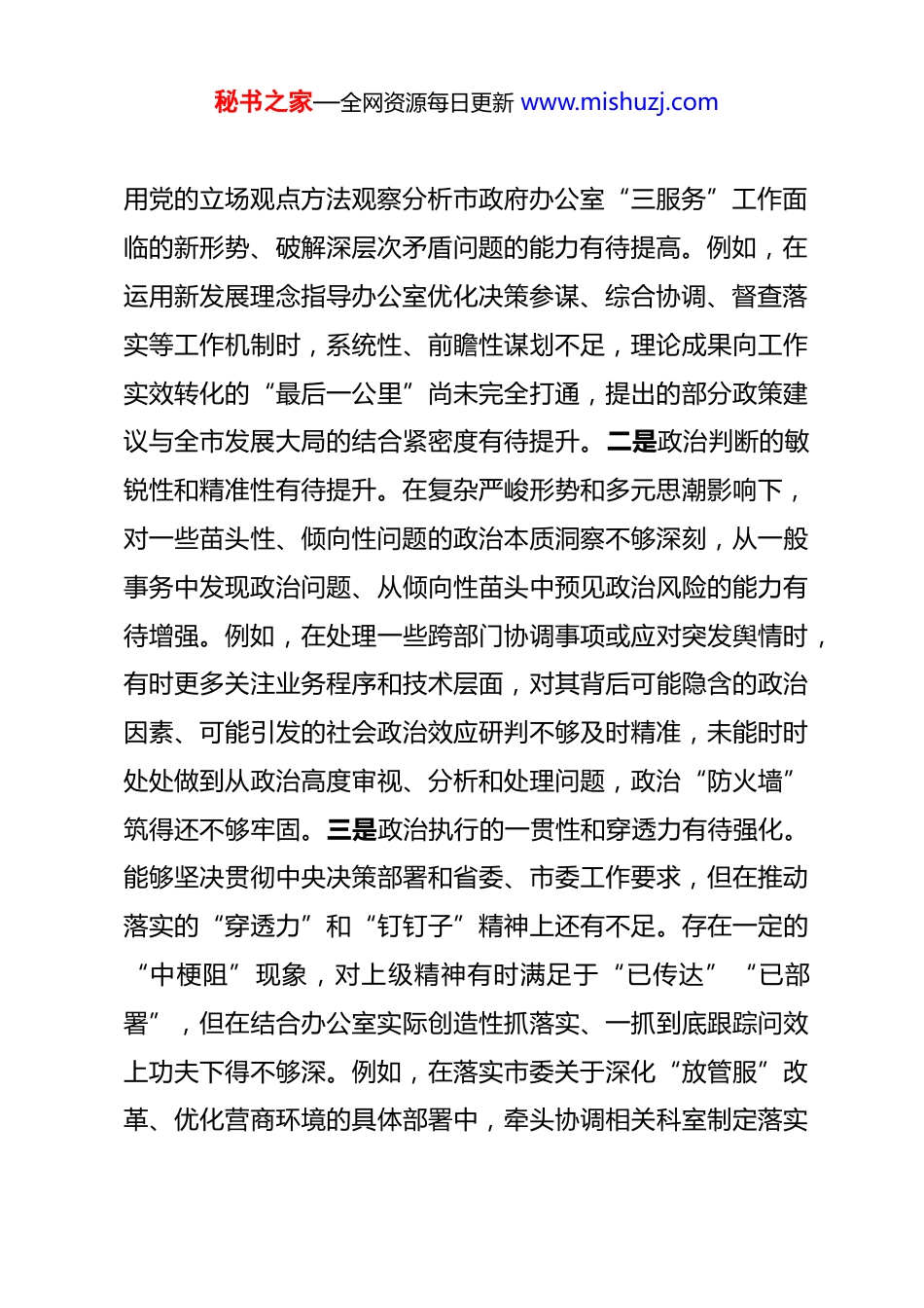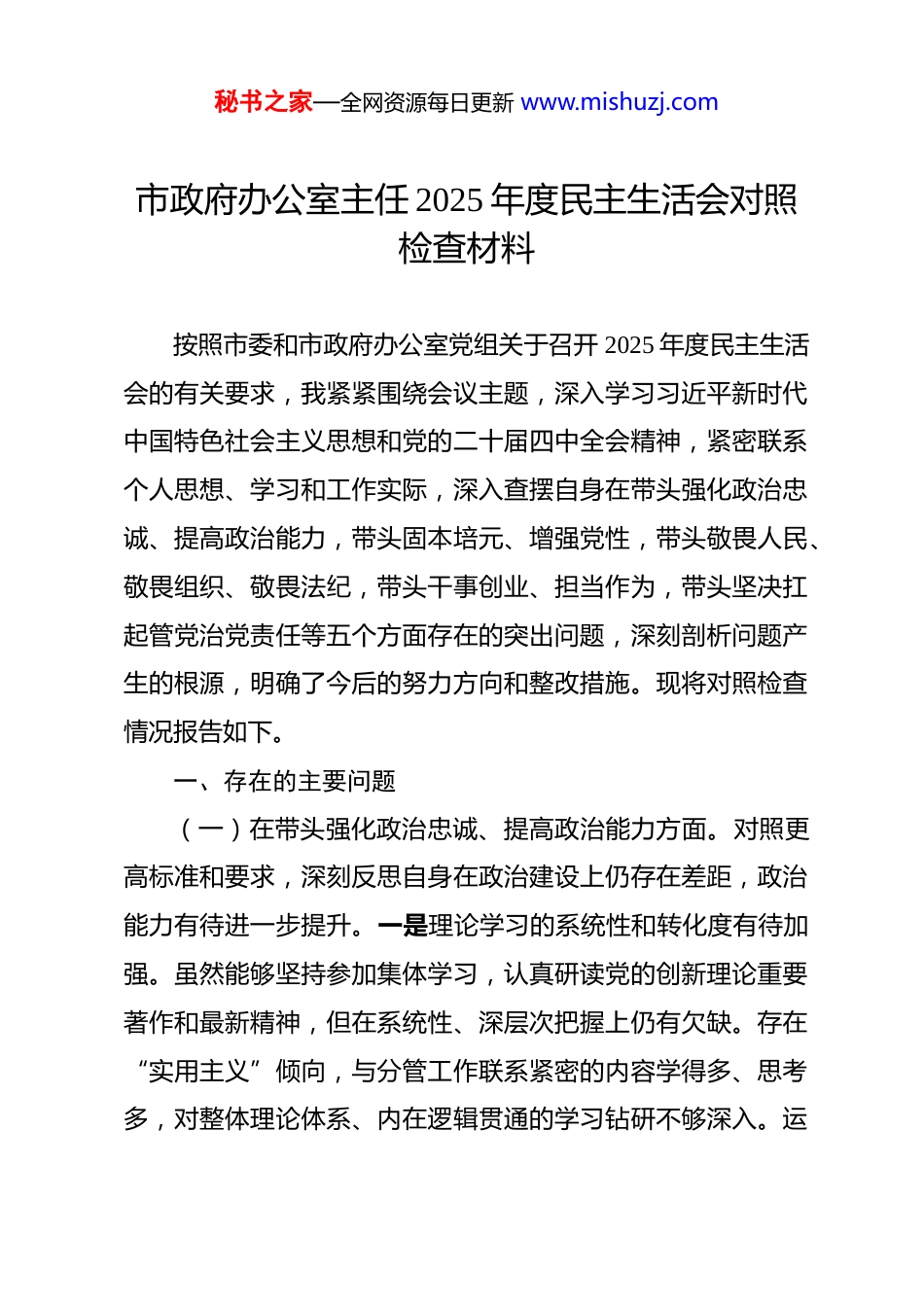 秘书之家—全网资源每日更新 www.mishuzj.com市政府办公室主任 2025 年度民主生活会对照检查材料 按照市委和市政府办公室党组关于召开 2025 年度民主生活会的有关要求,我紧紧围绕会议主题,深入学习习近平新时代中国特色社会主义思想和党的二十届四中全会精神,紧密联系个人思想、学习和工作实际,深入查摆自身在带头强化政治忠诚、提高政治能力,带头固本培元、增强党性,带头敬畏人民、敬畏组织、敬畏法纪,带头干事创业、担当作为,带头坚决扛起管党治党责任等五个方面存在的突出问题,深刻剖析问题产生的根源,明确了今后的努力方向和整改措施。现将对照检查情况报告如下。一、存在的主要问题(一)在带头强化政治忠诚、提高政治能力方面。对照更高标准和要求,深刻反思自身在政治建设上仍存在差距,政治能力有待进一步提升。一是理论学习的系统性和转化度有待加强。虽然能够坚持参加集体学习,认真研读党的创新理论重要著作和最新精神,但在系统性、深层次把握上仍有欠缺。存在“实用主义”倾向,与分管工作联系紧密的内容学得多、思考多,对整体理论体系、内在逻辑贯通的学习钻研不够深入。运秘书之家—全网资源每日更新 www.mishuzj.com用党的立场观点方法观察分析市政府办公室“三服务”工作面临的新形势、破解深层次矛盾问题的能力有待提高。例如,在运用新发展理念指导办公室优化决策参谋、综合协调、督查落实等工作机制时,系统性、前瞻性谋划不足,理论成果向工作实效转化的“最后一公里”尚未完全打通,提出的部分政策建议与全市发展大局的结合紧密度有待提升。二是政治判断的敏锐性和精准性有待提升。在复杂严峻形势和多元思潮影响下,对一些苗头性、倾向性问题的政治本质洞察不够深刻,从一般事务中发现政治问题、从倾向性苗头中预见政治风险的能力有待增强。例如,在处理一些跨部门协调事项或应对突发舆情时,有时更多关注业务程序和技术层面,对其背后可能隐含的政治因素、可能引发的社会政治效应研判不够及时精准,未能时时处处做到从政治高度审视、分析和处理问题,政治“防火墙”筑得还不够牢固。三是政治执行的一贯性和穿透力有待强化。能够坚决贯彻中央决策部署和省委、市委工作要求,但在推动落实的“穿透力”和“钉钉子”精神上还有不足。存在一定的“中梗阻”现象,对上级精神有时满足于“已传达”“已部署”,但在结合办公室实际创造性抓落实、一抓到底跟踪问效上功夫下得不够深。例如,在落实市委关于深化“放管服”改革、优化营商环境的具体部署中,牵头协调相关科室制定落实秘书之家—全网资源每日更新 www.mishuzj.com方案后,对后续各环节的衔接、堵点的疏通、效果的评估等持续跟踪问效不够紧密,导致部分改革举措的“含金量”未能充分释放,政策传导存在“温差”。(二)在带头固本培元、增强党性方面。对照革命先辈和先进典型,反思自身在党性修养、理想信念锤炼上还不够严格、不够经常。一是历史自觉和理论滋养不够深厚。对党史、新中国史、改革开放史、社会主义发展史的学习缺乏持续性和沉浸感,对其中蕴含的理想信念、初心使命、精神谱系的感悟有时停留在认知层面,未能完全内化为锤炼党性的强大动力。例如,在组织办公室党员干部开展党性教育时,自身带头深入研讨、从历史经验中汲取应对当前办公室“急难险重”任务的智慧和力量方面做得不够,运用历史观照现实、推动工作的能力有待提升。二是理想信念的常态化锤炼有所松懈。随着工作头绪增多、任务加重,有时不自觉地出现了“重事务、轻思想”的倾向,将更多精力放在协调、办文、办会上,静下心来对照党章党规党纪检视反思、打扫思想灰尘不够经常。在面对办公室工作中长期存在的矛盾或新出现的难点问题时,攻坚克难的锐气和闯劲偶有不足,内心深处“革命理想高于天”的信念支撑在具体工作中体现得不够充分。例如,在推动办公室信息化建设升级时,面对技术选型风险、部门数据壁垒等困难,有时存在秘书之家—全网资源每日更新 www.mishuzj.com求稳怕错思想,敢为人先、敢闯敢试的劲头有所减弱。三是初心使命践行存在“温差”。虽然能够牢记为人民服务的宗旨,但在具体工作中,对标“...