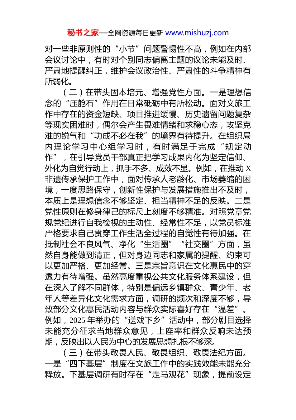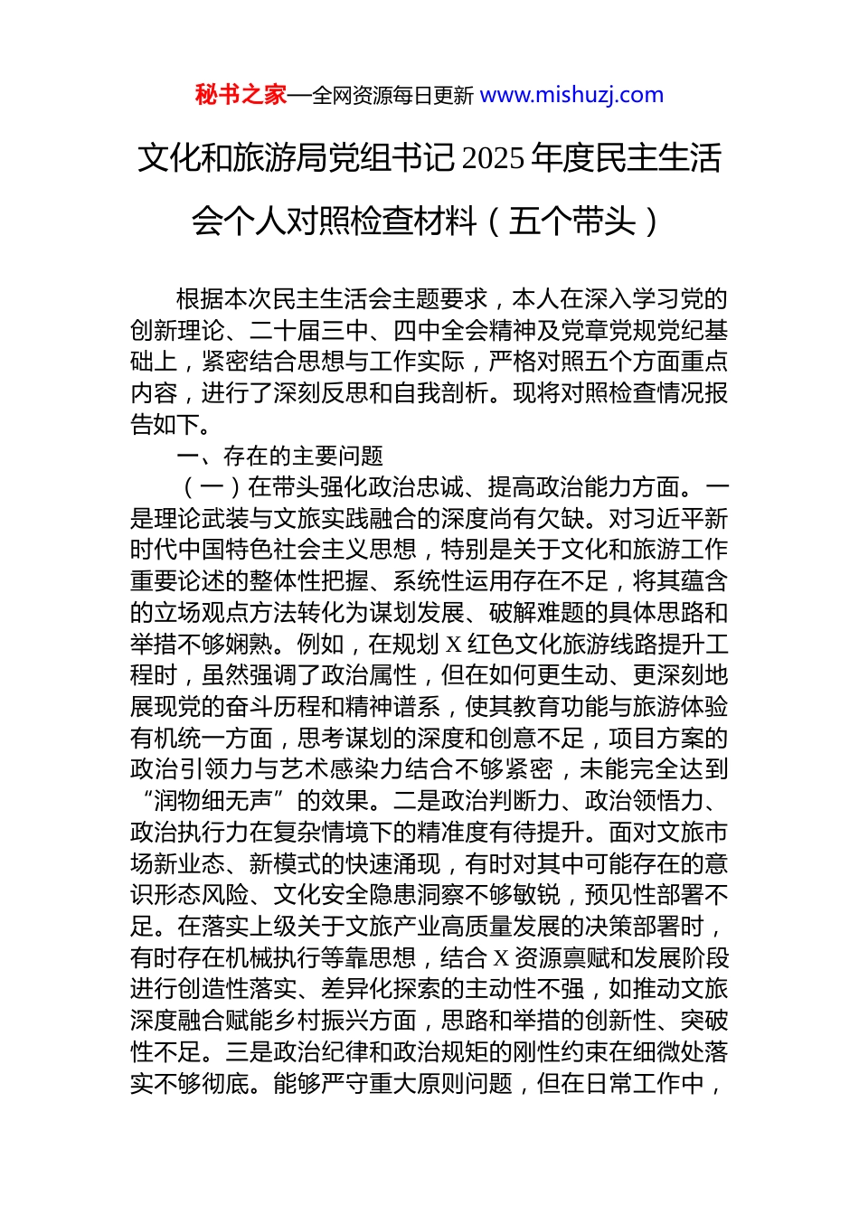 秘书之家—全网资源每日更新 www.mishuzj.com文化和旅游局党组书记 2025 年度民主生活会个人对照检查材料(五个带头)根据本次民主生活会主题要求,本人在深入学习党的创新理论、二十届三中、四中全会精神及党章党规党纪基础上,紧密结合思想与工作实际,严格对照五个方面重点内容,进行了深刻反思和自我剖析。现将对照检查情况报告如下。一、存在的主要问题(一)在带头强化政治忠诚、提高政治能力方面。一是理论武装与文旅实践融合的深度尚有欠缺。对习近平新时代中国特色社会主义思想,特别是关于文化和旅游工作重要论述的整体性把握、系统性运用存在不足,将其蕴含的立场观点方法转化为谋划发展、破解难题的具体思路和举措不够娴熟。例如,在规划 X 红色文化旅游线路提升工程时,虽然强调了政治属性,但在如何更生动、更深刻地展现党的奋斗历程和精神谱系,使其教育功能与旅游体验有机统一方面,思考谋划的深度和创意不足,项目方案的政治引领力与艺术感染力结合不够紧密,未能完全达到“润物细无声”的效果。二是政治判断力、政治领悟力、政治执行力在复杂情境下的精准度有待提升。面对文旅市场新业态、新模式的快速涌现,有时对其中可能存在的意识形态风险、文化安全隐患洞察不够敏锐,预见性部署不足。在落实上级关于文旅产业高质量发展的决策部署时,有时存在机械执行等靠思想,结合 X 资源禀赋和发展阶段进行创造性落实、差异化探索的主动性不强,如推动文旅深度融合赋能乡村振兴方面,思路和举措的创新性、突破性不足。三是政治纪律和政治规矩的刚性约束在细微处落实不够彻底。能够严守重大原则问题,但在日常工作中,秘书之家—全网资源每日更新 www.mishuzj.com对一些非原则性的“小节”问题警惕性不高,例如在内部会议讨论中,有时对个别同志偏离主题的议论未能及时、严肃地提醒纠正,维护会议政治性、严肃性的斗争精神有所弱化。(二)在带头固本培元、增强党性方面。一是理想信念的“压舱石”作用在日常砥砺中有所松动。面对文旅工作中存在的资金短缺、项目推进缓慢、历史遗留问题复杂等现实困难时,偶尔会产生畏难情绪和求稳心态,攻坚克难的锐气和“功成不必在我”的境界有待提升。在组织局内理论学习中心组学习时,有时满足于完成“规定动作”,在引导党员干部真正把学习成果内化为坚定信仰、外化为自觉行动上,抓手不多、成效不显。例如,在推动 X非遗传承保护工作中,面对传承人老龄化、市场萎缩的困境,一度思路保守,创新性保护与发展措施推出不及时,本质上是理想信念不够坚定、担当精神不足的反映。二是党性原则在修身律己的标尺上刻度不够精准。对照党章党规党纪进行自我检视的主动性、经常性不足,以党员标准严格要求自己贯穿工作生活全过程的自觉性有待加强。在抵制社会不良风气、净化“生活圈”“社交圈”方面,虽然自身能做到清正,但对身边同志和家属的提醒、约束可以更加严格、更加经常。三是宗旨意识在文化惠民中的穿透力有待增强。虽然高度重视公共文化服务体系建设,但在深入了解不同群体,特别是偏远乡镇群众、青少年、老年人等差异化文化需求方面,调研的频次和深度不够,导致部分文化惠民活动内容与群众实际喜好存在“温差”。例如,2025 年举办的“送戏下乡”活动中,部分剧目选择未能充分征求当地群众意见,上座率和群众反响未达预期,反映出以人民为中心的发展思想扎根不够深。(三)在带头敬畏人民、敬畏组织、敬畏法纪方面。一是“四下基层”制度在文旅工作中的实践效能未能充分释放。下基层调研有时存在“走马观花”现象,提前设定秘书之家—全网资源每日更新 www.mishuzj.com路线、看“盆景”多,随机走访、深入农家、与普通游客面对面交流少,对基层文旅工作真实状况和群众急难愁盼掌握不够全面精准。例如,在调研 X 古镇旅游业态升级时,更多听取了管委会和重点商户的意见,对原住民关于旅游开发影响其生活、参与度低的诉求收集不够充分,后续政策制定中对其利益的兼顾考虑不足。二是民主集中制原则在议事决策中的刚性执行有待加强。在局党组会议讨论重大事项时,虽然能保障班子成员充分发表意见,但有时为了追求效率...
