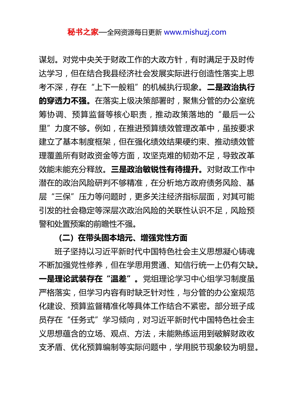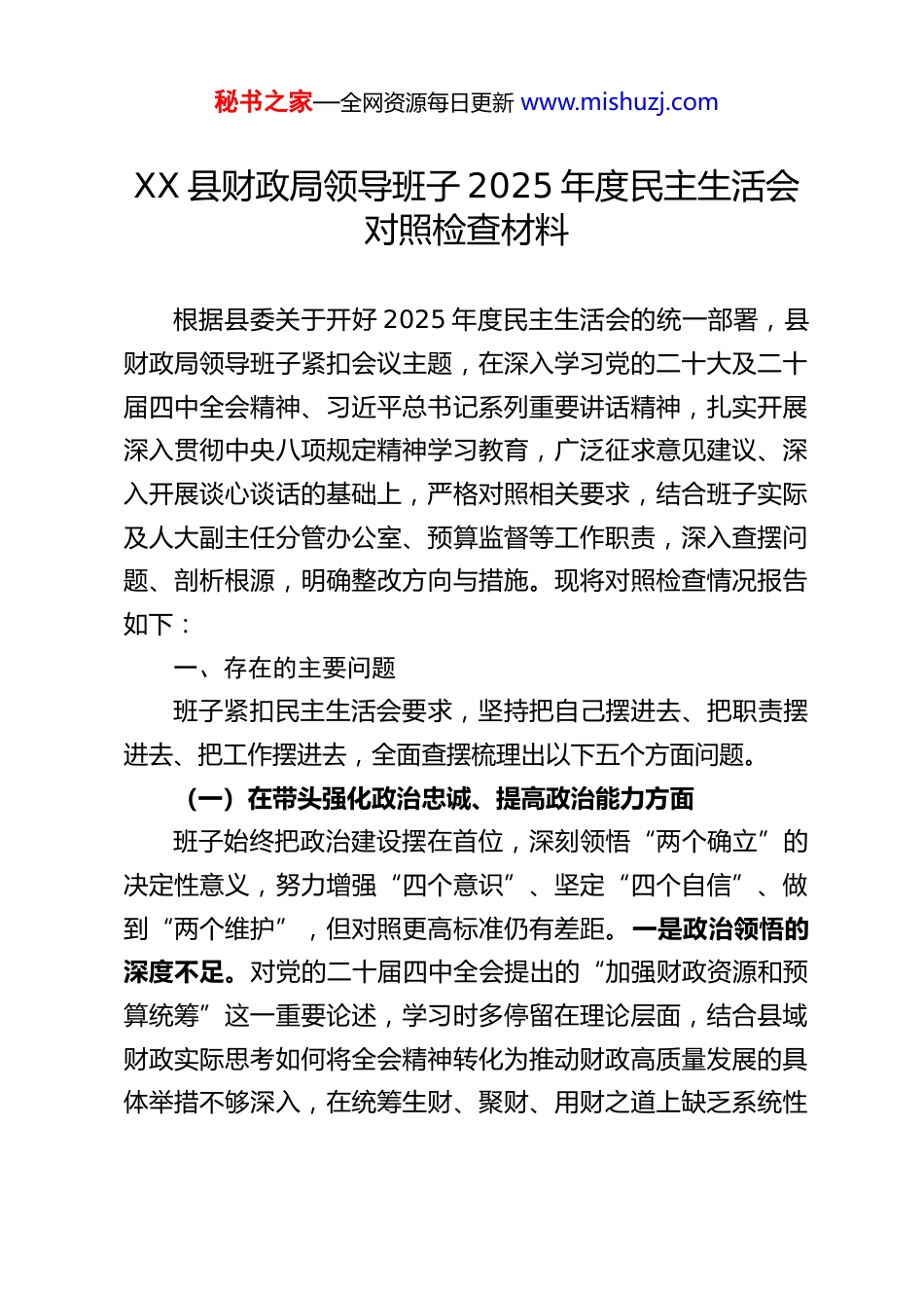 秘书之家—全网资源每日更新 www.mishuzj.comXX 县财政局领导班子 2025 年度民主生活会对照检查材料根据县委关于开好 2025 年度民主生活会的统一部署,县财政局领导班子紧扣会议主题,在深入学习党的二十大及二十届四中全会精神、习近平总书记系列重要讲话精神,扎实开展深入贯彻中央八项规定精神学习教育,广泛征求意见建议、深入开展谈心谈话的基础上,严格对照相关要求,结合班子实际及人大副主任分管办公室、预算监督等工作职责,深入查摆问题、剖析根源,明确整改方向与措施。现将对照检查情况报告如下:一、存在的主要问题班子紧扣民主生活会要求,坚持把自己摆进去、把职责摆进去、把工作摆进去,全面查摆梳理出以下五个方面问题。(一)在带头强化政治忠诚、提高政治能力方面班子始终把政治建设摆在首位,深刻领悟“两个确立”的决定性意义,努力增强“四个意识”、坚定“四个自信”、做到“两个维护”,但对照更高标准仍有差距。一是政治领悟的深度不足。对党的二十届四中全会提出的“加强财政资源和预算统筹”这一重要论述,学习时多停留在理论层面,结合县域财政实际思考如何将全会精神转化为推动财政高质量发展的具体举措不够深入,在统筹生财、聚财、用财之道上缺乏系统性秘书之家—全网资源每日更新 www.mishuzj.com谋划。对党中央关于财政工作的大政方针,有时满足于及时传达学习,但在结合我县经济社会发展实际进行创造性落实上思考不深,存在“上下一般粗”的机械执行现象。二是政治执行的穿透力不强。在落实上级决策部署时,聚焦分管的办公室统筹协调、预算监督等核心职责,推动政策落地的“最后一公里”力度不够。例如,在推进预算绩效管理改革中,虽按要求建立了基本制度框架,但在强化绩效结果硬约束、推动绩效管理覆盖所有财政资金等方面,攻坚克难的韧劲不足,导致改革效能未能充分释放。三是政治敏锐性有待提升。对财政工作中潜在的政治风险研判不够精准,在分析地方政府债务风险、基层“三保”压力等问题时,更多关注经济指标层面,对其可能引发的社会稳定等深层次政治风险的关联性认识不足,风险预警和处置预案的前瞻性不强。(二)在带头固本培元、增强党性方面班子坚持以习近平新时代中国特色社会主义思想凝心铸魂不断加强党性修养,但在学思用贯通、知信行统一上仍有欠缺。一是理论武装存在“温差”。党组理论学习中心组学习制度虽严格落实,但学习内容有时缺乏针对性,与分管的办公室规范化建设、预算监督精准化等具体工作结合不紧密。部分班子成员存在“任务式”学习倾向,对习近平新时代中国特色社会主义思想蕴含的立场、观点、方法,未能熟练运用到破解财政收支矛盾、优化预算编制等实际问题中,学用脱节现象较为明显。秘书之家—全网资源每日更新 www.mishuzj.com二是理想信念锤炼不够经常。面对县域财政收支矛盾加剧、改革任务繁重等压力,部分班子成员偶尔出现求稳怕乱思想,在推进零基预算改革等重点工作中,因担心触及部门利益、引发矛盾而存在畏难情绪,缺乏以自我革命精神攻坚克难的锐气,艰苦奋斗、锐意进取的精气神有所弱化。三是党性修养细节把控不严。对照党章党规党纪进行自我检视的主动性不足,在日常工作中,对一些小事小节的自我要求有所放松。例如,在公务接待、办公用品采购等环节,虽严格遵守标准,但有时存在追求“便捷周到”而忽视节约的情况,勤俭节约的优良传统践行不够彻底。(三)在带头敬畏人民、敬畏组织、敬畏法纪方面班子始终牢记“三个务必”,坚守为民初心,严守组织纪律和法律法规,但对照更高要求仍有提升空间。一是敬畏人民的宗旨意识不够牢固。践行新时代群众路线不够扎实,“四下基层”制度落实存在形式化倾向。在制定民生财政政策、分配民生资金时,更多听取下级部门汇报,深入田间地头、社区农户直接听取群众意见不够,对群众急难愁盼的教育、医疗、养老等领域的财政需求掌握不够精准。例如,在安排乡村振兴衔接资金时,对项目实施效果的跟踪问效不够及时,未能充分确保资金真正惠及群众。二是敬畏组织的纪律观念有待强化。严格执行民主集中制,但在涉及预算调整、重大资金安排等“三重一大”事项...
