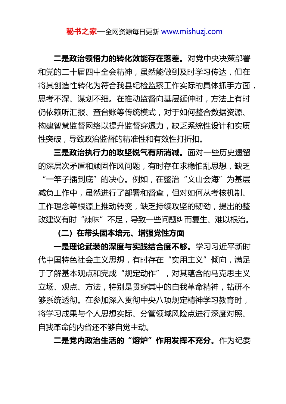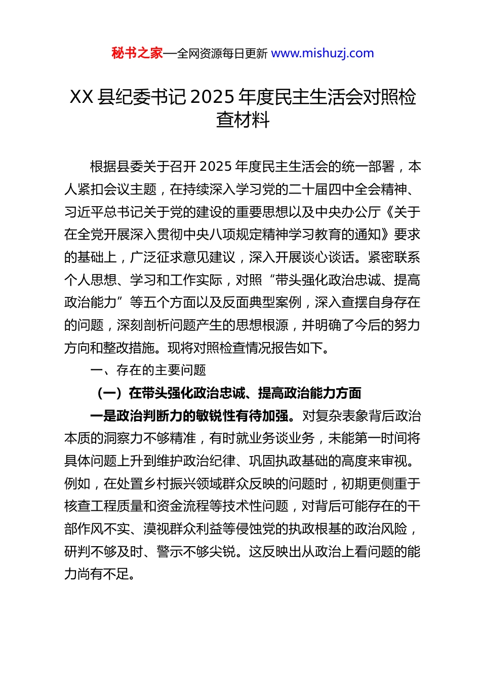 秘书之家—全网资源每日更新 www.mishuzj.comXX 县纪委书记 2025 年度民主生活会对照检查材料根据县委关于召开 2025 年度民主生活会的统一部署,本人紧扣会议主题,在持续深入学习党的二十届四中全会精神、习近平总书记关于党的建设的重要思想以及中央办公厅《关于在全党开展深入贯彻中央八项规定精神学习教育的通知》要求的基础上,广泛征求意见建议,深入开展谈心谈话。紧密联系个人思想、学习和工作实际,对照“带头强化政治忠诚、提高政治能力”等五个方面以及反面典型案例,深入查摆自身存在的问题,深刻剖析问题产生的思想根源,并明确了今后的努力方向和整改措施。现将对照检查情况报告如下。一、存在的主要问题(一)在带头强化政治忠诚、提高政治能力方面一是政治判断力的敏锐性有待加强。对复杂表象背后政治本质的洞察力不够精准,有时就业务谈业务,未能第一时间将具体问题上升到维护政治纪律、巩固执政基础的高度来审视。例如,在处置乡村振兴领域群众反映的问题时,初期更侧重于核查工程质量和资金流程等技术性问题,对背后可能存在的干部作风不实、漠视群众利益等侵蚀党的执政根基的政治风险,研判不够及时、警示不够尖锐。这反映出从政治上看问题的能力尚有不足。秘书之家—全网资源每日更新 www.mishuzj.com二是政治领悟力的转化效能存在落差。对党中央决策部署和党的二十届四中全会精神,虽然能做到及时学习传达,但在将其创造性转化为符合我县纪检监察工作实际的具体抓手方面,思考不深、谋划不细。在推动监督向基层延伸时,方法上有时仍依赖听汇报、查台账等传统模式,对于如何整合数据资源、构建智慧监督网络以提升监督穿透力,缺乏系统性设计和实质性突破,导致政治监督的精准性和有效性打折扣。三是政治执行力的攻坚锐气有所消减。面对一些历史遗留的深层次矛盾和顽固作风问题,有时存在求稳怕乱思想,缺乏“一竿子插到底”的决心。例如,在整治“文山会海”为基层减负工作中,虽然进行了部署和督查,但对如何从考核机制、工作理念等根源上推动转变,缺乏持续攻坚的韧劲,提出的整改建议有时“辣味”不足,导致一些问题纠而复生、难以根治。(二)在带头固本培元、增强党性方面一是理论武装的深度与实践结合度不够。学习习近平新时代中国特色社会主义思想,有时存在“实用主义”倾向,满足于了解基本观点和完成“规定动作”,对其蕴含的马克思主义立场、观点、方法,特别是贯穿其中的自我革命精神,钻研不够系统透彻。在参加深入贯彻中央八项规定精神学习教育时,将学习成果与个人思想实际、分管领域风险点进行深度对照、自我革命的内省还不够自觉主动。二是党内政治生活的“熔炉”作用发挥不充分。作为纪委秘书之家—全网资源每日更新 www.mishuzj.com书记,在参加民主生活会或组织生活会时,有时不自觉地更多扮演“监督者”角色,主动将自己摆进去“亮丑揭短”的勇气不足。自我批评多停留在工作层面,对思想根源、党性修养层面的深层次问题触及较少、剖析不深,接受同志批评帮助的主动性有待提高。三是理想信念的“压舱石”作用偶有松动。面对反腐败斗争取得压倒性胜利的形势,有时会产生“可以松口气、歇歇脚”的细微松懈心态。例如,在谋划工作时,曾潜意识认为显性腐败已大为减少,考虑过适当调整查办案件与廉政教育的权重。这实质上是对反腐败斗争的长期性、复杂性、艰巨性认识不够深刻,革命意志需要持续砥砺的表现。(三)在带头敬畏人民、敬畏组织、敬畏法纪方面一是践行群众路线不够扎实深入。“四下基层”制度落实中,有时存在“走形”多于“走心”的问题。下基层调研,与乡镇干部、党员代表座谈多,随机走访普通农户、倾听最原生态民声少,“坐在车里转、隔着玻璃看”的情况依然存在。这使得对群众“急难愁盼”的把握不够精准鲜活,监督工作未能完全植根于最深厚的群众土壤。二是执行组织程序的刚性偶有折扣。总体上能遵守组织原则,但在处理一些自认为非原则性、时效性强的事务时,有时为了“提高效率”而简化程序。例如,对干部进行提醒谈话,曾有过以电话沟通代替规范书面程序的情况。这反映出对组织秘书之家—全网资源每日更新 www...