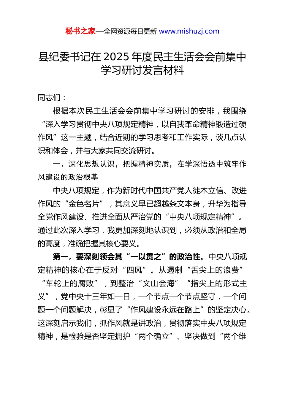 秘书之家—全网资源每日更新 www.mishuzj.com县纪委书记在 2025 年度民主生活会会前集中学习研讨发言材料同志们:根据本次民主生活会会前集中学习研讨的安排,我围绕“深入学习贯彻中央八项规定精神,以自我革命精神锻造过硬作风”这一主题,结合近期的学习思考和工作实际,谈几点认识和体会,并与大家共同交流研讨。一、深化思想认识,把握精神实质,在学深悟透中筑牢作风建设的政治根基中央八项规定,作为新时代中国共产党人徙木立信、改进作风的“金色名片”,其意义早已超越条文本身,升华为指导全党作风建设、推进全面从严治党的“中央八项规定精神”。通过此次深入学习,我更加深刻地认识到,必须从政治和全局的高度,准确把握其核心要义。第一,要深刻领会其“一以贯之”的政治性。中央八项规定精神的核心在于反对“四风”。从遏制“舌尖上的浪费”“车轮上的腐败”,到整治“文山会海”“指尖上的形式主义”,党中央十三年如一日,一个节点一个节点坚守,一个问题一个问题解决,彰显了“作风建设永远在路上”的坚定决心。这深刻启示我们,抓作风就是讲政治,贯彻落实中央八项规定精神,是检验是否坚定拥护“两个确立”、坚决做到“两个维秘书之家—全网资源每日更新 www.mishuzj.com护”的重要标尺。作为县级纪检监察机关,我们必须把落实中央八项规定精神作为政治监督的重点,确保党中央的铁规矩、硬杠杠在基层不折不扣落地生根。第二,要准确把握其“标本兼治”的系统性。中央八项规定精神不仅是行为规范,更是思想武器和制度遵循。它强调“以上率下、以身作则”,突出“求真务实、联系实际”,追求“常态长效、动真碰硬”。这要求我们不能满足于一时一事的纠治,而要将严的要求融入日常、抓在经常,推动作风建设从“集中整治”走向“常态长效”。我们必须坚持“当下改”与“长久立”相结合,通过健全制度机制,固化作风建设成果。第三,要清醒认识其“风腐同源”的关联性。不正之风是滋生腐败的温床,腐败问题往往始于作风失守。中央纪委国家监委强调要“健全不正之风和腐败问题同查同治机制”。从查处案例看,违规吃喝、违规收送礼品礼金等作风问题,极易演变为权钱交易的腐败问题。2025 年上半年,全国查处的违规收送名贵特产和礼品礼金问题,占享乐主义、奢靡之风问题的53.3%;8 月份,该比例仍高达 53.4%。这警示我们,必须树立“风腐同查”的思维,在审查调查中既查腐败问题,也深挖背后的“四风”根源,以“同治”铲除风腐共生的土壤。二、坚持问题导向,敢于揭短亮丑,在对照反思中找准作风建设的靶向问题对照中央八项规定精神的高标准、严要求,结合我县纪检秘书之家—全网资源每日更新 www.mishuzj.com监察工作实际和自身职责,我认为当前在作风建设方面,特别是我们纪委监委内部和所监督的领域中,仍存在一些亟待警惕和解决的问题。结合全国查处数据和我县实际,主要体现在以下几个方面:(一)形式主义、官僚主义问题仍然顽固,为基层减负需持续用力。从全国数据看,形式主义、官僚主义问题占比高,且在履职尽责、服务发展方面“不担当、不作为、乱作为、假作为”的问题尤为突出。具体到我县,一些现象仍需警惕:一是“文山会海”存在反弹回潮的隐忧,会议统筹不够、文件照搬照转的情况偶有发生,无形中加重了基层负担。二是在监督执纪中,有时存在“重痕迹、轻实效”的倾向,过度依赖报表和材料,深入一线“解剖麻雀”、解决实际问题的穿透力有待加强。三是面对推动高质量发展的新任务,部分干部存在“本领恐慌”,在运用新理念、新方法开展精准监督、保障政策落地方面,思路不宽、办法不多,存在一定的“路径依赖”。(二)享乐主义、奢靡之风隐形变异,防反弹回潮需警钟长鸣。经过持续整治,明目张胆的“四风”问题得到遏制,但穿上“隐身衣”、躲进“青纱帐”的现象不容忽视。例如:违规收送礼品礼金以快递物流、“电子红包”等隐蔽方式进行;违规吃喝转入内部食堂、私人会所或由企业老板“埋单”,搞“精致走账”。我县虽未发现严重问题,但苗头性、倾向性的风险依然存在。节假日期间,以“人情往来”为名收受管理服秘书之家—全网资源每日更新...