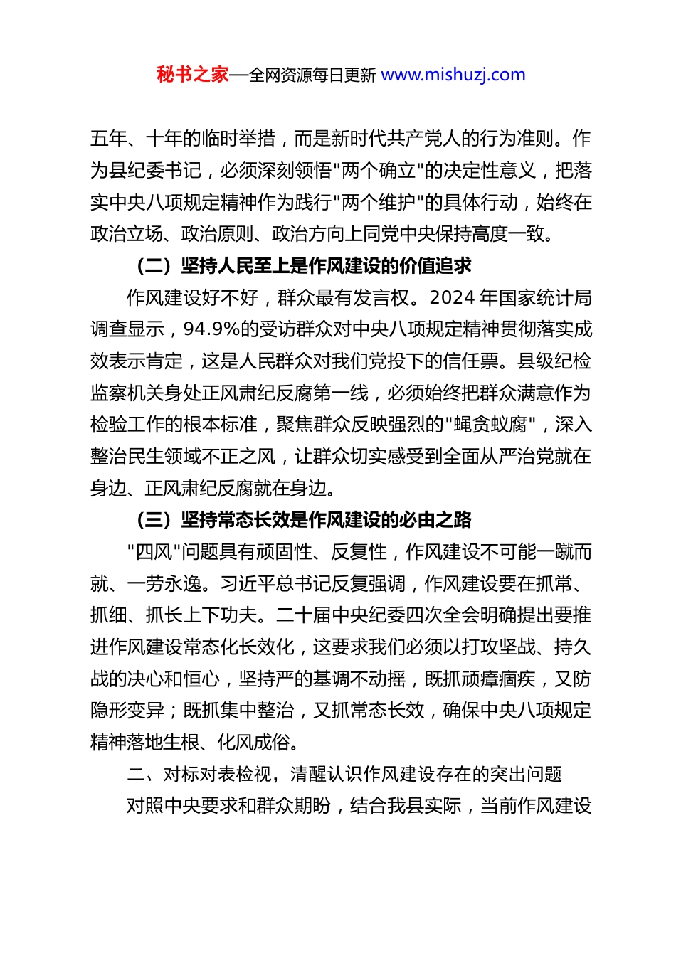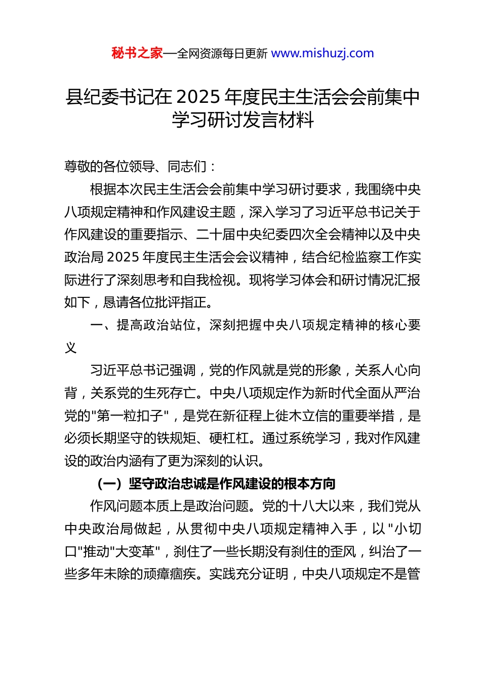 秘书之家—全网资源每日更新 www.mishuzj.com县纪委书记在 2025 年度民主生活会会前集中学习研讨发言材料尊敬的各位领导、同志们:根据本次民主生活会会前集中学习研讨要求,我围绕中央八项规定精神和作风建设主题,深入学习了习近平总书记关于作风建设的重要指示、二十届中央纪委四次全会精神以及中央政治局 2025 年度民主生活会会议精神,结合纪检监察工作实际进行了深刻思考和自我检视。现将学习体会和研讨情况汇报如下,恳请各位批评指正。一、提高政治站位,深刻把握中央八项规定精神的核心要义习近平总书记强调,党的作风就是党的形象,关系人心向背,关系党的生死存亡。中央八项规定作为新时代全面从严治党的"第一粒扣子",是党在新征程上徙木立信的重要举措,是必须长期坚守的铁规矩、硬杠杠。通过系统学习,我对作风建设的政治内涵有了更为深刻的认识。(一)坚守政治忠诚是作风建设的根本方向作风问题本质上是政治问题。党的十八大以来,我们党从中央政治局做起,从贯彻中央八项规定精神入手,以 "小切口"推动"大变革",刹住了一些长期没有刹住的歪风,纠治了一些多年未除的顽瘴痼疾。实践充分证明,中央八项规定不是管秘书之家—全网资源每日更新 www.mishuzj.com五年、十年的临时举措,而是新时代共产党人的行为准则。作为县纪委书记,必须深刻领悟"两个确立"的决定性意义,把落实中央八项规定精神作为践行"两个维护"的具体行动,始终在政治立场、政治原则、政治方向上同党中央保持高度一致。(二)坚持人民至上是作风建设的价值追求作风建设好不好,群众最有发言权。2024 年国家统计局调查显示,94.9%的受访群众对中央八项规定精神贯彻落实成效表示肯定,这是人民群众对我们党投下的信任票。县级纪检监察机关身处正风肃纪反腐第一线,必须始终把群众满意作为检验工作的根本标准,聚焦群众反映强烈的"蝇贪蚁腐",深入整治民生领域不正之风,让群众切实感受到全面从严治党就在身边、正风肃纪反腐就在身边。(三)坚持常态长效是作风建设的必由之路"四风"问题具有顽固性、反复性,作风建设不可能一蹴而就、一劳永逸。习近平总书记反复强调,作风建设要在抓常、抓细、抓长上下功夫。二十届中央纪委四次全会明确提出要推进作风建设常态化长效化,这要求我们必须以打攻坚战、持久战的决心和恒心,坚持严的基调不动摇,既抓顽瘴痼疾,又防隐形变异;既抓集中整治,又抓常态长效,确保中央八项规定精神落地生根、化风成俗。二、对标对表检视,清醒认识作风建设存在的突出问题对照中央要求和群众期盼,结合我县实际,当前作风建设秘书之家—全网资源每日更新 www.mishuzj.com仍存在一些不容忽视的问题,需要我们高度警惕、靶向纠治。(一)思想认识仍有偏差少数党员干部对中央八项规定精神的严肃性认识不足,存在"松劲歇脚、疲劳厌战"的情绪,认为作风建设是"老生常谈",对隐形变异的"四风"问题警惕性不高。有的存在"小事小节论"错误思想,认为吃点喝点、收点拿点不算什么,殊不知腐败问题往往从作风失范开始,从小节失守演变而来。个别领导干部对作风建设的政治意义把握不准,履行"一岗双责"不到位,对分管领域作风问题不敢管、不愿管。(二)突出问题仍有反弹从我县查处情况看,形式主义、官僚主义仍有反弹回潮迹象,有的地方不顾实际搞政绩工程,存在"数字政绩""虚假政绩"等问题;有的部门"指尖上的形式主义""笔尖上的形式主义"依然存在,加重基层负担。享乐主义、奢靡之风隐形变异问题不容忽视,违规吃喝转入隐蔽场所,通过快递送礼、电子红包等方式收送礼品礼金的现象偶有发生。群众身边的作风和腐败问题仍需深化整治,在乡村振兴、医保社保、养老服务等领域,侵害群众利益的"微腐败"还未彻底根除。(三)监督效能仍有短板监督体系协同性不够,"四项监督"统筹衔接不够紧密,纪检监察监督与职能部门监管存在脱节现象。监督方式创新不足,对隐形变异"四风"问题的发现能力有待提升,大数据等信息化秘书之家—全网资源每日更新 www.mishuzj.com监督手段运用不够充分。风腐同查同治机制不够健全,对作风问题背后的腐败线索深挖细查不够,未能有效阻断由风及腐的演变...