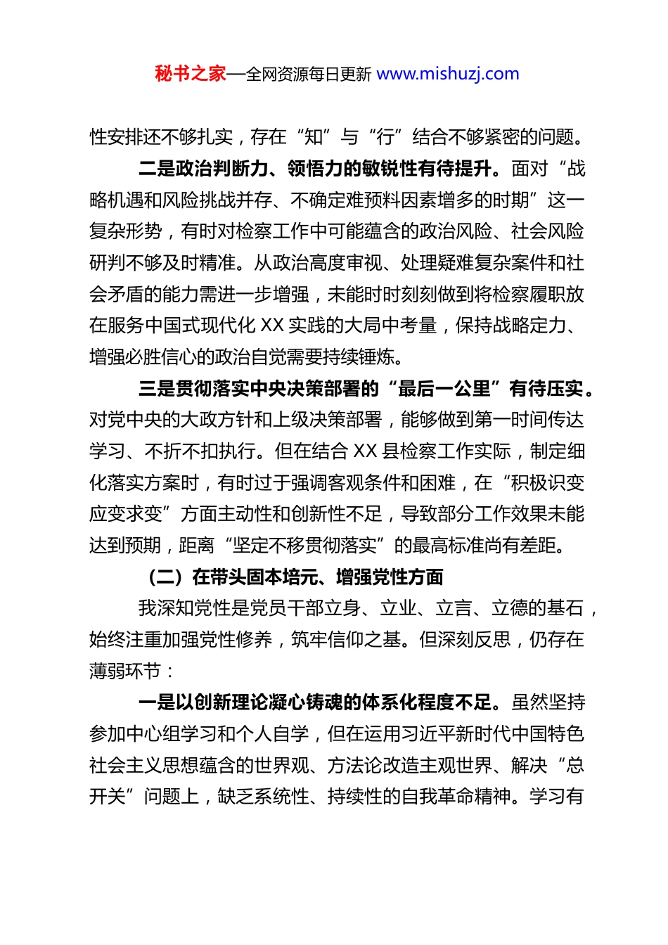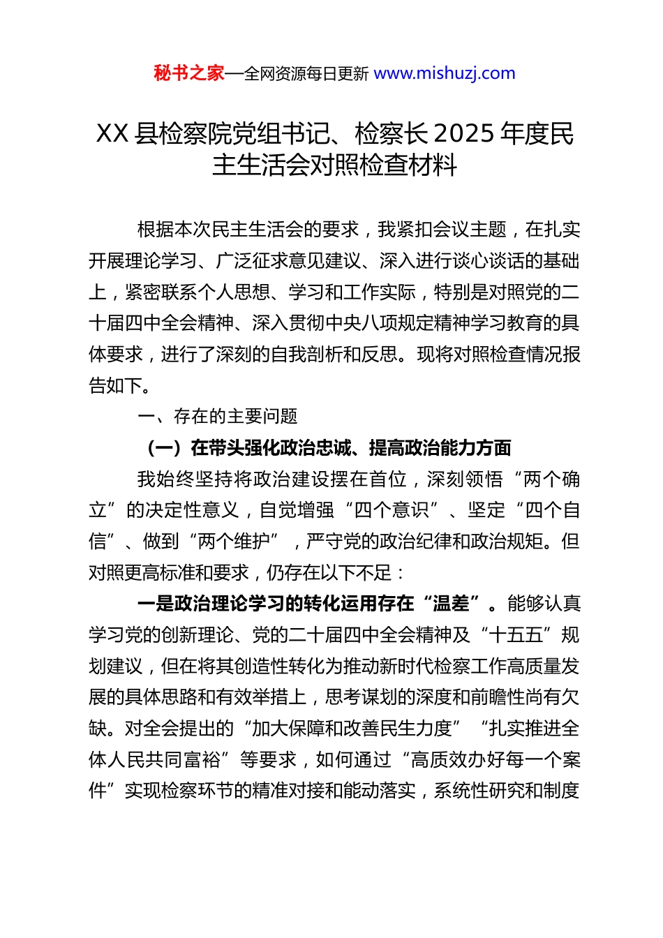 秘书之家—全网资源每日更新 www.mishuzj.comXX 县检察院党组书记、检察长 2025 年度民主生活会对照检查材料根据本次民主生活会的要求,我紧扣会议主题,在扎实开展理论学习、广泛征求意见建议、深入进行谈心谈话的基础上,紧密联系个人思想、学习和工作实际,特别是对照党的二十届四中全会精神、深入贯彻中央八项规定精神学习教育的具体要求,进行了深刻的自我剖析和反思。现将对照检查情况报告如下。一、存在的主要问题(一)在带头强化政治忠诚、提高政治能力方面我始终坚持将政治建设摆在首位,深刻领悟“两个确立”的决定性意义,自觉增强“四个意识”、坚定“四个自信”、做到“两个维护”,严守党的政治纪律和政治规矩。但对照更高标准和要求,仍存在以下不足:一是政治理论学习的转化运用存在“温差”。能够认真学习党的创新理论、党的二十届四中全会精神及“十五五”规划建议,但在将其创造性转化为推动新时代检察工作高质量发展的具体思路和有效举措上,思考谋划的深度和前瞻性尚有欠缺。对全会提出的“加大保障和改善民生力度”“扎实推进全体人民共同富裕”等要求,如何通过“高质效办好每一个案件”实现检察环节的精准对接和能动落实,系统性研究和制度秘书之家—全网资源每日更新 www.mishuzj.com性安排还不够扎实,存在“知”与“行”结合不够紧密的问题。二是政治判断力、领悟力的敏锐性有待提升。面对“战略机遇和风险挑战并存、不确定难预料因素增多的时期”这一复杂形势,有时对检察工作中可能蕴含的政治风险、社会风险研判不够及时精准。从政治高度审视、处理疑难复杂案件和社会矛盾的能力需进一步增强,未能时时刻刻做到将检察履职放在服务中国式现代化 XX 实践的大局中考量,保持战略定力、增强必胜信心的政治自觉需要持续锤炼。三是贯彻落实中央决策部署的“最后一公里”有待压实。对党中央的大政方针和上级决策部署,能够做到第一时间传达学习、不折不扣执行。但在结合 XX 县检察工作实际,制定细化落实方案时,有时过于强调客观条件和困难,在“积极识变应变求变”方面主动性和创新性不足,导致部分工作效果未能达到预期,距离“坚定不移贯彻落实”的最高标准尚有差距。(二)在带头固本培元、增强党性方面我深知党性是党员干部立身、立业、立言、立德的基石,始终注重加强党性修养,筑牢信仰之基。但深刻反思,仍存在薄弱环节:一是以创新理论凝心铸魂的体系化程度不足。虽然坚持参加中心组学习和个人自学,但在运用习近平新时代中国特色社会主义思想蕴含的世界观、方法论改造主观世界、解决“总开关”问题上,缺乏系统性、持续性的自我革命精神。学习有秘书之家—全网资源每日更新 www.mishuzj.com时停留在“读过了”“学过了”层面,距离“凝心铸魂”、真正内化为坚定的政治信仰、价值追求和行动自觉,还有提升空间。二是党性锻炼的主动性和斗争性有所弱化。在严肃的党内政治生活中,有时存在“老好人”思想,运用批评和自我批评武器不够经常、不够有力。对照党章党规党纪进行自我检视、自我约束的主动性偶有松懈,对自身存在的一些思想“尘埃”和作风“小节”警惕性不高,用党性原则“修身律己”的螺丝拧得不够紧。三是理想信念教育融入日常检察业务不够深入。在抓班子、带队伍过程中,对干警的理想信念教育、忠诚教育多依托于集中学习和会议传达,未能完全将“坚定理想信念、筑牢对党忠诚、厚植为民情怀”的要求无缝嵌入到案件办理、法律监督、群众工作的全流程,思想政治工作的针对性和感染力有待加强。(三)在带头敬畏人民、敬畏组织、敬畏法纪方面我始终铭记权力来自人民,恪守组织原则,尊崇宪法法律。但对照“四下基层”和新时代群众路线要求,仍有改进之处:一是践行“四下基层”制度的深度和广度有待拓展。虽然定期开展调研走访,但有时“走马观花”多于“下马看花”,真正“蹲下去”了解群众“急难愁盼”问题的时间和精力投入秘书之家—全网资源每日更新 www.mishuzj.com不足。调研成果转化为解决实际问题、完善惠民政策的有效举措不多,服务群众“最后一公里”的质效有待提升。二是贯彻民主集中制的质量有待提高。在党组议事决...