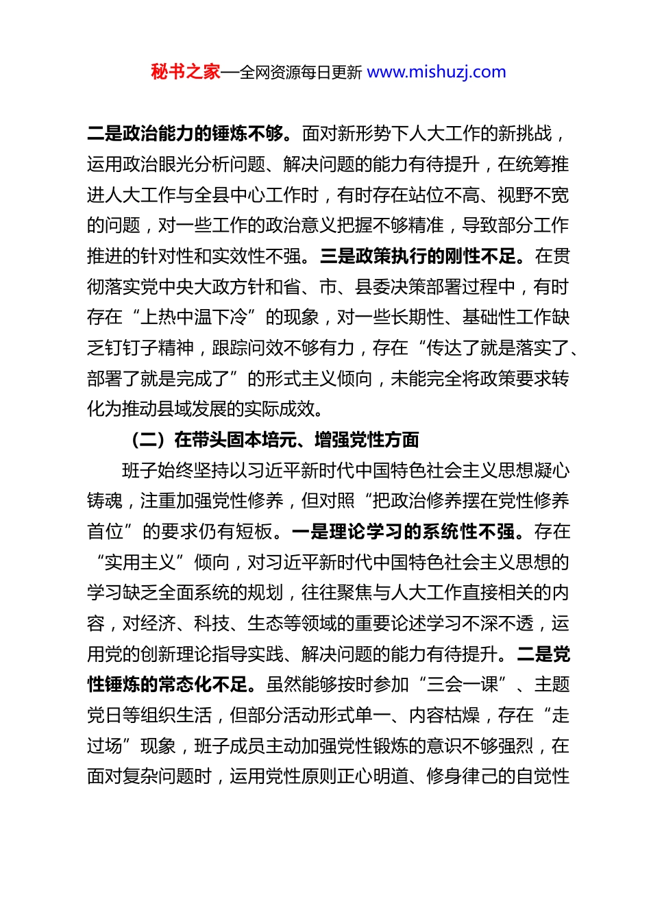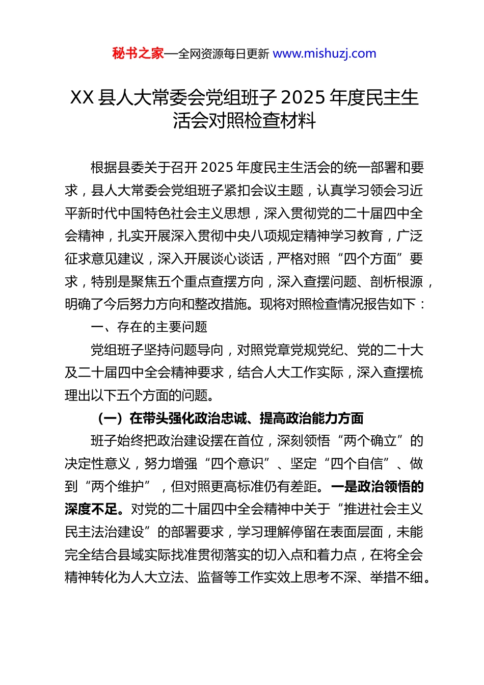 秘书之家—全网资源每日更新 www.mishuzj.comXX 县人大常委会党组班子 2025 年度民主生活会对照检查材料根据县委关于召开 2025 年度民主生活会的统一部署和要求,县人大常委会党组班子紧扣会议主题,认真学习领会习近平新时代中国特色社会主义思想,深入贯彻党的二十届四中全会精神,扎实开展深入贯彻中央八项规定精神学习教育,广泛征求意见建议,深入开展谈心谈话,严格对照“四个方面”要求,特别是聚焦五个重点查摆方向,深入查摆问题、剖析根源,明确了今后努力方向和整改措施。现将对照检查情况报告如下:一、存在的主要问题党组班子坚持问题导向,对照党章党规党纪、党的二十大及二十届四中全会精神要求,结合人大工作实际,深入查摆梳理出以下五个方面的问题。(一)在带头强化政治忠诚、提高政治能力方面班子始终把政治建设摆在首位,深刻领悟“两个确立”的决定性意义,努力增强“四个意识”、坚定“四个自信”、做到“两个维护”,但对照更高标准仍有差距。一是政治领悟的深度不足。对党的二十届四中全会精神中关于“推进社会主义民主法治建设”的部署要求,学习理解停留在表面层面,未能完全结合县域实际找准贯彻落实的切入点和着力点,在将全会精神转化为人大立法、监督等工作实效上思考不深、举措不细。秘书之家—全网资源每日更新 www.mishuzj.com二是政治能力的锤炼不够。面对新形势下人大工作的新挑战,运用政治眼光分析问题、解决问题的能力有待提升,在统筹推进人大工作与全县中心工作时,有时存在站位不高、视野不宽的问题,对一些工作的政治意义把握不够精准,导致部分工作推进的针对性和实效性不强。三是政策执行的刚性不足。在贯彻落实党中央大政方针和省、市、县委决策部署过程中,有时存在“上热中温下冷”的现象,对一些长期性、基础性工作缺乏钉钉子精神,跟踪问效不够有力,存在“传达了就是落实了、部署了就是完成了”的形式主义倾向,未能完全将政策要求转化为推动县域发展的实际成效。(二)在带头固本培元、增强党性方面班子始终坚持以习近平新时代中国特色社会主义思想凝心铸魂,注重加强党性修养,但对照“把政治修养摆在党性修养首位”的要求仍有短板。一是理论学习的系统性不强。存在“实用主义”倾向,对习近平新时代中国特色社会主义思想的学习缺乏全面系统的规划,往往聚焦与人大工作直接相关的内容,对经济、科技、生态等领域的重要论述学习不深不透,运用党的创新理论指导实践、解决问题的能力有待提升。二是党性锤炼的常态化不足。虽然能够按时参加“三会一课”、主题党日等组织生活,但部分活动形式单一、内容枯燥,存在“走过场”现象,班子成员主动加强党性锻炼的意识不够强烈,在面对复杂问题时,运用党性原则正心明道、修身律己的自觉性秘书之家—全网资源每日更新 www.mishuzj.com有待提高。三是理想信念的坚守不够坚定。在面对工作中的困难和挫折时,个别班子成员存在畏难情绪,缺乏“逢山开路、遇水架桥”的斗争精神,对共产党人的精神追求感悟不深,未能始终以饱满的热情和坚定的信念投身于人大事业。(三)在带头敬畏人民、敬畏组织、敬畏法纪方面班子始终坚持人民至上理念,严守组织纪律和法律法规,但对照“三个敬畏”的要求仍存在薄弱环节。一是联系群众的深度和广度不足。落实“四下基层”制度不够扎实,调研存在“走马观花”现象,往往是听汇报多、看亮点多,深入基层、深入群众了解真实情况、倾听群众呼声不够,对群众反映强烈的教育、医疗、养老等急难愁盼问题,跟踪监督不够到位,未能及时推动问题得到有效解决。二是民主集中制执行不够严格。在重大事项决策过程中,虽然能够按照议事决策规则推进,但有时存在“先定调后讨论”的情况,个别班子成员发表意见不够主动充分,存在“随大流”现象,对一些专业性较强的问题,征求专家意见不够广泛,决策的科学性有待提升。三是纪律规矩的敬畏之心不够强烈。对党风廉政建设的重要性认识不够深刻,存在“人大机关权力小、风险低”的麻痹思想,对班子成员和机关干部的日常监督管理不够严格,特别是对“八小时以外”的监督存在盲区,对一些小节问题提醒不够、批评不严...