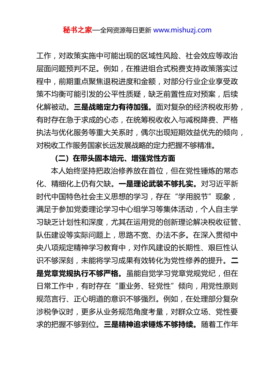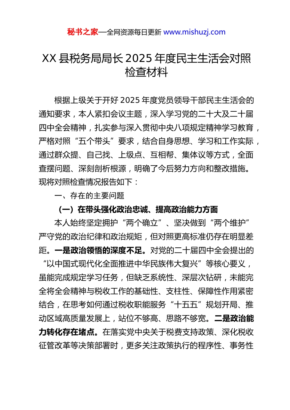 秘书之家—全网资源每日更新 www.mishuzj.comXX 县税务局局长 2025 年度民主生活会对照检查材料根据上级关于开好 2025 年度党员领导干部民主生活会的通知要求,本人紧扣会议主题,深入学习党的二十大及二十届四中全会精神,扎实参与深入贯彻中央八项规定精神学习教育,严格对照“五个带头”要求,结合自身思想、学习和工作实际,通过群众提、自己找、上级点、互相帮、集体议等方式,全面查摆问题、深刻剖析根源,明确了今后努力方向和整改措施。现将对照检查情况报告如下:一、存在的主要问题(一)在带头强化政治忠诚、提高政治能力方面本人始终坚定拥护“两个确立”、坚决做到“两个维护”严守党的政治纪律和政治规矩,但对照更高标准仍存在明显差距。一是政治领悟的深度不足。对党的二十届四中全会提出的“以中国式现代化全面推进中华民族伟大复兴”等核心要义,虽能完成规定学习任务,但缺乏系统性、深层次钻研,未能完全将全会精神与税收工作的基础性、支柱性、保障性作用紧密结合,在思考如何通过税收职能服务“十五五”规划开局、推动区域高质量发展上,站位不够高、思路不够宽。二是政治能力转化存在堵点。在落实党中央关于税费支持政策、深化税收征管改革等决策部署时,更多关注政策执行的程序性、事务性秘书之家—全网资源每日更新 www.mishuzj.com工作,对政策实施中可能出现的区域性风险、社会效应等政治层面问题预判不足。例如,在推进组合式税费支持政策落实过程中,前期重点聚焦退税进度和金额,对部分行业企业享受政策不均衡可能引发的公平性质疑,缺乏前置性应对预案,后续化解被动。三是战略定力有待加强。面对复杂的经济税收形势,有时存在急于求成的心态,在统筹税收收入与减税降费、严格执法与优化服务等重大关系时,偶尔出现短期效益优先的倾向,对税收工作服务国家长远发展战略的定力把握不够精准。(二)在带头固本培元、增强党性方面本人始终坚持把政治修养放在首位,但在党性锤炼的常态化、精细化上仍有欠缺。一是理论武装不够扎实。对习近平新时代中国特色社会主义思想的学习,存在“学用脱节”现象,满足于参加党委理论学习中心组学习等集体活动,个人自主学习缺乏计划性和深度,尤其在运用党的创新理论解决税收征管、队伍建设等实际问题上,思路不宽、办法不多。在深入贯彻中央八项规定精神学习教育中,对作风建设的长期性、艰巨性认识不够深刻,未能将学习成果有效转化为党性修养的提升。二是党章党规执行不够严格。虽能自觉学习党章党规党纪,但在日常工作中,有时存在“重业务、轻党性”倾向,用党性原则规范言行、正心明道的意识不够强烈。例如,在处理部分复杂涉税争议时,更多从业务规范角度考量,对群众立场、党性要求的把握不够到位。三是精神追求锤炼不够持续。随着工作年秘书之家—全网资源每日更新 www.mishuzj.com限增长,偶尔出现懈怠思想,对“解决好世界观、人生观、价值观总开关问题”的重要性认识有所弱化,在面对工作压力和困难时,攻坚克难的奋斗精神、甘于奉献的宗旨意识有所淡化,缺乏老一辈税务工作者的精神韧劲。(三)在带头敬畏人民、敬畏组织、敬畏法纪方面本人始终坚守基本底线,但在敬畏之心的深度和行动自觉上仍需提升。一是敬畏人民不够彻底。践行新时代群众路线、落实“四下基层”制度不够扎实,深入企业、乡镇调研存在“走马观花”现象,对纳税人缴费人的急难愁盼问题回应不够及时。例如,针对老年人、小微企业办税人员面临的“数字鸿沟”问题,虽推出了一些便民措施,但不够精准高效,电子税务局部分功能操作复杂、咨询辅导不到位等问题仍未根治,第三方满意度调查中相关指标得分偏低。二是敬畏组织存在温差。对组织赋予的领导职责,虽能履职尽责,但在主动向组织汇报思想、工作进展和存在问题上不够及时全面,尤其在推动难点工作时,向上级请示汇报多,主动担当破解难题少。在执行民主集中制方面,主持班子会议时,有时存在先表达个人观点的情况,对班子成员意见的听取和采纳不够充分,防止“一言堂”的警惕性不够高。三是敬畏法纪不够严格。对税收执法权的规范性认识不够深刻,在推进执法规范化建设中,...