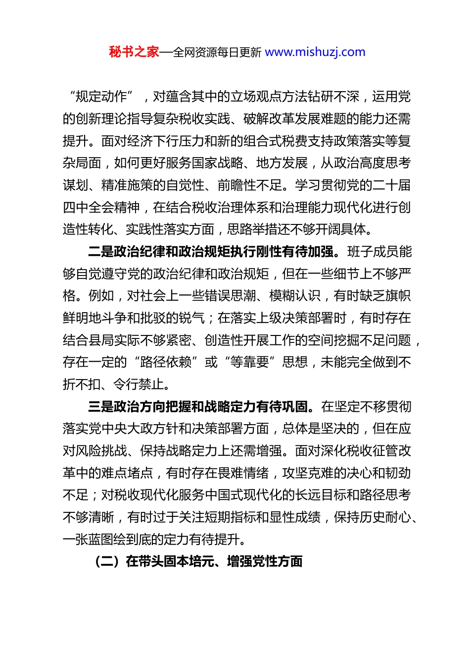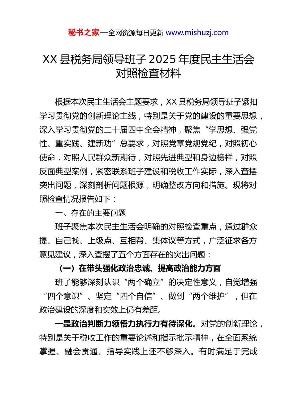 秘书之家—全网资源每日更新 www.mishuzj.comXX 县税务局领导班子 2025 年度民主生活会对照检查材料根据本次民主生活会主题要求,XX 县税务局领导班子紧扣学习贯彻党的创新理论主线,特别是关于党的建设的重要思想,深入学习贯彻党的二十届四中全会精神,聚焦“学思想、强党性、重实践、建新功”总要求,对照党章党规党纪,对照初心使命,对照人民群众新期待,对照先进典型和身边榜样,对照反面典型案例,紧密联系班子建设和税收工作实际,深入查摆突出问题,深刻剖析问题根源,明确整改方向和措施。现将对照检查情况报告如下:一、存在的主要问题班子聚焦本次民主生活会明确的对照检查重点,通过群众提、自己找、上级点、互相帮、集体议等方式,广泛征求各方意见建议,深入查摆了五个方面存在的突出问题:(一)在带头强化政治忠诚、提高政治能力方面班子能够深刻认识“两个确立”的决定性意义,自觉增强“四个意识”、坚定“四个自信”、做到“两个维护”,但在政治建设的深度和实效上仍有差距。一是政治判断力领悟力执行力有待深化。对党的创新理论,特别是关于税收工作的重要论述和指示批示精神,在全面系统掌握、融会贯通、指导实践上还不够深入。有时满足于完成秘书之家—全网资源每日更新 www.mishuzj.com“规定动作”,对蕴含其中的立场观点方法钻研不深,运用党的创新理论指导复杂税收实践、破解改革发展难题的能力还需提升。面对经济下行压力和新的组合式税费支持政策落实等复杂局面,如何更好服务国家战略、地方发展,从政治高度思考谋划、精准施策的自觉性、前瞻性不足。学习贯彻党的二十届四中全会精神,在结合税收治理体系和治理能力现代化进行创造性转化、实践性落实方面,思路举措还不够开阔具体。二是政治纪律和政治规矩执行刚性有待加强。班子成员能够自觉遵守党的政治纪律和政治规矩,但在一些细节上不够严格。例如,对社会上一些错误思潮、模糊认识,有时缺乏旗帜鲜明地斗争和批驳的锐气;在落实上级决策部署时,有时存在结合县局实际不够紧密、创造性开展工作的空间挖掘不足问题,存在一定的“路径依赖”或“等靠要”思想,未能完全做到不折不扣、令行禁止。三是政治方向把握和战略定力有待巩固。在坚定不移贯彻落实党中央大政方针和决策部署方面,总体是坚决的,但在应对风险挑战、保持战略定力上还需增强。面对深化税收征管改革中的难点堵点,有时存在畏难情绪,攻坚克难的决心和韧劲不足;对税收现代化服务中国式现代化的长远目标和路径思考不够清晰,有时过于关注短期指标和显性成绩,保持历史耐心、一张蓝图绘到底的定力有待提升。(二)在带头固本培元、增强党性方面秘书之家—全网资源每日更新 www.mishuzj.com班子注重加强党性锻炼,但对照高标准严要求,在淬炼党性、修身律己上仍需持续用力。一是理论武装的自觉性系统性有待提高。对习近平新时代中国特色社会主义思想的学习,有时存在“用到才学、急用才学”的情况,全面系统、及时跟进学习不够,对其世界观、方法论掌握运用不够娴熟。集中学习多,个人静心研读、深入思考少;学习研讨有时停留在传达层面,联系思想和工作实际碰撞思想、触及灵魂不够深入,运用党的创新理论改造主观世界、解决“总开关”问题的效果有待增强。二是理想信念的根基扎得不够牢固。班子成员理想信念总体是坚定的,但在复杂环境和长期考验面前,有时会出现思想上的“温差”。对标革命先辈和先进典型,自我革命精神、奋斗精神有所弱化;面对社会上的一些不良风气和诱惑,虽然能够守住底线,但防微杜渐的警惕性、抵制“围猎”的自觉性还需时刻绷紧弦。对税收事业的长远发展,有时缺乏“功成不必在我、功成必定有我”的境界和担当。三是党性原则的内化践行有待深化。认真学习党章党规党纪,但在实际工作和生活中,时时处处以党性原则正心明道、修身律己的标尺不够高、不够严。开展批评和自我批评有时“辣味”不足,顾及情面多,真刀真枪少;在执行组织生活制度上,有时存在形式大于内容的问题,党性锻炼的熔炉作用未能充分发挥。在厚植为民情怀方面,虽然坚持“以纳税人和缴秘书之家—全网资源每日更新 www.mishuzj.c...