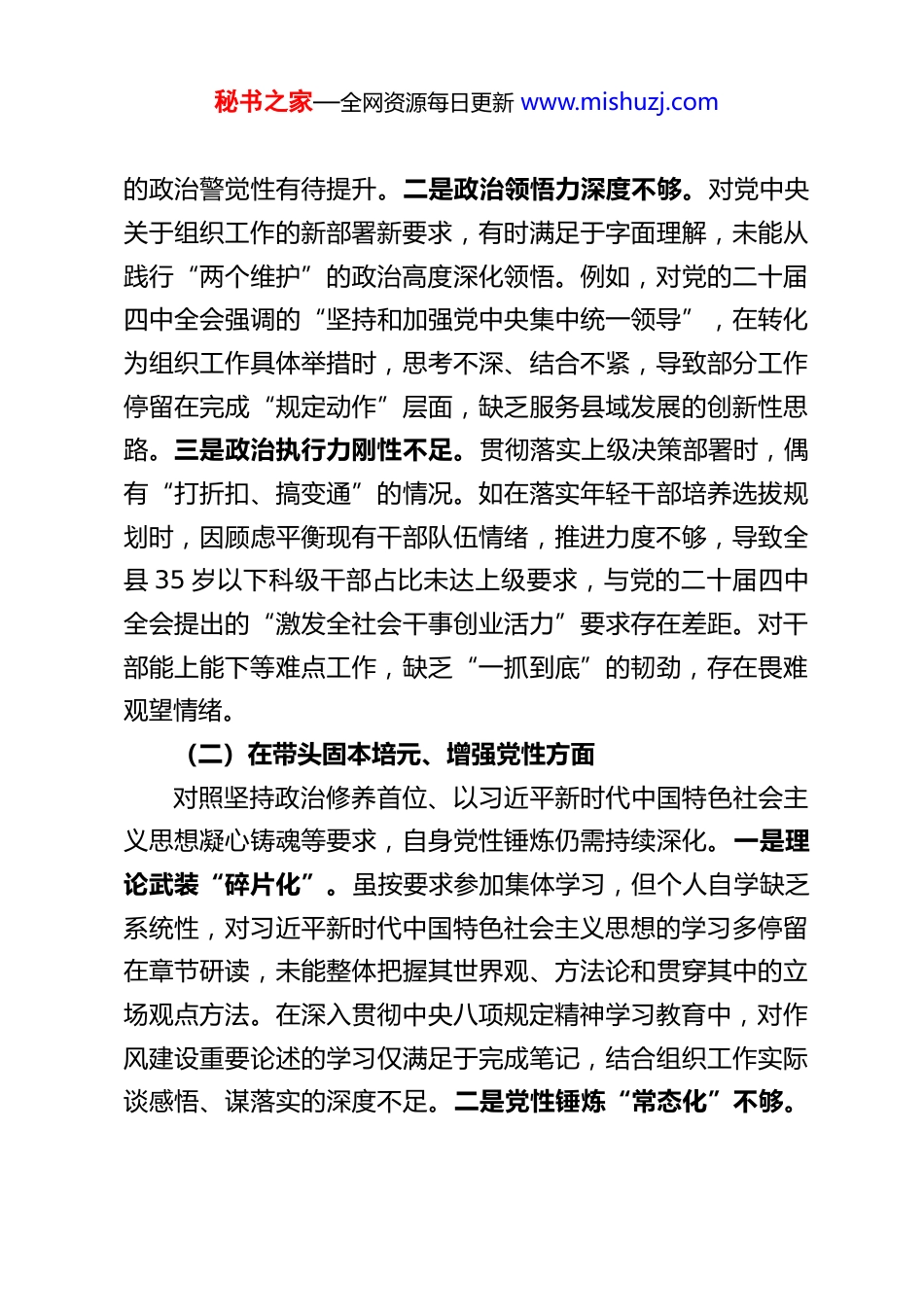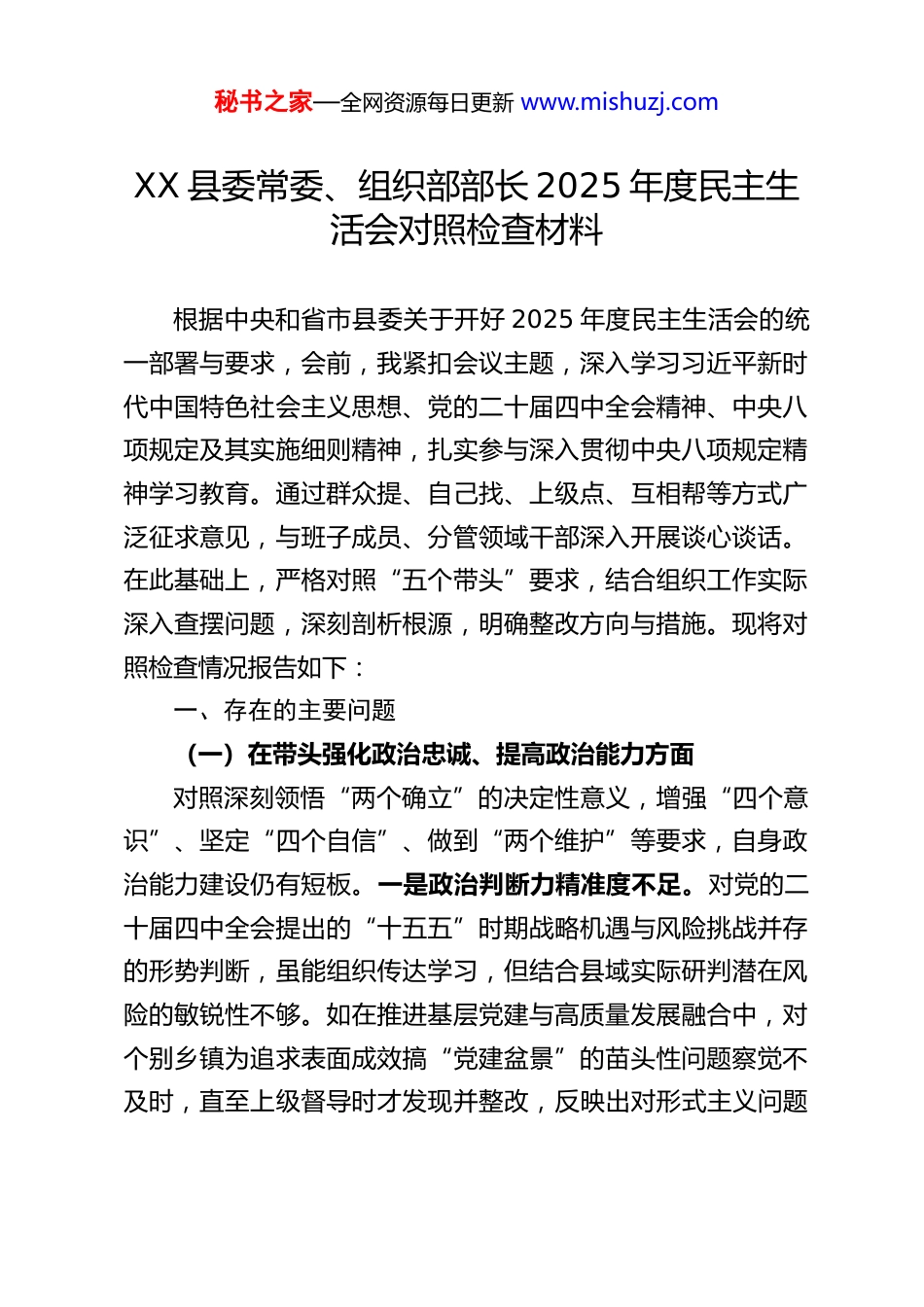 秘书之家—全网资源每日更新 www.mishuzj.comXX 县委常委、组织部部长 2025 年度民主生活会对照检查材料根据中央和省市县委关于开好 2025 年度民主生活会的统一部署与要求,会前,我紧扣会议主题,深入学习习近平新时代中国特色社会主义思想、党的二十届四中全会精神、中央八项规定及其实施细则精神,扎实参与深入贯彻中央八项规定精神学习教育。通过群众提、自己找、上级点、互相帮等方式广泛征求意见,与班子成员、分管领域干部深入开展谈心谈话。在此基础上,严格对照“五个带头”要求,结合组织工作实际深入查摆问题,深刻剖析根源,明确整改方向与措施。现将对照检查情况报告如下:一、存在的主要问题(一)在带头强化政治忠诚、提高政治能力方面对照深刻领悟“两个确立”的决定性意义,增强“四个意识”、坚定“四个自信”、做到“两个维护”等要求,自身政治能力建设仍有短板。一是政治判断力精准度不足。对党的二十届四中全会提出的“十五五”时期战略机遇与风险挑战并存的形势判断,虽能组织传达学习,但结合县域实际研判潜在风险的敏锐性不够。如在推进基层党建与高质量发展融合中,对个别乡镇为追求表面成效搞“党建盆景”的苗头性问题察觉不及时,直至上级督导时才发现并整改,反映出对形式主义问题秘书之家—全网资源每日更新 www.mishuzj.com的政治警觉性有待提升。二是政治领悟力深度不够。对党中央关于组织工作的新部署新要求,有时满足于字面理解,未能从践行“两个维护”的政治高度深化领悟。例如,对党的二十届四中全会强调的“坚持和加强党中央集中统一领导”,在转化为组织工作具体举措时,思考不深、结合不紧,导致部分工作停留在完成“规定动作”层面,缺乏服务县域发展的创新性思路。三是政治执行力刚性不足。贯彻落实上级决策部署时,偶有“打折扣、搞变通”的情况。如在落实年轻干部培养选拔规划时,因顾虑平衡现有干部队伍情绪,推进力度不够,导致全县 35 岁以下科级干部占比未达上级要求,与党的二十届四中全会提出的“激发全社会干事创业活力”要求存在差距。对干部能上能下等难点工作,缺乏“一抓到底”的韧劲,存在畏难观望情绪。(二)在带头固本培元、增强党性方面对照坚持政治修养首位、以习近平新时代中国特色社会主义思想凝心铸魂等要求,自身党性锤炼仍需持续深化。一是理论武装“碎片化”。虽按要求参加集体学习,但个人自学缺乏系统性,对习近平新时代中国特色社会主义思想的学习多停留在章节研读,未能整体把握其世界观、方法论和贯穿其中的立场观点方法。在深入贯彻中央八项规定精神学习教育中,对作风建设重要论述的学习仅满足于完成笔记,结合组织工作实际谈感悟、谋落实的深度不足。二是党性锤炼“常态化”不够。秘书之家—全网资源每日更新 www.mishuzj.com随着工作年限增长,偶尔放松对主观世界的改造,艰苦奋斗精神有所弱化。面对组织工作中的历史遗留问题,有时存在“求稳怕乱”思想,缺乏焦裕禄式“啃硬骨头”的拼劲。如在整治部分基层党组织软弱涣散问题时,因担心引发矛盾,过度强调“稳步推进”,导致整改周期超出预期,党性修养的实践性有待加强。三是组织生活“战斗性”不足。参加民主生活会和组织生活时,开展批评与自我批评存在“辣味”不够的问题。对同志存在的问题多以“提醒建议”代替“严肃批评”,怕伤和气;对自身问题有时避重就轻,未能真正达到“红脸出汗、排毒治病”的效果,与党章党规要求的党性原则存在差距。(三)在带头敬畏人民、敬畏组织、敬畏法纪方面对照走好新时代群众路线、执行民主集中制、筑牢拒腐防变堤坝等要求,自身作风建设仍有薄弱环节。一是敬畏人民的宗旨意识不够牢固。落实“四下基层”制度不够扎实,深入乡镇、村社、企业调研存在“走马观花”现象,面对面倾听党员群众诉求不足。如在制定人才引进政策时,重点关注薪酬待遇等“硬指标”,但对引进人才子女教育、医疗保障等“软需求”调研不深,导致部分政策吸引力不足,未能充分体现以人民为中心的发展思想。二是敬畏组织的规矩意识有待强化。执行民主集中制时,对部分重大事项征求意见不够充分。如在乡镇领导班子调整酝酿中,...