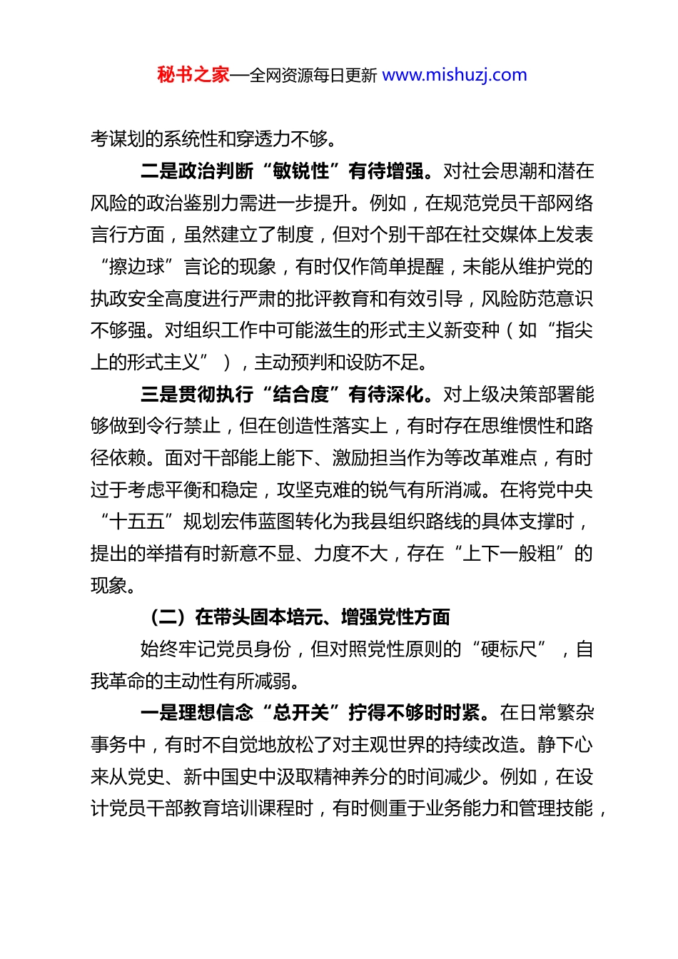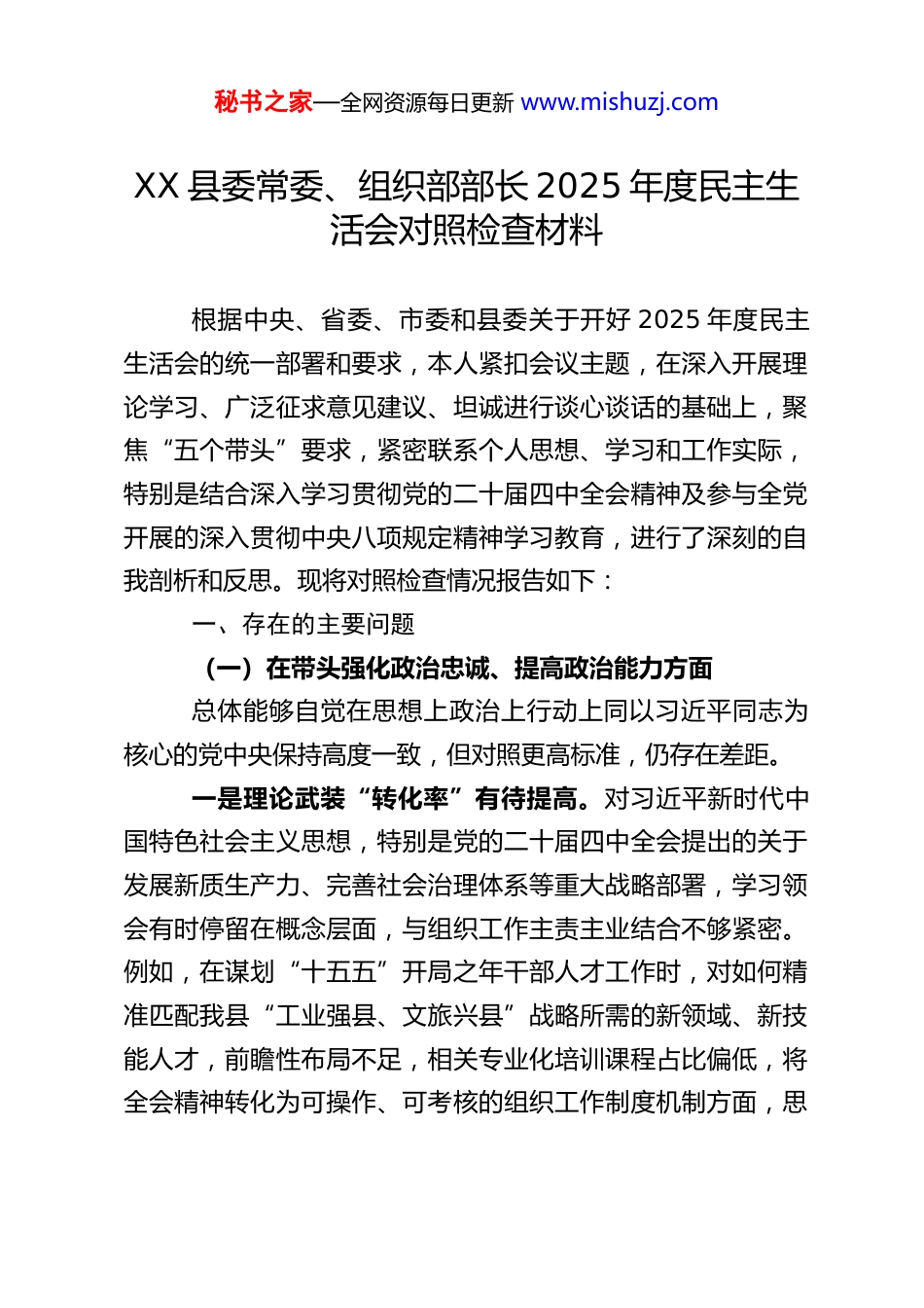 秘书之家—全网资源每日更新 www.mishuzj.comXX 县委常委、组织部部长 2025 年度民主生活会对照检查材料根据中央、省委、市委和县委关于开好 2025 年度民主生活会的统一部署和要求,本人紧扣会议主题,在深入开展理论学习、广泛征求意见建议、坦诚进行谈心谈话的基础上,聚焦“五个带头”要求,紧密联系个人思想、学习和工作实际,特别是结合深入学习贯彻党的二十届四中全会精神及参与全党开展的深入贯彻中央八项规定精神学习教育,进行了深刻的自我剖析和反思。现将对照检查情况报告如下:一、存在的主要问题(一)在带头强化政治忠诚、提高政治能力方面总体能够自觉在思想上政治上行动上同以习近平同志为核心的党中央保持高度一致,但对照更高标准,仍存在差距。一是理论武装“转化率”有待提高。对习近平新时代中国特色社会主义思想,特别是党的二十届四中全会提出的关于发展新质生产力、完善社会治理体系等重大战略部署,学习领会有时停留在概念层面,与组织工作主责主业结合不够紧密。例如,在谋划“十五五”开局之年干部人才工作时,对如何精准匹配我县“工业强县、文旅兴县”战略所需的新领域、新技能人才,前瞻性布局不足,相关专业化培训课程占比偏低,将全会精神转化为可操作、可考核的组织工作制度机制方面,思秘书之家—全网资源每日更新 www.mishuzj.com考谋划的系统性和穿透力不够。二是政治判断“敏锐性”有待增强。对社会思潮和潜在风险的政治鉴别力需进一步提升。例如,在规范党员干部网络言行方面,虽然建立了制度,但对个别干部在社交媒体上发表“擦边球”言论的现象,有时仅作简单提醒,未能从维护党的执政安全高度进行严肃的批评教育和有效引导,风险防范意识不够强。对组织工作中可能滋生的形式主义新变种(如“指尖上的形式主义”),主动预判和设防不足。三是贯彻执行“结合度”有待深化。对上级决策部署能够做到令行禁止,但在创造性落实上,有时存在思维惯性和路径依赖。面对干部能上能下、激励担当作为等改革难点,有时过于考虑平衡和稳定,攻坚克难的锐气有所消减。在将党中央“十五五”规划宏伟蓝图转化为我县组织路线的具体支撑时,提出的举措有时新意不显、力度不大,存在“上下一般粗”的现象。(二)在带头固本培元、增强党性方面始终牢记党员身份,但对照党性原则的“硬标尺”,自我革命的主动性有所减弱。一是理想信念“总开关”拧得不够时时紧。在日常繁杂事务中,有时不自觉地放松了对主观世界的持续改造。静下心来从党史、新中国史中汲取精神养分的时间减少。例如,在设计党员干部教育培训课程时,有时侧重于业务能力和管理技能,秘书之家—全网资源每日更新 www.mishuzj.com对党性修养、理想信念专题教育的比重和感染力谋划不够深入,反映出潜意识里存在“重业务、轻思想”的偏差。二是党性原则“铁标尺”用得不够处处硬。在处理具体问题时,党性原则有时会让位于人情世故或经验主义。比如,在干部考察中,对长期共事、较为熟悉的干部,评价时对其非原则性缺点点得不够深、不够透,影响了考察材料的精准画像。以普通党员身份参加支部组织生活时,有时“指导”心态多于“融入”心态,开展自我批评的深度和“辣味”不足。三是自我修养“净化器”开得不够常常用。对照党章党规党纪进行“吾日三省吾身”的自觉性有所下降。随着职务提升和环境变化,艰苦奋斗、锐意进取的精神状态有所弱化,对“为了谁、依靠谁、我是谁”的根本问题,在思想深处的叩问和警醒不如从前经常。(三)在带头敬畏人民、敬畏组织、敬畏法纪方面能够牢记权力来自人民、属于组织、约束于法纪,但在具体践行中,敬畏之心未能完全贯穿于细枝末节。一是践行群众路线“下实功”不足。虽然落实“四下基层”制度,但有时“身入”有余、“心至”不足。例如,到偏远乡镇调研乡村人才队伍,形成了报告,但对群众反映强烈的“村医队伍青黄不接”等急难愁盼问题,未能建立台账、跟踪督办,形成“发现问题-解决问题-反馈效果”的闭环。在制定人才政策时,对引进人才及其家属在子女教育、医疗等“关键秘书之家—全网资源每日更新 www.mishuzj.com小事”上的需求调研不够深入。...