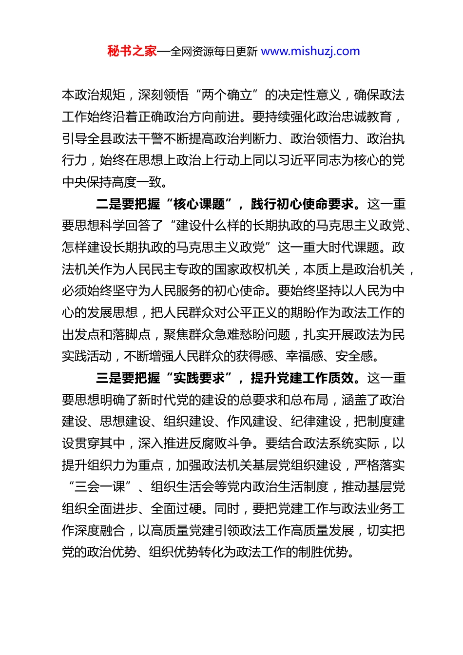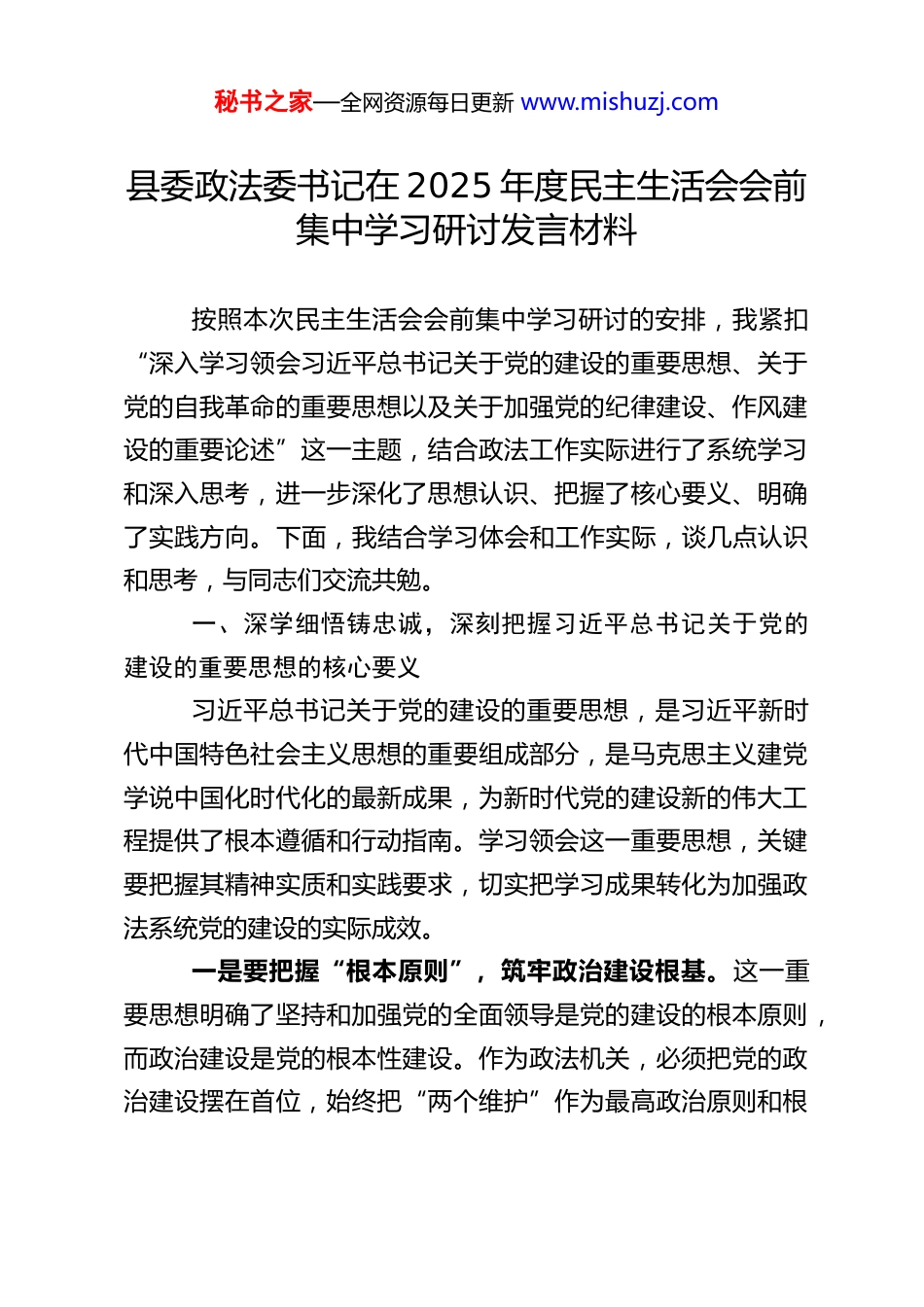 秘书之家—全网资源每日更新 www.mishuzj.com县委政法委书记在 2025 年度民主生活会会前集中学习研讨发言材料按照本次民主生活会会前集中学习研讨的安排,我紧扣“深入学习领会习近平总书记关于党的建设的重要思想、关于党的自我革命的重要思想以及关于加强党的纪律建设、作风建设的重要论述”这一主题,结合政法工作实际进行了系统学习和深入思考,进一步深化了思想认识、把握了核心要义、明确了实践方向。下面,我结合学习体会和工作实际,谈几点认识和思考,与同志们交流共勉。一、深学细悟铸忠诚,深刻把握习近平总书记关于党的建设的重要思想的核心要义习近平总书记关于党的建设的重要思想,是习近平新时代中国特色社会主义思想的重要组成部分,是马克思主义建党学说中国化时代化的最新成果,为新时代党的建设新的伟大工程提供了根本遵循和行动指南。学习领会这一重要思想,关键要把握其精神实质和实践要求,切实把学习成果转化为加强政法系统党的建设的实际成效。一是要把握“根本原则”,筑牢政治建设根基。这一重要思想明确了坚持和加强党的全面领导是党的建设的根本原则,而政治建设是党的根本性建设。作为政法机关,必须把党的政治建设摆在首位,始终把“两个维护”作为最高政治原则和根秘书之家—全网资源每日更新 www.mishuzj.com本政治规矩,深刻领悟“两个确立”的决定性意义,确保政法工作始终沿着正确政治方向前进。要持续强化政治忠诚教育,引导全县政法干警不断提高政治判断力、政治领悟力、政治执行力,始终在思想上政治上行动上同以习近平同志为核心的党中央保持高度一致。二是要把握“核心课题”,践行初心使命要求。这一重要思想科学回答了“建设什么样的长期执政的马克思主义政党、怎样建设长期执政的马克思主义政党”这一重大时代课题。政法机关作为人民民主专政的国家政权机关,本质上是政治机关,必须始终坚守为人民服务的初心使命。要始终坚持以人民为中心的发展思想,把人民群众对公平正义的期盼作为政法工作的出发点和落脚点,聚焦群众急难愁盼问题,扎实开展政法为民实践活动,不断增强人民群众的获得感、幸福感、安全感。三是要把握“实践要求”,提升党建工作质效。这一重要思想明确了新时代党的建设的总要求和总布局,涵盖了政治建设、思想建设、组织建设、作风建设、纪律建设,把制度建设贯穿其中,深入推进反腐败斗争。要结合政法系统实际,以提升组织力为重点,加强政法机关基层党组织建设,严格落实“三会一课”、组织生活会等党内政治生活制度,推动基层党组织全面进步、全面过硬。同时,要把党建工作与政法业务工作深度融合,以高质量党建引领政法工作高质量发展,切实把党的政治优势、组织优势转化为政法工作的制胜优势。秘书之家—全网资源每日更新 www.mishuzj.com二、刀刃向内勇革新,深刻把握习近平总书记关于党的自我革命的重要思想的实践要求习近平总书记关于党的自我革命的重要思想,深刻阐述了党的自我革命的重大意义、科学内涵、实践路径,为我们党永葆生机活力、走好新的赶考之路提供了强大思想武器。政法机关作为维护国家安全和社会稳定的专门力量,必须以永远在路上的坚韧和执着,深入推进自我革命,锻造忠诚干净担当的政法铁军。一是要深化思想认识,筑牢自我革命的思想根基。习近平总书记强调,推进党的自我革命,首先要对党的自我革命认识进一步到位。当前,政法工作面临的形势更加复杂、任务更加艰巨,必须深刻认识到自我革命是政法机关永葆先进性和纯洁性的必然要求,是解决政法队伍自身问题的迫切需要。要坚决摒弃“自我革命是自找麻烦”“与自己没有多大关系”等错误认识,切实增强推进自我革命的政治自觉、思想自觉和行动自觉,始终保持正视问题的勇气和刀刃向内的坚定。二是要聚焦“治权”关键,扎紧权力运行的制度笼子。习近平总书记指出,党的自我革命重在治权,把权力关进制度笼子是新时代全面从严治党的一项重要任务。政法机关手握执法司法权,权力集中、责任重大,更要强化对权力运行的制约和监督。要严格落实执法司法制约监督机制改革要求,进一步完善执法司法流程管理、质量评查、责任追究等制度,推动...