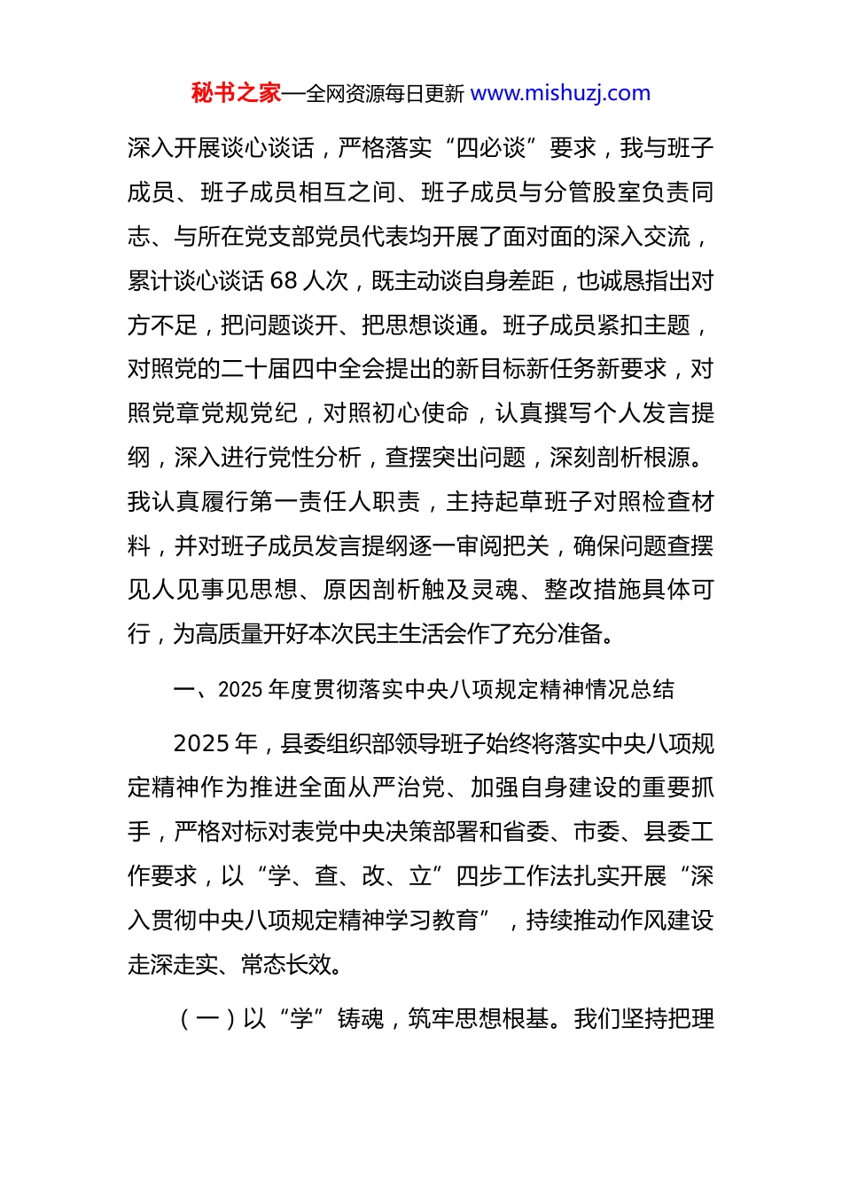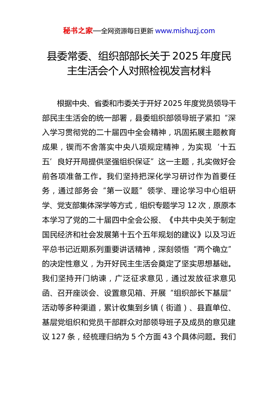 秘书之家—全网资源每日更新 www.mishuzj.com县委常委、组织部部长关于 2025 年度民主生活会个人对照检视发言材料根据中央、省委和市委关于开好 2025 年度党员领导干部民主生活会的统一部署,县委组织部领导班子紧扣“深入学习贯彻党的二十届四中全会精神,巩固拓展主题教育成果,锲而不舍落实中央八项规定精神,为实现‘十五五’良好开局提供坚强组织保证”这一主题,扎实做好会前各项准备工作。我们坚持把深化学习研讨作为首要任务,通过部务会“第一议题”领学、理论学习中心组研学、党支部集体深学等方式,组织专题学习 12 次,原原本本学习了党的二十届四中全会公报、《中共中央关于制定国民经济和社会发展第十五个五年规划的建议》以及习近平总书记近期系列重要讲话精神,深刻领悟“两个确立”的决定性意义,为开好民主生活会奠定了坚实思想基础。我们坚持开门纳谏,广泛征求意见,通过发放征求意见函、召开座谈会、设置意见箱、开展“组织部长下基层”活动等多种渠道,累计收集到乡镇(街道)、县直单位、基层党组织和党员干部群众对部领导班子及成员的意见建议 127 条,经梳理归纳为 5 个方面 43 个具体问题。我们秘书之家—全网资源每日更新 www.mishuzj.com深入开展谈心谈话,严格落实“四必谈”要求,我与班子成员、班子成员相互之间、班子成员与分管股室负责同志、与所在党支部党员代表均开展了面对面的深入交流,累计谈心谈话 68 人次,既主动谈自身差距,也诚恳指出对方不足,把问题谈开、把思想谈通。班子成员紧扣主题,对照党的二十届四中全会提出的新目标新任务新要求,对照党章党规党纪,对照初心使命,认真撰写个人发言提纲,深入进行党性分析,查摆突出问题,深刻剖析根源。我认真履行第一责任人职责,主持起草班子对照检查材料,并对班子成员发言提纲逐一审阅把关,确保问题查摆见人见事见思想、原因剖析触及灵魂、整改措施具体可行,为高质量开好本次民主生活会作了充分准备。一、2025 年度贯彻落实中央八项规定精神情况总结2025 年,县委组织部领导班子始终将落实中央八项规定精神作为推进全面从严治党、加强自身建设的重要抓手,严格对标对表党中央决策部署和省委、市委、县委工作要求,以“学、查、改、立”四步工作法扎实开展“深入贯彻中央八项规定精神学习教育”,持续推动作风建设走深走实、常态长效。(一)以“学”铸魂,筑牢思想根基。我们坚持把理秘书之家—全网资源每日更新 www.mishuzj.com论学习摆在首位,制定并严格执行专题学习计划,构建“部务会示范学、党支部集中学、党小组研讨学、党员干部自主学”的四维学习体系。全年围绕中央八项规定及其实施细则、党的自我革命战略思想、新修订的《中国共产党纪律处分条例》等重点内容,组织专题学习会 8 场、集中研讨交流 4 次,班子成员带头撰写心得体会、带头讲廉政党课。我们将警示教育作为学习教育的关键一环,组织全体干部集中观看《作风建设永远在路上》等警示教育片,赴县廉政教育基地开展现场教学 2 次,深刻剖析中纪委、省纪委通报的以及本县查处的共 7 起违反中央八项规定精神典型案例,特别是涉及组织人事领域的案例,用“身边事”教育“身边人”,引导干部知敬畏、存戒惧、守底线,自觉抵制歪风邪气。(二)以“查”明纪,精准扫描画像。我们发扬刀刃向内的自我革命精神,坚持问题导向,对照《违反中央八项规定及其实施细则精神问题清单》和《隐形变异的“四风”问题新表现清单》,采取“班子查、领导点、群众提、自己找”相结合的方式,全面深入查摆问题。领导班子重点围绕贯彻落实党中央决策部署、服务高质量发展、为基层减负、规范选人用人、廉洁自律等方面,查摆出 5个倾向性问题。班子成员及全体干部结合岗位职责,对照秘书之家—全网资源每日更新 www.mishuzj.com检查在公务接待、会议活动、文件简报、调查研究、干部考察、个人交往等方面是否存在形式主义、官僚主义新表现,累计自查自纠问题 65 个。例如,在整治形式主义为基层减负工作中,我们牵头对全县各部门发文、开会、督查检查考核情况进行了 2 次专项摸排,发现并反馈了 4 类 13...