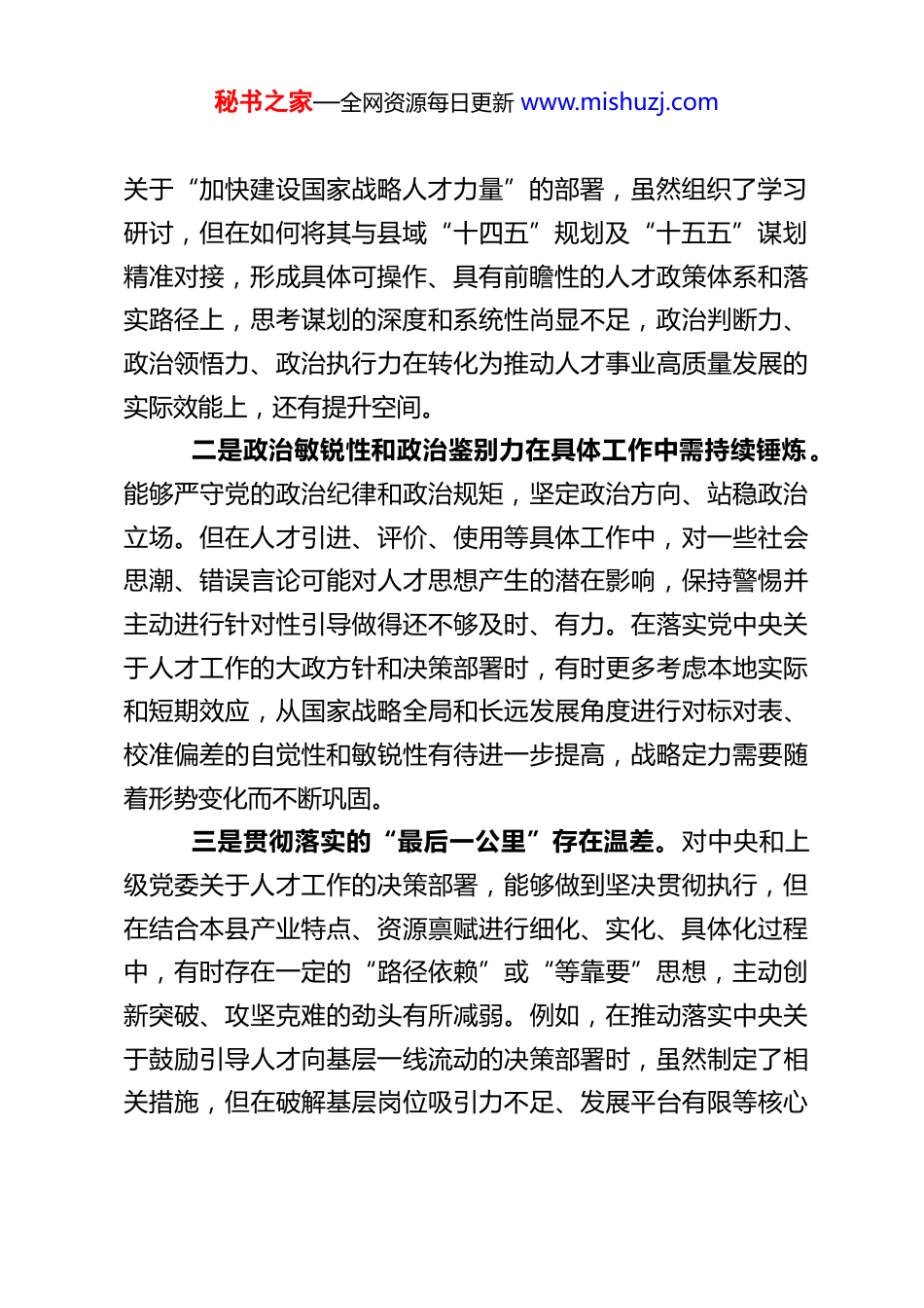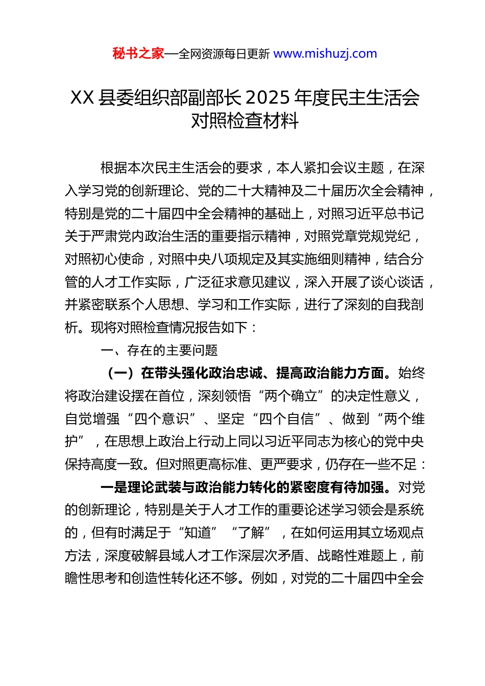秘书之家—全网资源每日更新 www.mishuzj.comXX 县委组织部副部长 2025 年度民主生活会对照检查材料根据本次民主生活会的要求,本人紧扣会议主题,在深入学习党的创新理论、党的二十大精神及二十届历次全会精神,特别是党的二十届四中全会精神的基础上,对照习近平总书记关于严肃党内政治生活的重要指示精神,对照党章党规党纪,对照初心使命,对照中央八项规定及其实施细则精神,结合分管的人才工作实际,广泛征求意见建议,深入开展了谈心谈话,并紧密联系个人思想、学习和工作实际,进行了深刻的自我剖析。现将对照检查情况报告如下:一、存在的主要问题(一)在带头强化政治忠诚、提高政治能力方面。始终将政治建设摆在首位,深刻领悟“两个确立”的决定性意义,自觉增强“四个意识”、坚定“四个自信”、做到“两个维护”,在思想上政治上行动上同以习近平同志为核心的党中央保持高度一致。但对照更高标准、更严要求,仍存在一些不足:一是理论武装与政治能力转化的紧密度有待加强。对党的创新理论,特别是关于人才工作的重要论述学习领会是系统的,但有时满足于“知道”“了解”,在如何运用其立场观点方法,深度破解县域人才工作深层次矛盾、战略性难题上,前瞻性思考和创造性转化还不够。例如,对党的二十届四中全会秘书之家—全网资源每日更新 www.mishuzj.com关于“加快建设国家战略人才力量”的部署,虽然组织了学习研讨,但在如何将其与县域“十四五”规划及“十五五”谋划精准对接,形成具体可操作、具有前瞻性的人才政策体系和落实路径上,思考谋划的深度和系统性尚显不足,政治判断力、政治领悟力、政治执行力在转化为推动人才事业高质量发展的实际效能上,还有提升空间。二是政治敏锐性和政治鉴别力在具体工作中需持续锤炼。能够严守党的政治纪律和政治规矩,坚定政治方向、站稳政治立场。但在人才引进、评价、使用等具体工作中,对一些社会思潮、错误言论可能对人才思想产生的潜在影响,保持警惕并主动进行针对性引导做得还不够及时、有力。在落实党中央关于人才工作的大政方针和决策部署时,有时更多考虑本地实际和短期效应,从国家战略全局和长远发展角度进行对标对表、校准偏差的自觉性和敏锐性有待进一步提高,战略定力需要随着形势变化而不断巩固。三是贯彻落实的“最后一公里”存在温差。对中央和上级党委关于人才工作的决策部署,能够做到坚决贯彻执行,但在结合本县产业特点、资源禀赋进行细化、实化、具体化过程中,有时存在一定的“路径依赖”或“等靠要”思想,主动创新突破、攻坚克难的劲头有所减弱。例如,在推动落实中央关于鼓励引导人才向基层一线流动的决策部署时,虽然制定了相关措施,但在破解基层岗位吸引力不足、发展平台有限等核心秘书之家—全网资源每日更新 www.mishuzj.com症结上,拿出具有根本性、突破性的硬招实招还不够多,导致部分政策“悬空”,未能完全转化为人才集聚的实效。(二)在带头固本培元、增强党性方面。深知党性是党员干部立身、立业、立言、立德的基石,始终将政治修养置于首位,坚持用习近平新时代中国特色社会主义思想凝心铸魂。但反思自身,在党性锤炼的持续性和深刻性上仍有差距:一是世界观、人生观、价值观的“总开关”拧得不够时时紧。能够坚守共产党人精神追求,但在面对社会多元价值冲击、个人成长进步等现实考验时,偶尔会产生“歇歇脚”“松口气”的想法,艰苦奋斗、无私奉献的精神有所弱化。对照党章党规党纪进行自我检视、自我革命的主动性、彻底性不够强,有时碍于情面或习惯,对自身存在的一些非原则性小问题、小毛病不够警惕,未能做到“时时勤拂拭,勿使惹尘埃”。二是理想信念的实践印证有待深化。对马克思主义信仰、共产主义远大理想和中国特色社会主义共同信念是坚定的,但将其融入日常、化为行动、见于成效的自觉性还有提升空间。特别是在人才工作中,如何将党的理想信念教育有效融入对各类人才的政治引领和政治吸纳,创新载体和方法不多,效果有待进一步显现。自身在将坚定理想信念与履行岗位职责紧密结合,以“功成不必在我,功成必定有我”的境界推动人才工作长远发展方面,还需要更深...