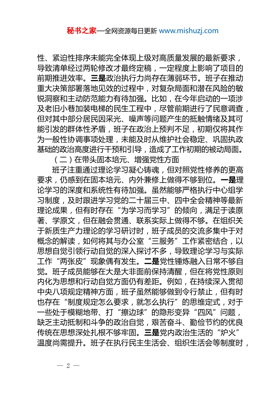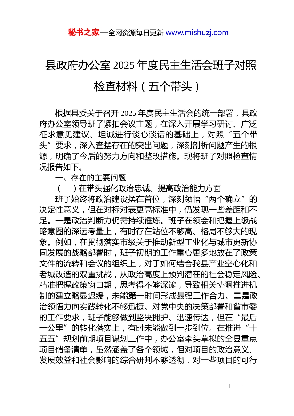 秘书之家—全网资源每日更新 www.mishuzj.com县政府办公室 2025 年度民主生活会班子对照检查材料(五个带头)根据县委关于召开 2025 年度民主生活会的统一部署,县政府办公室领导班子紧扣会议主题,在深入开展学习研讨、广泛征求意见建议、坦诚进行谈心谈话的基础上,对照“五个带头”要求,深入查摆存在的突出问题,深刻剖析问题产生的根源,明确了今后的努力方向和整改措施。现将班子对照检查情况报告如下。一、存在的主要问题(一)在带头强化政治忠诚、提高政治能力方面班子始终将政治建设摆在首位,深刻领悟“两个确立”的决定性意义,但在对标对表更高标准中,仍发现一些差距和不足。一是政治判断力仍需持续锤炼。班子在领会和把握上级战略意图的深远考量上,有时存在站位不够高、格局不够大的现象。例如,在贯彻落实市级关于推动新型工业化与城市更新协同发展的战略部署时,班子初期的工作重心更多地放在了政策文件的流转和会议的组织上,对于如何结合我县产业空心化和老城改造的双重挑战,从政治高度上预判潜在的社会稳定风险、精准把握政策窗口期,思考得不够深邃,导致相关协调推进机制的建立略显迟缓,未能第一时间形成最强工作合力。二是政治领悟力向实践转化不够迅捷。对党中央的决策部署和省市委的工作要求,班子能够做到坚决拥护、迅速传达,但在“最后一公里”的转化落实上,有时未能做到一步到位。在推进“十五五”规划前期项目谋划工作中,办公室牵头草拟的全县重点项目储备清单,虽然涵盖了各个领域,但对项目的政治意义、发展效益和社会影响的综合研判不够透彻,对一些项目的可行— 1 —秘书之家—全网资源每日更新 www.mishuzj.com性、紧迫性排序未能完全体现上级对高质量发展的最新要求,导致清单经过两轮修改才最终定稿,一定程度上影响了项目的前期推进效率。三是政治执行力尚存在薄弱环节。班子在推动重大决策部署落地见效的过程中,对复杂局面和潜在风险的敏锐洞察和主动防范能力有待加强。比如,在今年启动的一项涉及老旧小巷加装电梯的民生工程中,尽管前期进行了民意调查,但对其中部分居民因采光、噪声等问题产生的抵触情绪及其可能引发的群体性矛盾,班子在政治上预判不足,初期仅将其作为一般性协调事项处理,未能及时从维护社会稳定、巩固执政基础的政治高度进行干预和引导,造成了工作初期的被动局面。(二)在带头固本培元、增强党性方面班子注重通过理论学习凝心铸魂,但对照党性修养的更高要求,仍感到在固本培元、内外兼修上做得不够到位。一是理论学习的深度和系统性有待加强。虽然能够严格执行中心组学习制度,及时跟进学习党的二十届三中、四中全会精神等最新理论成果,但有时存在“为学习而学习”的倾向,满足于读原著、学原文,但在融会贯通、联系实际上做得不够。在组织关于新质生产力理论的学习研讨时,班子成员的交流多集中于对概念的解读,如何将其与办公室“三服务”工作紧密结合,以思想自觉引领行动自觉的深入探讨不多,导致理论学习与实际工作“两张皮”现象偶有发生。二是党性锤炼融入日常不够自觉。班子成员能够在大是大非面前保持清醒,但在将党性原则内化为思想和行动自觉方面仍有差距。例如,在持续深入贯彻中央八项规定精神方面,班子虽然能够做到令行禁止,但有时也存在“制度规定怎么要求,就怎么执行”的思维定式,对于一些处于模糊地带、打“擦边球”的隐形变异“四风”问题,缺乏主动抵制和斗争的政治自觉,艰苦奋斗、勤俭节约的优良传统在思想深处扎根不够牢固。三是党内政治生活的“炉火”温度尚需提升。班子在执行民主生活会、组织生活会等制度时,— 2 —秘书之家—全网资源每日更新 www.mishuzj.com虽然程序规范,但批评和自我批评的辣味还不够足。在一些内部工作碰头会上,更多的是谈工作、谈成绩,对于彼此在工作作风、担当精神方面的不足,往往点到为止,存在“怕伤和气、影响团结”的老好人思想,未能真正达到“红脸出汗、排毒治病”的效果,党内政治生活的政治性、时代性、原则性、战斗性未能得到最充分的体现。(三)在带头敬畏人民、敬畏组织、敬畏法纪方面班子始终将人民放在心中最高位置...