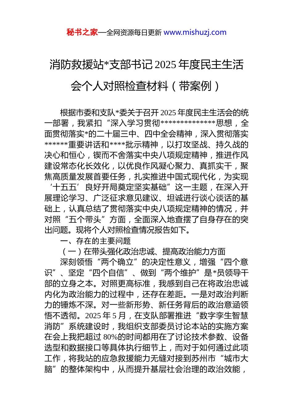 秘书之家—全网资源每日更新 www.mishuzj.com消防救援站*支部书记 2025 年度民主生活会个人对照检查材料(带案例)根据市委和支队*委关于召开 2025 年度民主生活会的统一部署,我紧扣“深入学习贯彻**************思想,全面贯彻落实*的二十届三中、四中全会精神,深入贯彻落实******重要讲话和****批示精神,以打攻坚战、持久战的决心和恒心,锲而不舍落实中央八项规定精神,推进作风建设常态化长效化,以优良作风凝心聚力、真抓实干,聚焦高质量发展首要任务,扎实推进中国式现代化,为实现‘十五五’良好开局奠定坚实基础”这一主题,在深入开展理论学习、广泛征求意见建议、坦诚进行谈心谈话的基础上,认真总结了贯彻落实中央八项规定精神的情况,并对照“五个带头”方面,全面深入地查摆了自身存在的突出问题。现将个人对照检查情况报告如下。一、存在的主要问题(一)在带头强化政治忠诚、提高政治能力方面深刻领悟“两个确立”的决定性意义,增强“四个意识”、坚定“四个自信”、做到“两个维护”是*员领导干部的立身之本。对照更高标准,我感到自己在将政治忠诚内化为政治能力的过程中,还存在差距。一是对政治判断力的锤炼不深。对一些新形势、新任务背后的政治意涵领悟不透彻。2025 年 5 月,在支队部署推进“数字孪生智慧消防”系统建设时,我组织支部委员讨论本站的实施方案在会上我把超过 80%的时间都用在了讨论技术参数、设备选型和数据接口等具体执行细节上,而对于如何通过此项工作,将我站的应急救援能力无缝对接到苏州市“城市大脑”的整体架构中,从而提升基层社会治理的政治效能,秘书之家—全网资源每日更新 www.mishuzj.com思考谋划不深,未能从更高的政治站位上认识和推动工作二是对政治领悟力的转化不快。将*中央大政方针和上级决策部署转化为基层具体行动时,存在一定的“时差”和“温差”。*的二十届四中全会就推进中国式现代化作出全面部署,会后,我第一时间组织了全体指战员学习全会公报,但将会议精神与我站“社区消防安全网格化管理”工作深度融合的行动方案,直到 2025 年第 4 季度才最终定稿,导致我站的网格化管理升级工作比兄弟单位慢了一个节拍影响了政策红利的快速释放。三是对政治执行力的坚守不决。在贯彻落实决策部署时,面对复杂局面和潜在风险,有时存在底线思维不牢、战略定力不足的问题。2025 年 10月,在组织对辖区内老旧小区进行火灾隐患排查时,我主要依据前两年的排查数据和传统经验,对因“共享电单车”普及带来的新型充电桩乱拉乱建、电池入户充电等新风险,预判不足、重视不够。直到支队下发了关于电单车火灾风险的专项警示通报后,我才组织力量进行“回头看”和专项整治,暴露出我在执行安全排查这一政治任务时,敏锐性和前瞻性不强。(二)在带头固本培元、增强*性方面坚持用**************思想凝心铸魂,是加强*性修养的根本途径。反思自身,我在固本培元、锤炼*性上下的功夫还不够扎实。一是理论学习的深度有所欠缺。虽然能够按时完成“第一议题”学习和理论学习中心组的各项任务但在“钻深悟透”上做得不好。2025 年,我主持开展了 4次关于“******论应急管理”的专题学习研讨,但在研讨交流环节,我个人发言时,引用原文、解读文件内容较多而结合我站当前面临的指战员心理健康疏导压力增大、高层建筑灭火救援难题等实际工作,进行深层次的思考和提出独到见解不深,未能完全做到学思用贯通、知信行统一二是*性锻炼的自觉有所弱化。在急难险重任务中锤炼*性的意识不强,有时存在“重业务、轻思想”的倾向。2025秘书之家—全网资源每日更新 www.mishuzj.com年 9 月,在为期一周的全市“蓝焰-2025”高强度、跨区域灭火救援实战演练中,我作为现场指挥员之一,将全部精力投入到了战术部署、力量调派和后勤保障上,确保了演练任务的圆满完成。但期间,我发现有 2 名新入职的消防员因连续高强度作业表现出畏难情绪和心理波动,我仅仅是口头鼓励了几句,而没有坐下来与他们深入谈心,开展“战地”思想政治工作,错失了在实战中锤炼队伍*性、砥砺战斗意志的良机。三是*性剖析的力度有所保留。对照*章*规d...