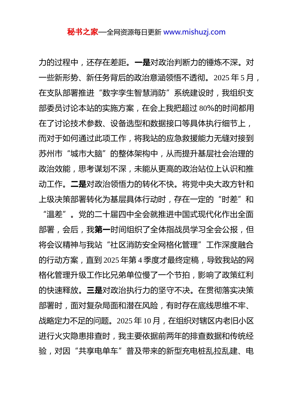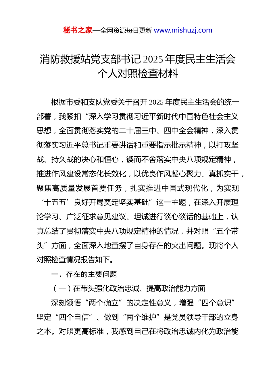 秘书之家—全网资源每日更新 www.mishuzj.com消防救援站党支部书记 2025 年度民主生活会个人对照检查材料 根据市委和支队党委关于召开 2025 年度民主生活会的统一部署,我紧扣“深入学习贯彻习近平新时代中国特色社会主义思想,全面贯彻落实党的二十届三中、四中全会精神,深入贯彻落实习近平总书记重要讲话和重要指示批示精神,以打攻坚战、持久战的决心和恒心,锲而不舍落实中央八项规定精神,推进作风建设常态化长效化,以优良作风凝心聚力、真抓实干,聚焦高质量发展首要任务,扎实推进中国式现代化,为实现‘十五五’良好开局奠定坚实基础”这一主题,在深入开展理论学习、广泛征求意见建议、坦诚进行谈心谈话的基础上,认真总结了贯彻落实中央八项规定精神的情况,并对照“五个带头”方面,全面深入地查摆了自身存在的突出问题。现将个人对照检查情况报告如下。一、存在的主要问题(一)在带头强化政治忠诚、提高政治能力方面深刻领悟“两个确立”的决定性意义,增强“四个意识”坚定“四个自信”、做到“两个维护”是党员领导干部的立身之本。对照更高标准,我感到自己在将政治忠诚内化为政治能秘书之家—全网资源每日更新 www.mishuzj.com力的过程中,还存在差距。一是对政治判断力的锤炼不深。对一些新形势、新任务背后的政治意涵领悟不透彻。2025 年 5 月,在支队部署推进“数字孪生智慧消防”系统建设时,我组织支部委员讨论本站的实施方案,在会上我把超过 80%的时间都用在了讨论技术参数、设备选型和数据接口等具体执行细节上,而对于如何通过此项工作,将我站的应急救援能力无缝对接到苏州市“城市大脑”的整体架构中,从而提升基层社会治理的政治效能,思考谋划不深,未能从更高的政治站位上认识和推动工作。二是对政治领悟力的转化不快。将党中央大政方针和上级决策部署转化为基层具体行动时,存在一定的“时差”和“温差”。党的二十届四中全会就推进中国式现代化作出全面部署,会后,我第一时间组织了全体指战员学习全会公报,但将会议精神与我站“社区消防安全网格化管理”工作深度融合的行动方案,直到 2025 年第 4 季度才最终定稿,导致我站的网格化管理升级工作比兄弟单位慢了一个节拍,影响了政策红利的快速释放。三是对政治执行力的坚守不决。在贯彻落实决策部署时,面对复杂局面和潜在风险,有时存在底线思维不牢、战略定力不足的问题。2025 年 10 月,在组织对辖区内老旧小区进行火灾隐患排查时,我主要依据前两年的排查数据和传统经验,对因“共享电单车”普及带来的新型充电桩乱拉乱建、电秘书之家—全网资源每日更新 www.mishuzj.com池入户充电等新风险,预判不足、重视不够。直到支队下发了关于电单车火灾风险的专项警示通报后,我才组织力量进行“回头看”和专项整治,暴露出我在执行安全排查这一政治任务时,敏锐性和前瞻性不强。(二)在带头固本培元、增强党性方面坚持用习近平新时代中国特色社会主义思想凝心铸魂,是加强党性修养的根本途径。反思自身,我在固本培元、锤炼党性上下的功夫还不够扎实。一是理论学习的深度有所欠缺。虽然能够按时完成“第一议题”学习和理论学习中心组的各项任务,但在“钻深悟透”上做得不好。2025 年,我主持开展了 4次关于“习近平总书记论应急管理”的专题学习研讨,但在研讨交流环节,我个人发言时,引用原文、解读文件内容较多,而结合我站当前面临的指战员心理健康疏导压力增大、高层建筑灭火救援难题等实际工作,进行深层次的思考和提出独到见解不深,未能完全做到学思用贯通、知信行统一。二是党性锻炼的自觉有所弱化。在急难险重任务中锤炼党性的意识不强,有时存在“重业务、轻思想”的倾向。2025 年 9 月,在为期一周的全市“蓝焰-2025”高强度、跨区域灭火救援实战演练中,我作为现场指挥员之一,将全部精力投入到了战术部署、力量调派和后勤保障上,确保了演练任务的圆满完成。但期间,我秘书之家—全网资源每日更新 www.mishuzj.com发现有 2 名新入职的消防员因连续高强度作业表现出畏难情绪和心理波动,我仅仅是口头鼓励了几句,而没有坐下来与他们深入谈心,开展“...