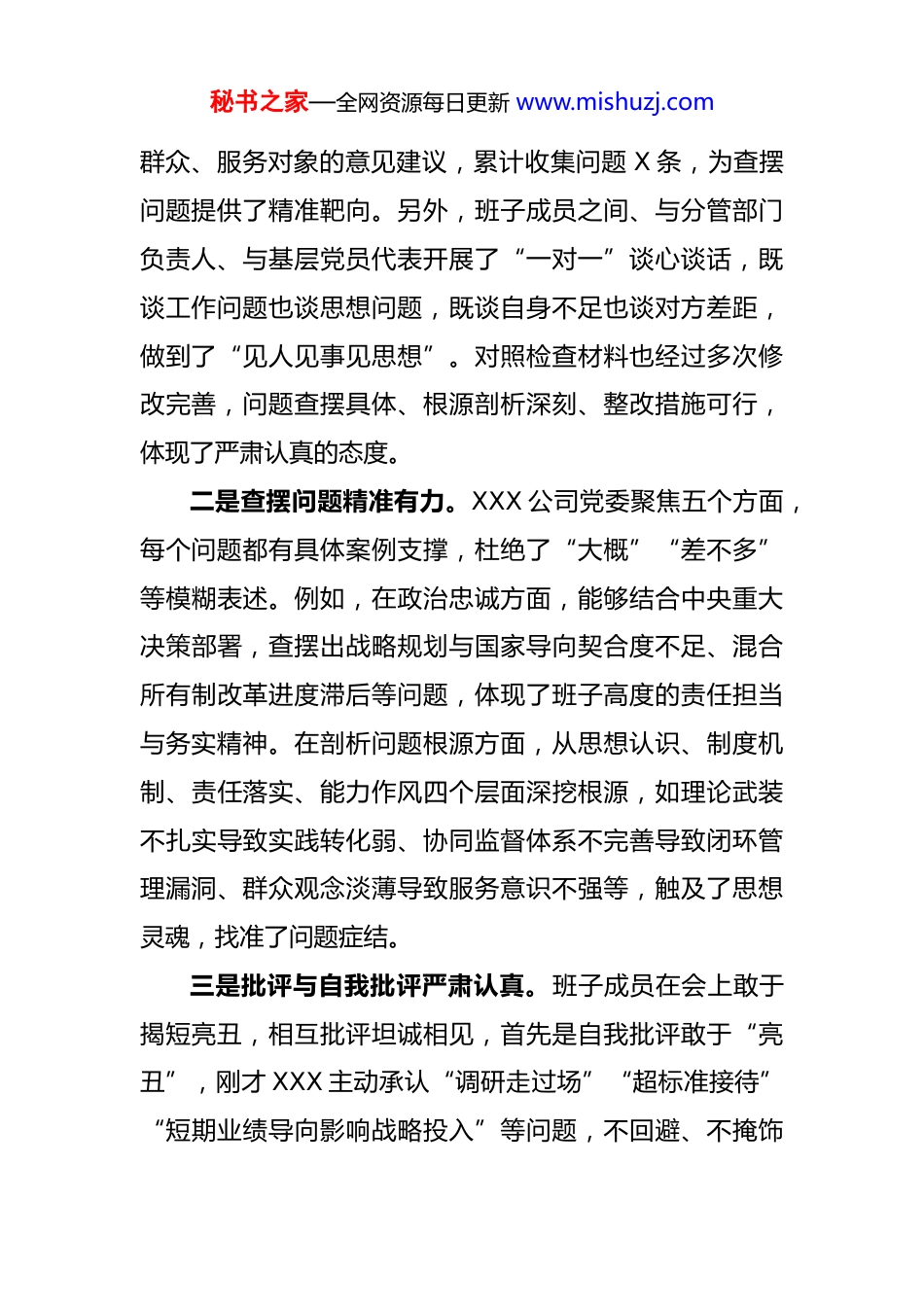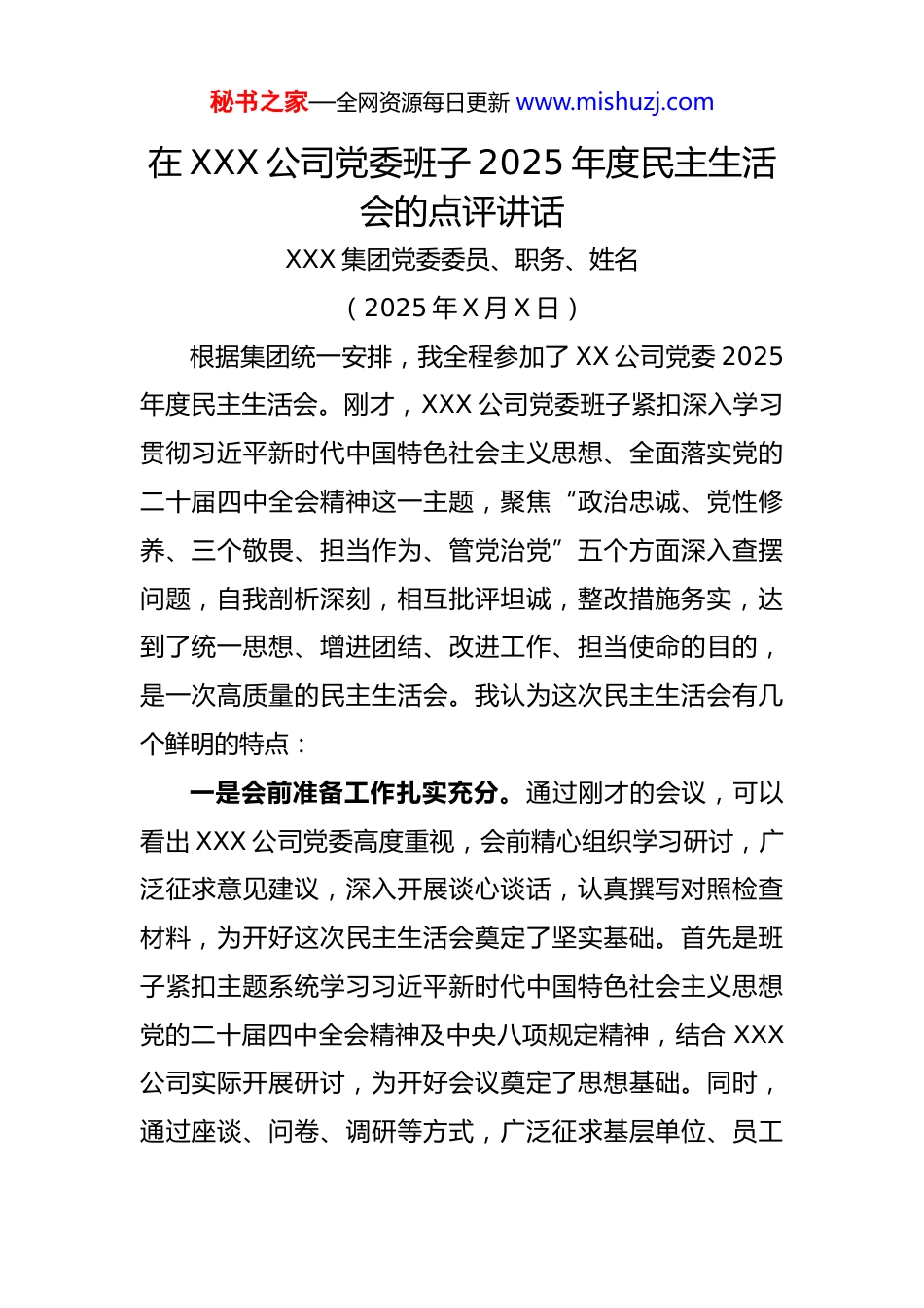 秘书之家—全网资源每日更新 www.mishuzj.com在 XXX 公司党委班子 2025 年度民主生活会的点评讲话XXX 集团党委委员、职务、姓名(2025 年 X 月 X 日)根据集团统一安排,我全程参加了 XX 公司党委 2025年度民主生活会。刚才,XXX 公司党委班子紧扣深入学习贯彻习近平新时代中国特色社会主义思想、全面落实党的二十届四中全会精神这一主题,聚焦“政治忠诚、党性修养、三个敬畏、担当作为、管党治党”五个方面深入查摆问题,自我剖析深刻,相互批评坦诚,整改措施务实,达到了统一思想、增进团结、改进工作、担当使命的目的,是一次高质量的民主生活会。我认为这次民主生活会有几个鲜明的特点:一是会前准备工作扎实充分。通过刚才的会议,可以看出 XXX 公司党委高度重视,会前精心组织学习研讨,广泛征求意见建议,深入开展谈心谈话,认真撰写对照检查材料,为开好这次民主生活会奠定了坚实基础。首先是班子紧扣主题系统学习习近平新时代中国特色社会主义思想党的二十届四中全会精神及中央八项规定精神,结合 XXX公司实际开展研讨,为开好会议奠定了思想基础。同时,通过座谈、问卷、调研等方式,广泛征求基层单位、员工秘书之家—全网资源每日更新 www.mishuzj.com群众、服务对象的意见建议,累计收集问题 X 条,为查摆问题提供了精准靶向。另外,班子成员之间、与分管部门负责人、与基层党员代表开展了“一对一”谈心谈话,既谈工作问题也谈思想问题,既谈自身不足也谈对方差距,做到了“见人见事见思想”。对照检查材料也经过多次修改完善,问题查摆具体、根源剖析深刻、整改措施可行,体现了严肃认真的态度。二是查摆问题精准有力。XXX 公司党委聚焦五个方面,每个问题都有具体案例支撑,杜绝了“大概”“差不多”等模糊表述。例如,在政治忠诚方面,能够结合中央重大决策部署,查摆出战略规划与国家导向契合度不足、混合所有制改革进度滞后等问题,体现了班子高度的责任担当与务实精神。在剖析问题根源方面,从思想认识、制度机制、责任落实、能力作风四个层面深挖根源,如理论武装不扎实导致实践转化弱、协同监督体系不完善导致闭环管理漏洞、群众观念淡薄导致服务意识不强等,触及了思想灵魂,找准了问题症结。三是批评与自我批评严肃认真。班子成员在会上敢于揭短亮丑,相互批评坦诚相见,首先是自我批评敢于“亮丑”,刚才 XXX 主动承认“调研走过场”“超标准接待”“短期业绩导向影响战略投入”等问题,不回避、不掩饰秘书之家—全网资源每日更新 www.mishuzj.com这是勇于直面问题、敢于承担责任的担当;另外,相互批评有“辣味”,班子之间直指要害,如指出“战略定力不足”“跨部门协同弱”“青年培养重视不够”等问题,达到了“红脸出汗、排毒治病”的效果;最后,接受批评态度诚恳,对他人提出的批评意见,均表示“照单全收、立行立改”,体现了闻过则喜、从善如流的胸怀。四是整改措施系统务实。围绕“思想引领、制度构建、责任传导、能力提升”这四个维度,XXX 公司党委经过深入研究和精心谋划,制定了 X 项具体且具有可执行性的整改措施。如构建起一套能够将理论与实际紧密联系起来的学习机制;优化跨部门协同攻坚体系,打破部门之间的壁垒;细化管党治党责任传导,确保每一项责任都能明确落实到具体的个人和岗位。这些整改措施不仅针对性和操作性都非常强,而且高度契合党的二十届四中全会精神,能够紧跟时代发展的步伐和要求。同时,这些措施又紧密结合 XXX 公司的主责主业,充分考虑到公司的实际业务情况和发展需求,突出了本次民主生活会的主题,为公司的持续健康发展提供了有力的保障。总体上看,这次民主生活会体现了全面从严治党的要求,取得了统一思想、增进团结、改进工作、担当使命的预期效果。下面,我也提几点建议,与大家共勉。秘书之家—全网资源每日更新 www.mishuzj.com一是深化理论武装,提升政治能力。我们务必要始终如一地把理论学习当作是我们一生都必须修好的课程。在这个不断发展变化的时代,持续深入地学习习近平新时代中国特色社会主义思想以及党的二十届四中全会精神显得尤为关键。我们应当通过不断地...