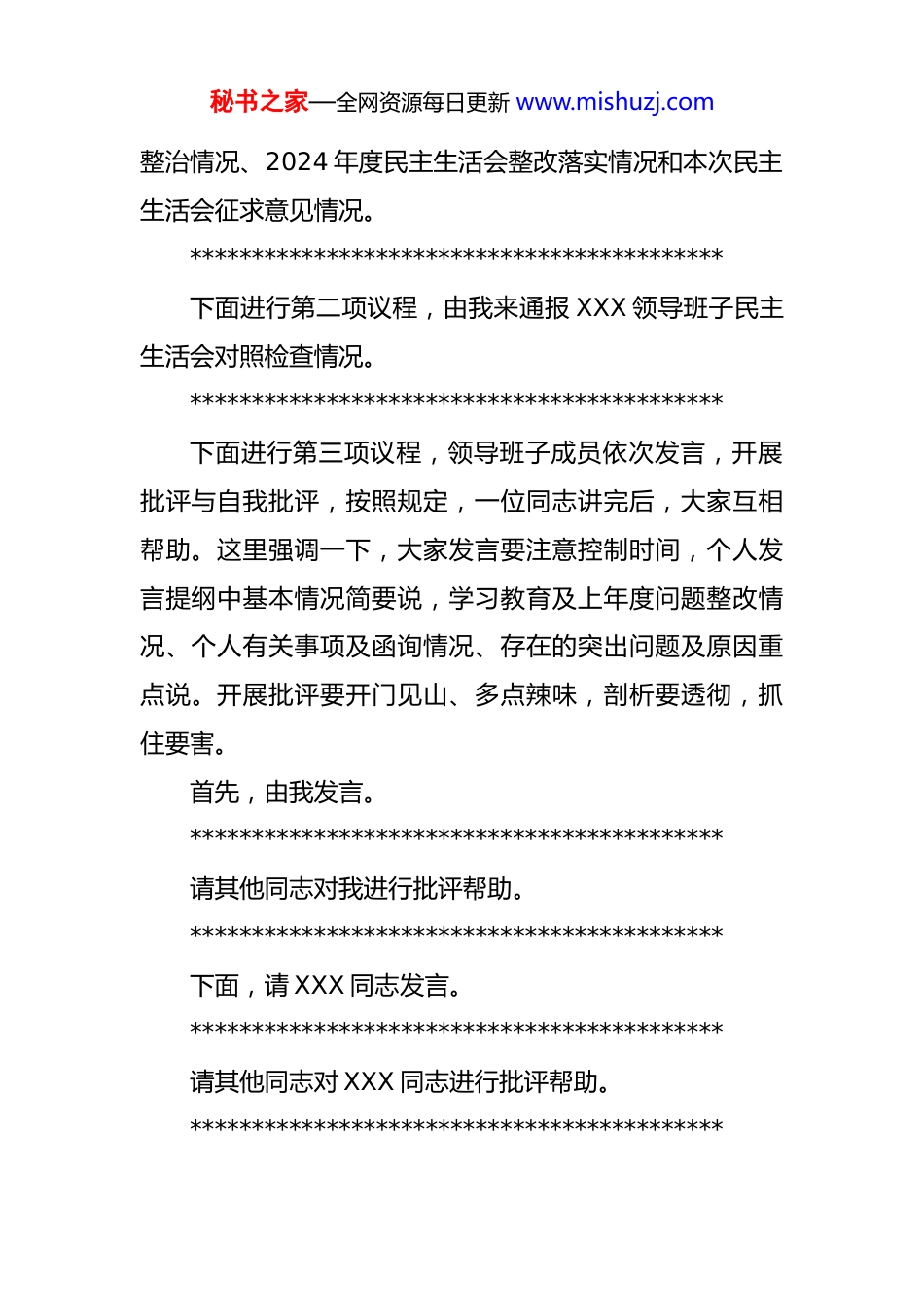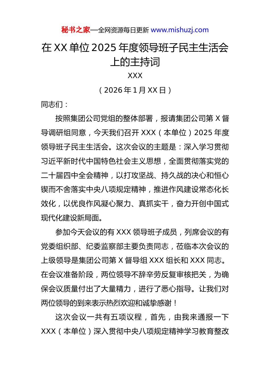 秘书之家—全网资源每日更新 www.mishuzj.com在 XX 单位 2025 年度领导班子民主生活会上的主持词XXX(2026 年 1 月 XX 日)同志们:按照集团公司党组的整体部署,报请集团公司第 X 督导调研组同意,今天我们召开 XXX(本单位)2025 年度领导班子民主生活会。这次会议的主题是:深入学习贯彻习近平新时代中国特色社会主义思想,全面贯彻落实党的二十届四中全会精神,以打攻坚战、持久战的决心和恒心锲而不舍落实中央八项规定精神,推进作风建设常态化长效化,以优良作风凝心聚力、真抓实干,奋力开创中国式现代化建设新局面。参加今天会议的有 XXX 领导班子成员,列席会议的有党委组织部、纪委监察部主要负责同志,莅临本次会议的上级领导是集团公司第 X 督导组 XXX 组长和 XXX 同志。在会议准备阶段,两位领导不辞辛劳反复审核把关,为确保会议质量付出了大量精力,进行了悉心指导。让我们对两位领导的到来表示热烈欢迎和诚挚感谢!这次会议一共有五项议程,首先,由我来通报一下XXX(本单位)深入贯彻中央八项规定精神学习教育整改秘书之家—全网资源每日更新 www.mishuzj.com整治情况、2024 年度民主生活会整改落实情况和本次民主生活会征求意见情况。*******************************************下面进行第二项议程,由我来通报 XXX 领导班子民主生活会对照检查情况。*******************************************下面进行第三项议程,领导班子成员依次发言,开展批评与自我批评,按照规定,一位同志讲完后,大家互相帮助。这里强调一下,大家发言要注意控制时间,个人发言提纲中基本情况简要说,学习教育及上年度问题整改情况、个人有关事项及函询情况、存在的突出问题及原因重点说。开展批评要开门见山、多点辣味,剖析要透彻,抓住要害。首先,由我发言。*******************************************请其他同志对我进行批评帮助。*******************************************下面,请 XXX 同志发言。*******************************************请其他同志对 XXX 同志进行批评帮助。*******************************************秘书之家—全网资源每日更新 www.mishuzj.com下面,请 XXX 同志发言。*******************************************请其他同志对 XXX 同志进行批评帮助。*******************************************下面,请 XXX 同志发言。*******************************************请其他同志对 XXX 同志进行批评帮助。*******************************************下面,请 XXX 同志发言。*******************************************请其他同志对 XXX 同志进行批评帮助。*******************************************下面,请 XXX 同志发言。*******************************************请其他同志对 XXX 同志进行批评帮助。*******************************************下面,请 XXX 同志发言。*******************************************请其他同志对 XXX 同志进行批评帮助。*******************************************下面,请 XXX 同志发言。秘书之家—全网资源每日更新 www.mishuzj.com*******************************************请其他同志对 XXX 同志进行批评帮助。*******************************************领导班子成员的发言以及大家相互批评到此结束。下面,让我们欢迎集团公司第 X 督导组组长 XXX 同志做点评。*******************************************同志们,经过认真准备,今天我们召开了 XXX(本单位)2025 年度领导班子民主生活会。大家按照会议的主题和要求,主动联系思想和工作实际,重点从“五个带头”方面深入查摆问题,开展批评与自我批评,整个过程中,大家开门见山、敞开心扉、揭短亮丑、直挖根源。总体来说,会议开得比较成功,起到了团结民主、统一思想、凝心聚力和推进发展的作用。刚才,督导组 XXX 同志对我们的会议给予了充分肯定和评价,提出了四点建议。这次会议之所以能够达到预期效果,离不开督导组的指导,请大家再次用掌声表示...
