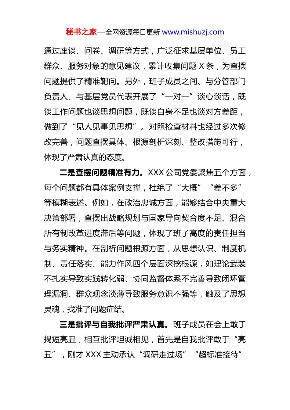 秘书之家—全网资源每日更新 www.mishuzj.com在 XX 公司党委班子 2025 年度民主生活会的点评讲话XXX 集团党委委员、职务、姓名(2025 年 X 月 X 日) 根据集团统一安排,我全程参加了 XX 公司党委 2025年度民主生活会。刚才,XXX 公司党委班子紧扣深入学习贯彻习近平新时代中国特色社会主义思想、全面落实党的二十届四中全会精神这一主题,聚焦“政治忠诚、党性修养、三个敬畏、担当作为、管党治党”五个方面深入查摆问题,自我剖析深刻,相互批评坦诚,整改措施务实,达到了统一思想、增进团结、改进工作、担当使命的目的,是一次高质量的民主生活会。我认为这次民主生活会有几个鲜明的特点:一是会前准备工作扎实充分。通过刚才的会议,可以看出 XXX 公司党委高度重视,会前精心组织学习研讨,广泛征求意见建议,深入开展谈心谈话,认真撰写对照检查材料,为开好这次民主生活会奠定了坚实基础。首先是班子紧扣主题系统学习习近平新时代中国特色社会主义思想党的二十届四中全会精神及中央八项规定精神,结合 XXX公司实际开展研讨,为开好会议奠定了思想基础。同时,秘书之家—全网资源每日更新 www.mishuzj.com通过座谈、问卷、调研等方式,广泛征求基层单位、员工群众、服务对象的意见建议,累计收集问题 X 条,为查摆问题提供了精准靶向。另外,班子成员之间、与分管部门负责人、与基层党员代表开展了“一对一”谈心谈话,既谈工作问题也谈思想问题,既谈自身不足也谈对方差距,做到了“见人见事见思想”。对照检查材料也经过多次修改完善,问题查摆具体、根源剖析深刻、整改措施可行,体现了严肃认真的态度。二是查摆问题精准有力。XXX 公司党委聚焦五个方面,每个问题都有具体案例支撑,杜绝了“大概”“差不多”等模糊表述。例如,在政治忠诚方面,能够结合中央重大决策部署,查摆出战略规划与国家导向契合度不足、混合所有制改革进度滞后等问题,体现了班子高度的责任担当与务实精神。在剖析问题根源方面,从思想认识、制度机制、责任落实、能力作风四个层面深挖根源,如理论武装不扎实导致实践转化弱、协同监督体系不完善导致闭环管理漏洞、群众观念淡薄导致服务意识不强等,触及了思想灵魂,找准了问题症结。三是批评与自我批评严肃认真。班子成员在会上敢于揭短亮丑,相互批评坦诚相见,首先是自我批评敢于“亮丑”,刚才 XXX 主动承认“调研走过场”“超标准接待”秘书之家—全网资源每日更新 www.mishuzj.com“短期业绩导向影响战略投入”等问题,不回避、不掩饰这是勇于直面问题、敢于承担责任的担当;另外,相互批评有“辣味”,班子之间直指要害,如指出“战略定力不足”“跨部门协同弱”“青年培养重视不够”等问题,达到了“红脸出汗、排毒治病”的效果;最后,接受批评态度诚恳,对他人提出的批评意见,均表示“照单全收、立行立改”,体现了闻过则喜、从善如流的胸怀。四是整改措施系统务实。围绕“思想引领、制度构建、责任传导、能力提升”这四个维度,XXX 公司党委经过深入研究和精心谋划,制定了 X 项具体且具有可执行性的整改措施。如构建起一套能够将理论与实际紧密联系起来的学习机制;优化跨部门协同攻坚体系,打破部门之间的壁垒;细化管党治党责任传导,确保每一项责任都能明确落实到具体的个人和岗位。这些整改措施不仅针对性和操作性都非常强,而且高度契合党的二十届四中全会精神,能够紧跟时代发展的步伐和要求。同时,这些措施又紧密结合 XXX 公司的主责主业,充分考虑到公司的实际业务情况和发展需求,突出了本次民主生活会的主题,为公司的持续健康发展提供了有力的保障。总体上看,这次民主生活会体现了全面从严治党的要求,取得了统一思想、增进团结、改进工作、担当使命的秘书之家—全网资源每日更新 www.mishuzj.com预期效果。下面,我也提几点建议,与大家共勉。一是深化理论武装,提升政治能力。我们务必要始终如一地把理论学习当作是我们一生都必须修好的课程。在这个不断发展变化的时代,持续深入地学习习近平新时代中国特色社会主义思想以及党的二十届四中全会精神显得尤为关键。我们应当通过不断地...
