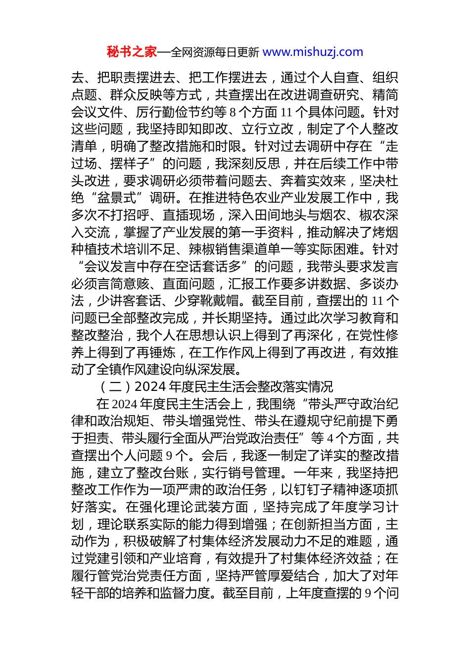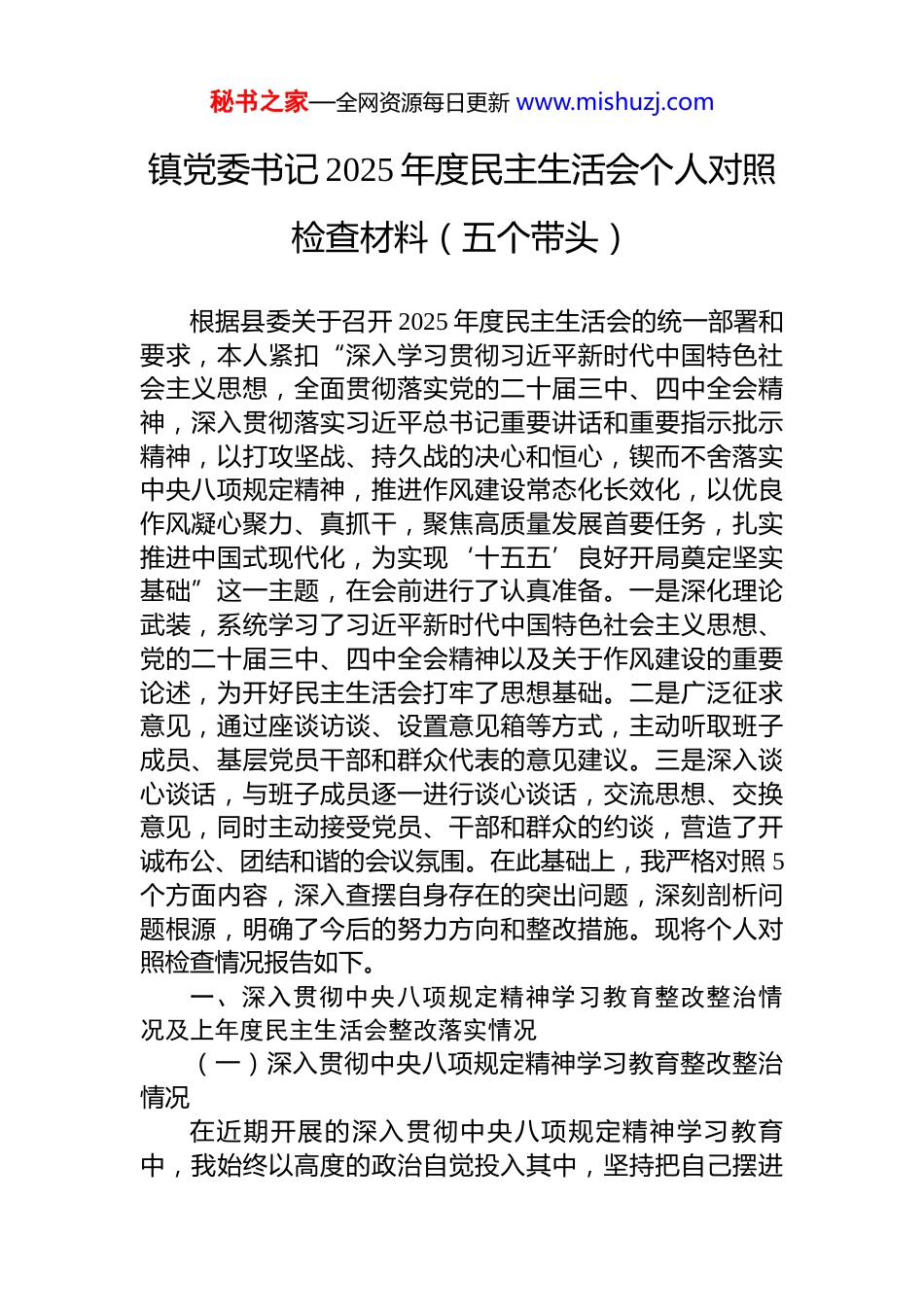 秘书之家—全网资源每日更新 www.mishuzj.com镇党委书记 2025 年度民主生活会个人对照检查材料(五个带头)根据县委关于召开 2025 年度民主生活会的统一部署和要求,本人紧扣“深入学习贯彻习近平新时代中国特色社会主义思想,全面贯彻落实党的二十届三中、四中全会精神,深入贯彻落实习近平总书记重要讲话和重要指示批示精神,以打攻坚战、持久战的决心和恒心,锲而不舍落实中央八项规定精神,推进作风建设常态化长效化,以优良作风凝心聚力、真抓干,聚焦高质量发展首要任务,扎实推进中国式现代化,为实现‘十五五’良好开局奠定坚实基础”这一主题,在会前进行了认真准备。一是深化理论武装,系统学习了习近平新时代中国特色社会主义思想、党的二十届三中、四中全会精神以及关于作风建设的重要论述,为开好民主生活会打牢了思想基础。二是广泛征求意见,通过座谈访谈、设置意见箱等方式,主动听取班子成员、基层党员干部和群众代表的意见建议。三是深入谈心谈话,与班子成员逐一进行谈心谈话,交流思想、交换意见,同时主动接受党员、干部和群众的约谈,营造了开诚布公、团结和谐的会议氛围。在此基础上,我严格对照 5个方面内容,深入查摆自身存在的突出问题,深刻剖析问题根源,明确了今后的努力方向和整改措施。现将个人对照检查情况报告如下。一、深入贯彻中央八项规定精神学习教育整改整治情况及上年度民主生活会整改落实情况(一)深入贯彻中央八项规定精神学习教育整改整治情况在近期开展的深入贯彻中央八项规定精神学习教育中,我始终以高度的政治自觉投入其中,坚持把自己摆进秘书之家—全网资源每日更新 www.mishuzj.com去、把职责摆进去、把工作摆进去,通过个人自查、组织点题、群众反映等方式,共查摆出在改进调查研究、精简会议文件、厉行勤俭节约等 8 个方面 11 个具体问题。针对这些问题,我坚持即知即改、立行立改,制定了个人整改清单,明确了整改措施和时限。针对过去调研中存在“走过场、摆样子”的问题,我深刻反思,并在后续工作中带头改进,要求调研必须带着问题去、奔着实效来,坚决杜绝“盆景式”调研。在推进特色农业产业发展工作中,我多次不打招呼、直插现场,深入田间地头与烟农、椒农深入交流,掌握了产业发展的第一手资料,推动解决了烤烟种植技术培训不足、辣椒销售渠道单一等实际困难。针对“会议发言中存在空话套话多”的问题,我带头要求发言必须言简意赅、直面问题,汇报工作要多讲数据、多谈办法,少讲客套话、少穿靴戴帽。截至目前,查摆出的 11 个问题已全部整改完成,并长期坚持。通过此次学习教育和整改整治,我个人在思想认识上得到了再深化,在党性修养上得到了再锤炼,在工作作风上得到了再改进,有效推动了全镇作风建设向纵深发展。(二)2024 年度民主生活会整改落实情况在 2024 年度民主生活会上,我围绕“带头严守政治纪律和政治规矩、带头增强党性、带头在遵规守纪前提下勇于担责、带头履行全面从严治党政治责任”等 4 个方面,共查摆出个人问题 9 个。会后,我逐一制定了详实的整改措施,建立了整改台账,实行销号管理。一年来,我坚持把整改工作作为一项严肃的政治任务,以钉钉子精神逐项抓好落实。在强化理论武装方面,坚持完成了年度学习计划,理论联系实际的能力得到增强;在创新担当方面,主动作为,积极破解了村集体经济发展动力不足的难题,通过党建引领和产业培育,有效提升了村集体经济效益;在履行管党治党责任方面,坚持严管厚爱结合,加大了对年轻干部的培养和监督力度。截至目前,上年度查摆的 9 个问秘书之家—全网资源每日更新 www.mishuzj.com题已全部整改到位,整改成果在推动全镇经济社会高质量发展中得到了体现,班子的凝聚力、战斗力进一步增强。二、存在的问题本人紧扣本次民主生活会主题,对照 5 个方面重点内容,通过深刻的自我检视,发现自身仍存在一些问题和不足。(一)在带头强化政治忠诚、提高政治能力方面一是在“两个确立”的政治领悟上还不够深刻透彻。虽然能够坚定拥护“两个确立”、坚决做到“两个维护”,但在思想深处,对“两个确立”的决定性意义与推动**镇...