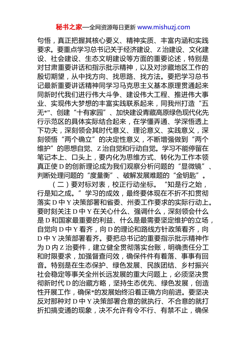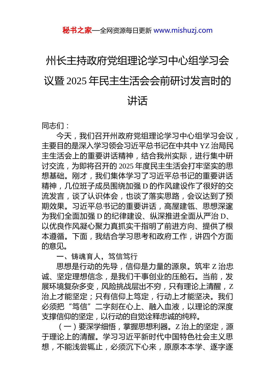 秘书之家—全网资源每日更新 www.mishuzj.com州长主持政府党组理论学习中心组学习会议暨 2025 年民主生活会会前研讨发言时的讲话同志们:今天,我们召开州政府党组理论学习中心组学习会议,主要目的是深入学习领会习近平总书记在中共中 YZ 治局民主生活会上的重要讲话精神,结合我州实际,进行集中研讨交流,为即将召开的 2025 年度民主生活会打牢坚实的思想基础。刚才,我们集体学习了习近平总书记的重要讲话精神,几位班子成员围绕加强 D 的作风建设作了很好的交流发言,谈了认识体会,也谈了落实思路,会议达到了预期效果。习近平总书记的重要讲话,高屋建瓴、思想深邃为我们全面加强 D 的纪律建设、纵深推进全面从严治 D、以优良作风凝心聚力真抓实干指明了前进方向、提供了根本遵循。下面,我结合学习思考和政府工作,讲四个方面的意见。一、铸魂育人,笃信笃行思想是行动的先导,信仰是力量的源泉。筑牢 Z 治忠诚、坚定理想信念,是我们干事创业的压舱石。当前,发展环境复杂多变,风险挑战层出不穷,只有理论上清醒,Z治上才能坚定;只有信仰上笃定,行动上才能坚决。我们必须把“笃信”二字刻在心上、融入血液,以理论的深度支撑信仰的坚定,以行动的自觉诠释忠诚的纯粹。(一)要深学细悟,掌握思想利器。Z 治上的坚定,源于理论上的清醒。学习习近平新时代中国特色社会主义思想,不能浅尝辄止,必须沉下心来,原原本本学、逐字逐秘书之家—全网资源每日更新 www.mishuzj.com句悟,真正把握其核心要义、精神实质、丰富内涵和实践要求。要重点学习总书记关于经济建设、Z 治建设、文化建设、社会建设、生态文明建设等方面的重要论述,特别是对甘肃重要讲话和指示批示精神,以及对涉藏地区工作的殷切期望,从中找方向、找思路、找方法。要把学习总书记最新重要讲话精神同学习马克思主义基本原理贯通起来同新时代我们进行伟大斗争、建设伟大工程、推进伟大事业、实现伟大梦想的丰富实践联系起来,同我州打造“五无*”、创建“十有家园”、加快建设青藏高原绿色现代化先行示范区的具体实际结合起来,在学懂弄通、学深悟透上下功夫,深刻领会其时代意义、理论意义、实践意义,深刻领悟“两个确立”的决定性意义,不断增强做到“两个维护”的思想自觉、Z 治自觉和行动自觉。学习不能停留在笔记本上、口头上,要内化为思维方式、转化为工作本领真正使 D 的创新理论成为我们观察分析问题的“显微镜”、判断处理问题的“度量衡”、破解发展难题的“金钥匙”。(二)要对标对表,校正行动坐标。“知是行之始,行是知之成。”学习的成效,最终要体现在不折不扣贯彻落实 D 中 Y 决策部署和省委、州委工作要求的实际行动上。要时刻关注 D 中 Y 在关心什么、强调什么,深刻领会什么是 D 和国家最重要的利益、什么是最需要坚定维护的立场,自觉向 D 中 Y 看齐,向 D 的理论和路线方针政策看齐,向D 中 Y 决策部署看齐。要把总书记的重要指示批示精神作为 D 内 Z 治要件,建立健全贯彻落实台账,明确责任分工和时限要求,加强督查问效,确保件件有着落、事事有回音。特别是在生态保护、绿色发展、民族团结、乡村振兴社会稳定等事关全州长远发展的重大问题上,必须坚决贯彻新时代 D 的治藏方略,坚持生态优先、绿色发展,创造性开展工作,确保*的发展始终沿着正确方向前进。要坚决反对那种对 D 中 Y 决策部署合意的就执行、不合意的就打折扣搞变通的现象,决不允许有令不行、有禁不止,确保秘书之家—全网资源每日更新 www.mishuzj.com政令畅通、执行有力,以“时时放心不下”的责任感,把总书记为*擘画的蓝图一步步变为现实。(三)要知行合一,夯实忠诚根基。“纸上得来终觉浅,绝知此事要躬行。”对 D 忠诚,不是抽象的口号,而是具体的行动。它体现在贯彻落实 D 中 Y 决策部署的自觉性上,体现在履职尽责、做好本职工作的实效上,体现在日常言行之中。全州政府系统 D 员干部,特别是领导干部,要把对 D 忠诚作为首要 Z 治品质,把“两个维护”作为最高 Z 治原则和根本 Z 治规矩,融入灵魂、见诸行动。要自觉加强 Z...