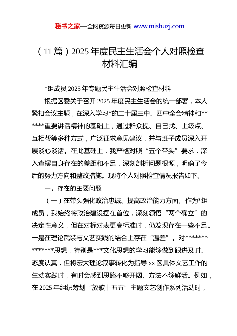 秘书之家—全网资源每日更新 www.mishuzj.com(11 篇)2025 年度民主生活会个人对照检查材料汇编*组成员 2025 年专题民主生活会对照检查材料根据区委关于召开 2025 年度民主生活会的统一部署,本人紧扣会议主题,在深入学习*的二十届三中、四中全会精神和******重要讲话精神的基础上,通过群众提、自己找、上级点、互相帮等多种方式,广泛征求意见建议,并与班子成员深入开展谈心谈话。在此基础上,我严格对照“五个带头”要求,深入查摆自身存在的差距和不足,深刻剖析问题根源,明确了今后的努力方向和整改措施。现将个人对照检查情况报告如下。一、存在的主要问题(一)在带头强化政治忠诚、提高政治能力方面。作为*组成员,我始终将政治建设摆在首位,深刻领悟“两个确立”的决定性意义,但在对标对表更高标准时,仍发现存在一些不足。一是在理论武装与文艺实践的结合上存在“温差”。对**************思想,特别是***文化思想的学习能够做到跟进及时、态度认真,但将宏大理论叙事转化为指导 xx 区具体文艺工作的生动实践时,有时会感到思路不够开阔、方法不够鲜活。例如,在 2025 年组织筹划“放歌十五五”主题文艺创作系列活动时,秘书之家—全网资源每日更新 www.mishuzj.com最初的方案设计更多是对“十五五”规划建议中相关条文的图解式呈现,对于如何用艺术语言深刻诠释新发展理念、展现高质量发展的人文内涵,思考得不够深入,导致初步构想的作品艺术感染力不足,后来在集体研讨中才得以深化和完善。二是政治敏锐性和鉴别力有待进一步增强。在日常工作中能够坚守政治原则,但在面对一些文艺领域出现的新思潮、新现象时,偶尔会存在“后知后觉”的情况。比如,在一次关于网络文学作品的研讨会上,对于部分作品中夹带的“历史虚无主义”错误观点,我虽然在思想上有所警惕,但未能第一时间从维护意识形态安全的高度进行深刻剖析和有力批驳,对青年文艺工作者的引导不够及时到位,反映出在复杂舆论环境下的斗争精神和敏锐性仍需锤炼。三是在贯彻落实上级决策部署时存在机械执行的倾向。对于上级文联和区委区政府的工作部署,能够做到不折不扣地执行,但在结合 xx 区文艺工作实际、创造性地开展工作方面,主动性和创新性尚有欠缺。例如,在落实“文艺两新”群体的团结引领工作时,我更多地是按照上级文件要求,完成了建立联系台账、组织常规座谈等“规定动作”,但在如何针对他们思想活跃、流动性强的特点,设计更具吸引力和凝聚力的活动载体方面,探索不够深入,导致工作的实际效果与预期目标存在一定差距。秘书之家—全网资源每日更新 www.mishuzj.com(二)在带头固本培元、增强*性方面。我始终注重加强*性修养,但反躬自省,发现自己在“内功”修炼上还存在薄弱环节,*性锤炼的自觉性和彻底性有待提高。一是*性分析的深刻性不足。在参加组织生活时,能够坦诚地进行自我批评,但有时对问题的剖析习惯于从工作层面找原因,未能真正做到深挖思想根源、触及灵魂深处。在 2025 年上半年的一次组织生活会上,我反思某项文艺惠民活动群众参与度不高的问题时,将原因归结为宣传力度不够、活动形式单一,而没有进一步反思这背后是否是自己宗旨意识弱化、深入群众调研不够的体现,自我解剖的“手术刀”不够锋利。二是理想信念的淬炼不够持续。在日常工作中,能够坚定共产主义远大理想和中国特色社会主义共同理想,但在面对繁重琐碎的行政事务时,偶尔会产生“先完成任务再说”的念头,用事务工作的繁忙代替了*性锻炼的坚持。比如,在负责推进《xx》文艺期刊的编辑出版工作时,我将主要精力投入到组稿、审校、印刷等具体流程中,有时会忽视通过编辑工作向广大文艺爱好者传播*的创新理论、弘扬社会主义核心价值观这一根本职责,把业务工作和 dj 工作割裂开来。三是在价值追求的坚守上偶有松懈。能够做到明大德、守公德、严私德,但在面对文艺界的一些不良风气时,有时态度不够鲜明、斗争不够坚决。例如,在一次文艺奖项的评审过秘书之家—全网资源每日更新 www.mishuzj.com程中,对于个别评委提出的“圈子化”“人情化”倾向的评审意见,我虽然内心不赞同,但考虑...