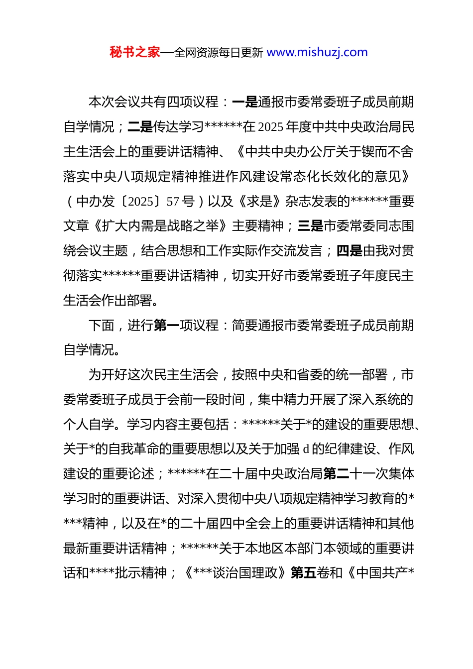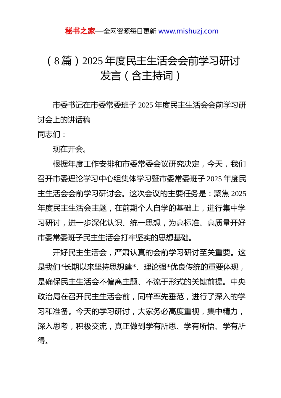 秘书之家—全网资源每日更新 www.mishuzj.com(8 篇)2025 年度民主生活会会前学习研讨发言(含主持词)市委书记在市委常委班子 2025 年度民主生活会会前学习研讨会上的讲话稿同志们:现在开会。根据年度工作安排和市委常委会议研究决定,今天,我们召开市委理论学习中心组集体学习暨市委常委班子 2025 年度民主生活会会前学习研讨会。这次会议的主要任务是:聚焦 2025年度民主生活会主题,在前期个人自学的基础上,进行集中学习研讨,进一步深化认识、统一思想,为高标准、高质量开好市委常委班子民主生活会打牢坚实的思想基础。开好民主生活会,严肃认真的会前学习研讨至关重要。这是我们*长期以来坚持思想建*、理论强*优良传统的重要体现,是确保民主生活会不偏离主题、不流于形式的关键前提。中央政治局在召开民主生活会前,同样率先垂范,进行了深入的学习和准备。今天的学习研讨,大家务必高度重视,集中精力,深入思考,积极交流,真正做到学有所思、学有所悟、学有所得。秘书之家—全网资源每日更新 www.mishuzj.com本次会议共有四项议程:一是通报市委常委班子成员前期自学情况;二是传达学习******在 2025 年度中共中央政治局民主生活会上的重要讲话精神、《中共中央办公厅关于锲而不舍落实中央八项规定精神推进作风建设常态化长效化的意见》(中办发〔2025〕57 号)以及《求是》杂志发表的******重要文章《扩大内需是战略之举》主要精神;三是市委常委同志围绕会议主题,结合思想和工作实际作交流发言;四是由我对贯彻落实******重要讲话精神,切实开好市委常委班子年度民主生活会作出部署。下面,进行第一项议程:简要通报市委常委班子成员前期自学情况。为开好这次民主生活会,按照中央和省委的统一部署,市委常委班子成员于会前一段时间,集中精力开展了深入系统的个人自学。学习内容主要包括:******关于*的建设的重要思想、关于*的自我革命的重要思想以及关于加强 d 的纪律建设、作风建设的重要论述;******在二十届中央政治局第二十一次集体学习时的重要讲话、对深入贯彻中央八项规定精神学习教育的****精神,以及在*的二十届四中全会上的重要讲话精神和其他最新重要讲话精神;******关于本地区本部门本领域的重要讲话和****批示精神;《***谈治国理政》第五卷和《中国共产*秘书之家—全网资源每日更新 www.mishuzj.com章程》、《中国共产 dj 律处分条例》等*内重要法规。从反馈的情况看,各位常委同志态度端正,能够严格按照要求,静下心来读原著、学原文、悟原理。大家普遍认识到,加强理论学习是提升政治能力、强化*性修养的根本途径,必须贯穿于民主生活会全过程。一些同志在自学中,注重结合分管领域工作实际进行思考,初步梳理了自身存在的问题和不足;有的同志重温了中央八项规定及其实施细则的每一项具体要求,对照检视自身在作风方面的差距。总体来看,通过前期的个人自学,常委班子的各位同志对开好民主生活会的重大意义认识更加深刻,对需要把握的重点内容理解更加透彻,为今天集中研讨和下一步对照检查、开展批评与自我批评奠定了较好的思想基础。希望同志们继续保持这种学习劲头和思考深度,并将其带入接下来的议程中。………………下面,进行第二项议程:传达学习近期中央重要会议和文件精神。首先,传达学习******在 2025 年度中共中央政治局民主生活会上的重要讲话精神。中共中央政治局于 12 月 25 日至 26 日召开民主生活会,深入学习贯彻**************思想,全面贯彻落实*的二十届四中全会精神,围绕锲而不舍落实中央八项规秘书之家—全网资源每日更新 www.mishuzj.com定精神,推进作风建设常态化长效化,进行自我检视、*性分析,开展批评和自我批评。******主持会议并发表重要讲话,他指出,这次民主生活会开得很有成效,增强了中央政治局的凝聚力、战斗力。******强调,*的十八大以来,我们从中央政治局做起,从贯彻中央八项规定精神入手,着力纠治“四风”,成效显著。要坚持把中央八项规定作为铁规矩、硬杠杠,毫不松懈整治“四风”顽瘴痼疾,不断推进作风建设常态化长效化。中央政治局的同志要当好*性*风标杆...