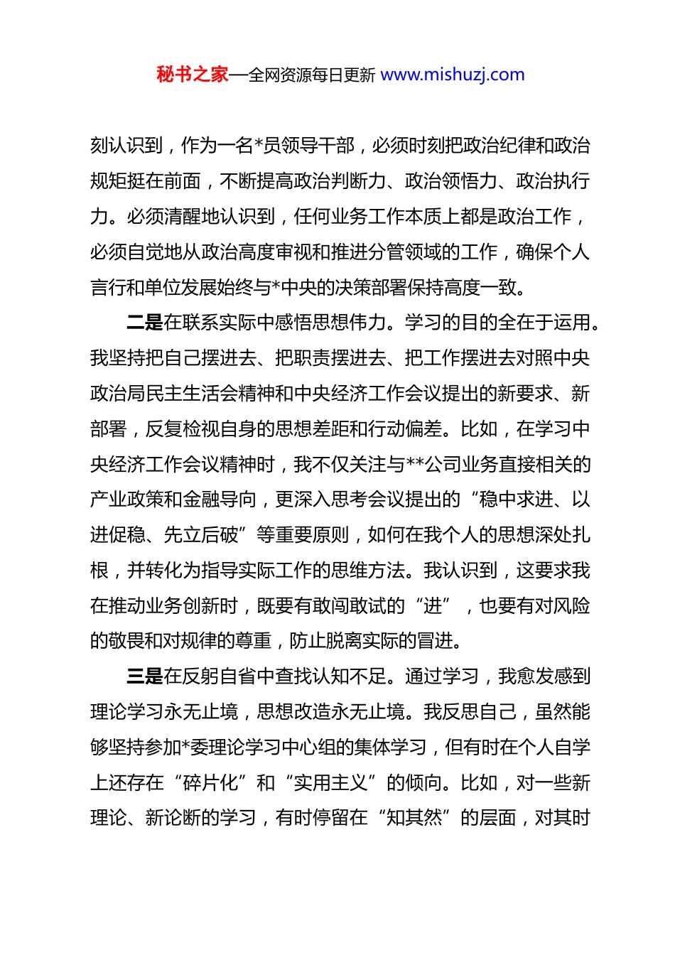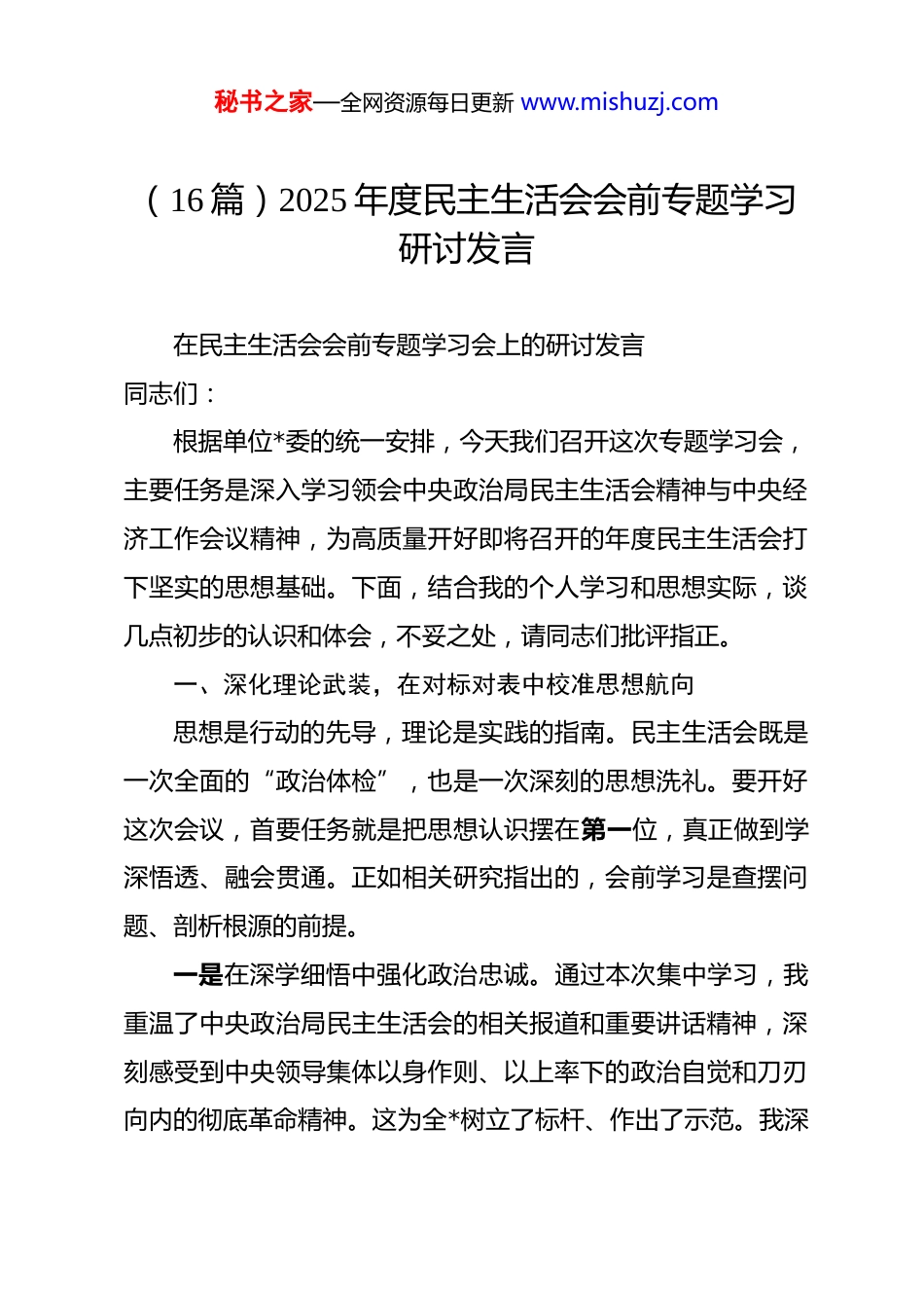 秘书之家—全网资源每日更新 www.mishuzj.com(16 篇)2025 年度民主生活会会前专题学习研讨发言在民主生活会会前专题学习会上的研讨发言同志们:根据单位*委的统一安排,今天我们召开这次专题学习会,主要任务是深入学习领会中央政治局民主生活会精神与中央经济工作会议精神,为高质量开好即将召开的年度民主生活会打下坚实的思想基础。下面,结合我的个人学习和思想实际,谈几点初步的认识和体会,不妥之处,请同志们批评指正。一、深化理论武装,在对标对表中校准思想航向思想是行动的先导,理论是实践的指南。民主生活会既是一次全面的“政治体检”,也是一次深刻的思想洗礼。要开好这次会议,首要任务就是把思想认识摆在第一位,真正做到学深悟透、融会贯通。正如相关研究指出的,会前学习是查摆问题、剖析根源的前提。一是在深学细悟中强化政治忠诚。通过本次集中学习,我重温了中央政治局民主生活会的相关报道和重要讲话精神,深刻感受到中央领导集体以身作则、以上率下的政治自觉和刀刃向内的彻底革命精神。这为全*树立了标杆、作出了示范。我深秘书之家—全网资源每日更新 www.mishuzj.com刻认识到,作为一名*员领导干部,必须时刻把政治纪律和政治规矩挺在前面,不断提高政治判断力、政治领悟力、政治执行力。必须清醒地认识到,任何业务工作本质上都是政治工作,必须自觉地从政治高度审视和推进分管领域的工作,确保个人言行和单位发展始终与*中央的决策部署保持高度一致。二是在联系实际中感悟思想伟力。学习的目的全在于运用。我坚持把自己摆进去、把职责摆进去、把工作摆进去对照中央政治局民主生活会精神和中央经济工作会议提出的新要求、新部署,反复检视自身的思想差距和行动偏差。比如,在学习中央经济工作会议精神时,我不仅关注与**公司业务直接相关的产业政策和金融导向,更深入思考会议提出的“稳中求进、以进促稳、先立后破”等重要原则,如何在我个人的思想深处扎根,并转化为指导实际工作的思维方法。我认识到,这要求我在推动业务创新时,既要有敢闯敢试的“进”,也要有对风险的敬畏和对规律的尊重,防止脱离实际的冒进。三是在反躬自省中查找认知不足。通过学习,我愈发感到理论学习永无止境,思想改造永无止境。我反思自己,虽然能够坚持参加*委理论学习中心组的集体学习,但有时在个人自学上还存在“碎片化”和“实用主义”的倾向。比如,对一些新理论、新论断的学习,有时停留在“知其然”的层面,对其时秘书之家—全网资源每日更新 www.mishuzj.com代背景、深刻内涵和实践要求的“所以然”钻研得不够深、不够透。这种学习上的欠缺,直接影响了思想认识的高度和工作谋划的深度,这是我必须正视并加以改进的。二、坚持问题导向,以动真碰硬的态度剖析自我民主生活会的核心在于严肃开展批评和自我批评。自我批评必须要有勇气和担当,敢于揭短亮丑,触及思想和灵魂的深处。对照学习内容和*员标准,结合同志们在会前谈心谈话中对我提出的宝贵意见,我初步查摆了自身存在的一些问题和不足。一是在理想信念的锤炼上还需持续加压。我始终坚信共产主义远大理想,但在具体的实践中,有时会不自觉地把远大理想和现实工作割裂开来。面对当前错综复杂的经济金融形势和公司转型发展的艰巨任务,偶尔会产生畏难情绪和本领恐慌,攻坚克难的锐气和斗争精神有所减弱。究其根源,还是在于*性修养的“内功”练得不够扎实未能时时刻刻用最高标准来要求自己,导致在面对重大挑战时,思想深处的韧劲和定力出现松动。二是在宗旨意识的践行上还需继续深化。作为班子成员,我深知自己手中的权力来自人民,必须服务于企业发展和职工群众。在工作中,我也努力做到深入基层、了解实情。但我必须坦诚,这种“深入”的质量还有待提高。有时下去调研,听秘书之家—全网资源每日更新 www.mishuzj.com取汇报、开座谈会多,与一线员工进行“零距离”、不设防的谈心交流少;关心工作任务完成情况多,对员工思想动态、家庭困难等方面的关心关怀少。这反映出我内心深处的群众观念还不够牢固,没有真正做到从根本上解决“为了谁、依靠谁、我是谁”的问题。三是在工作作风的改进上还...