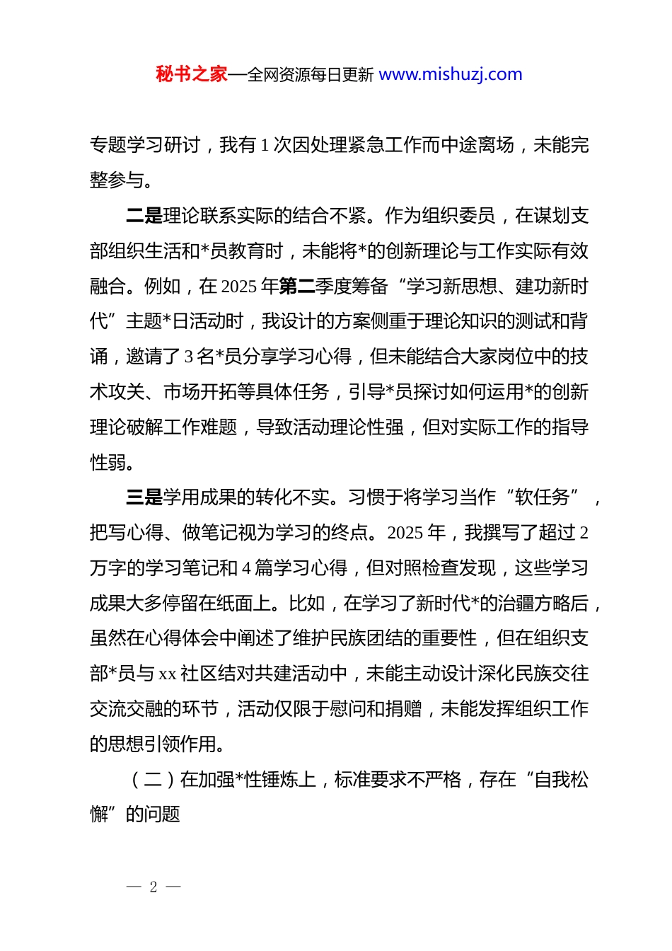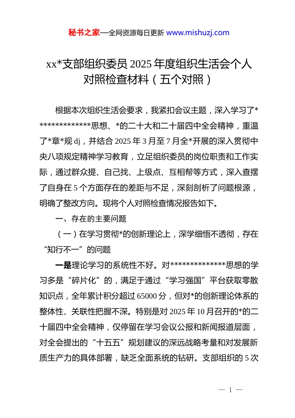 秘书之家—全网资源每日更新 www.mishuzj.comxx*支部组织委员 2025 年度组织生活会个人对照检查材料(五个对照)根据本次组织生活会要求,我紧扣会议主题,深入学习了**************思想、*的二十大和二十届四中全会精神,重温了*章*规 dj,并结合 2025 年 3 月至 7 月全*开展的深入贯彻中央八项规定精神学习教育,立足组织委员的岗位职责和工作实际,通过群众提、自己找、上级点、互相帮等方式,深入查摆了自身在 5 个方面存在的差距与不足,深刻剖析了问题根源,明确了整改方向。现将个人对照检查情况报告如下。一、存在的主要问题(一)在学习贯彻*的创新理论上,深学细悟不透彻,存在“知行不一”的问题一是理论学习的系统性不好。对**************思想的学习多是“碎片化”的,满足于通过“学习强国”平台获取零散知识点,全年累计积分超过 65000 分,但对*的创新理论体系的整体性、关联性把握不深。特别是对 2025 年 10 月召开的*的二十届四中全会精神,仅停留在学习会议公报和新闻报道层面,对全会提出的“十五五”规划建议的深远战略考量和对发展新质生产力的具体部署,缺乏全面系统的钻研。支部组织的 5 次— 1 —秘书之家—全网资源每日更新 www.mishuzj.com专题学习研讨,我有 1 次因处理紧急工作而中途离场,未能完整参与。二是理论联系实际的结合不紧。作为组织委员,在谋划支部组织生活和*员教育时,未能将*的创新理论与工作实际有效融合。例如,在 2025 年第二季度筹备“学习新思想、建功新时代”主题*日活动时,我设计的方案侧重于理论知识的测试和背诵,邀请了 3 名*员分享学习心得,但未能结合大家岗位中的技术攻关、市场开拓等具体任务,引导*员探讨如何运用*的创新理论破解工作难题,导致活动理论性强,但对实际工作的指导性弱。三是学用成果的转化不实。习惯于将学习当作“软任务”,把写心得、做笔记视为学习的终点。2025 年,我撰写了超过 2万字的学习笔记和 4 篇学习心得,但对照检查发现,这些学习成果大多停留在纸面上。比如,在学习了新时代*的治疆方略后,虽然在心得体会中阐述了维护民族团结的重要性,但在组织支部*员与 xx 社区结对共建活动中,未能主动设计深化民族交往交流交融的环节,活动仅限于慰问和捐赠,未能发挥组织工作的思想引领作用。(二)在加强*性锤炼上,标准要求不严格,存在“自我松懈”的问题— 2 —秘书之家—全网资源每日更新 www.mishuzj.com一是政治修养的淬炼不深。存在“事务主义”倾向,认为作为组织委员,把发展*员、收缴*费、管理*员档案等具体工作做好就是讲政治。在日常工作中,过多地关注程序是否合规、材料是否齐全,而对*员的思想动态、政治表现的考察不够细致。2025 年,我与支部 32 名*员普遍谈心谈话仅 1 次,深度谈话不足 10 人,对个别*员出现的思想波动和情绪变化,未能第一时间察觉并予以引导,政治敏锐性和政治鉴别力不强。二是纪律规矩的敬畏不强。对 d 的纪律规矩,特别是政治纪律和政治规矩,存在“与己无关”的麻痹思想,认为自己作为基层*员干部,只要不贪不腐,就不会触碰红线。在实际工作中,有时会将工作纪律等同于政治纪律。去年 11 月,在一次讨论预备*员转正的支委会上,会议已明确要求**,但我会后在与一位老*员闲聊时,无意中透露了讨论的细节和结果,虽然未造成严重后果,但反映出我严守纪律的弦绷得不紧。三是斗争精神的磨砺不坚。面对意识形态领域的复杂斗争,缺乏主动亮剑的勇气。作为组织委员,有责任引导*员坚定立场,但在面对网络上一些抹黑*的历史、质疑*的政策的错误言论时,我多数时候选择“一划而过”或“不看不听”,而不是理直气壮地予以批驳和澄清。2025 年全年,我仅在工作群中转发过 3次正面宣传链接,主动撰写评论、引导舆论的次数为零,在维— 3 —秘书之家—全网资源每日更新 www.mishuzj.com护*的形象和威信上,先锋模范作用发挥不彻底。(三)在联系服务职工群众上,宗旨意识不牢固,存在“高高在上”的问题一是深入基层的脚步不勤。习惯于坐在办公室通过电话、微信群了解情况、安排工作,与职工群众面对面交流...