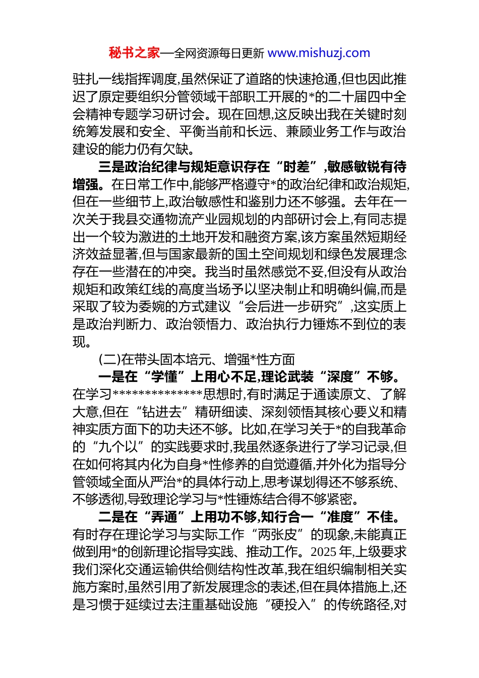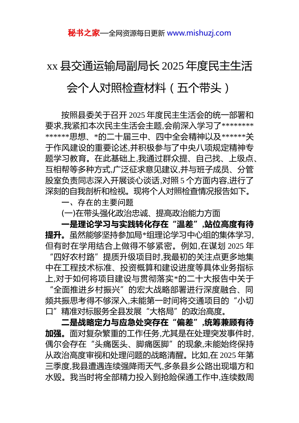 秘书之家—全网资源每日更新 www.mishuzj.comxx 县交通运输局副局长 2025 年度民主生活会个人对照检查材料(五个带头)按照县委关于召开 2025 年度民主生活会的统一部署和要求,我紧扣本次民主生活会主题,会前深入学习了**************思想、*的二十届三中、四中全会精神以及******关于作风建设的重要论述,并积极参与了中央八项规定精神专题学习教育。在此基础上,我通过群众提、自己找、上级点、互相帮等多种方式,广泛征求意见建议,并与班子成员、分管股室负责同志深入开展谈心谈话,对照 5 个方面内容,进行了深刻的自我剖析和检视。现将个人对照检查情况报告如下。一、存在的主要问题(一)在带头强化政治忠诚、提高政治能力方面一是理论学习与实践转化存在“温差”,站位高度有待提升。虽然能够坚持参加局*组理论学习中心组的集体学习,但有时在学用结合上做得不够紧密。例如,在谋划 2025 年“四好农村路”提质升级项目时,我最初的关注点更多地集中在工程技术标准、投资概算和建设进度等具体业务指标上,对于如何将项目建设与贯彻落实*的二十大报告中关于“全面推进乡村振兴”的宏大战略部署进行深度融合、同频共振思考得不够深入,未能第一时间将交通项目的“小切口”精准对标服务全县发展“大格局”的政治高度。二是战略定力与应急处突存在“偏差”,统筹兼顾有待加强。面对复杂繁重的工作任务,尤其是在处理突发事件时,偶尔会存在“头痛医头、脚痛医脚”的现象,未能始终保持从政治高度审视和处理问题的战略清醒。比如,在 2025 年第三季度,我县遭遇连续强降雨天气,多条县乡公路出现塌方和水毁。我当时将全部精力投入到抢险保通工作中,连续数周秘书之家—全网资源每日更新 www.mishuzj.com驻扎一线指挥调度,虽然保证了道路的快速抢通,但也因此推迟了原定要组织分管领域干部职工开展的*的二十届四中全会精神专题学习研讨会。现在回想,这反映出我在关键时刻统筹发展和安全、平衡当前和长远、兼顾业务工作与政治建设的能力仍有欠缺。三是政治纪律与规矩意识存在“时差”,敏感敏锐有待增强。在日常工作中,能够严格遵守*的政治纪律和政治规矩,但在一些细节上,政治敏感性和鉴别力还不够强。去年在一次关于我县交通物流产业园规划的内部研讨会上,有同志提出一个较为激进的土地开发和融资方案,该方案虽然短期经济效益显著,但与国家最新的国土空间规划和绿色发展理念存在一些潜在的冲突。我当时虽然感觉不妥,但没有从政治规矩和政策红线的高度当场予以坚决制止和明确纠偏,而是采取了较为委婉的方式建议“会后进一步研究”,这实质上是政治判断力、政治领悟力、政治执行力锤炼不到位的表现。(二)在带头固本培元、增强*性方面一是在“学懂”上用心不足,理论武装“深度”不够。在学习**************思想时,有时满足于通读原文、了解大意,但在“钻进去”精研细读、深刻领悟其核心要义和精神实质方面下的功夫还不够。比如,在学习关于*的自我革命的“九个以”的实践要求时,我虽然逐条进行了学习记录,但在如何将其内化为自身*性修养的自觉遵循,并外化为指导分管领域全面从严治*的具体行动上,思考谋划得还不够系统、不够透彻,导致理论学习与*性锤炼结合得不够紧密。二是在“弄通”上用功不够,知行合一“准度”不佳。有时存在理论学习与实际工作“两张皮”的现象,未能真正做到用*的创新理论指导实践、推动工作。2025 年,上级要求我们深化交通运输供给侧结构性改革,我在组织编制相关实施方案时,虽然引用了新发展理念的表述,但在具体措施上,还是习惯于延续过去注重基础设施“硬投入”的传统路径,对秘书之家—全网资源每日更新 www.mishuzj.com于如何通过优化运输组织模式、发展智慧交通、培育新业态等“软实力”来提升服务供给质量和效率,缺乏深入研究和创新举措,反映出对新发展理念的理解和运用尚未达到融会贯通的境界。三是在“做实”上用力不够,精神追求“纯度”不高。对照共产*人的精神谱系,反思自身在精神追求和*性修养上还存在差距。在面对一些历史遗留的交通信访难题时,尽管也多次下访约谈、协调处理,但当问题进展缓慢、群众不理解时,内心偶尔会产生畏难发愁的情绪,甚至有过“新官不理旧...