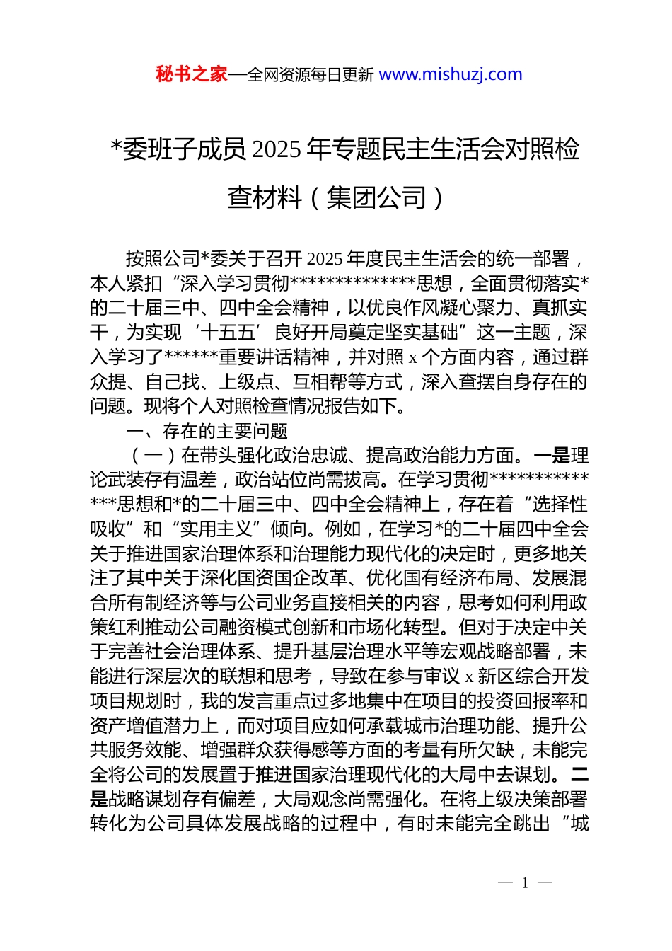 秘书之家—全网资源每日更新 www.mishuzj.com*委班子成员 2025 年专题民主生活会对照检查材料(集团公司)按照公司*委关于召开 2025 年度民主生活会的统一部署,本人紧扣“深入学习贯彻**************思想,全面贯彻落实*的二十届三中、四中全会精神,以优良作风凝心聚力、真抓实干,为实现‘十五五’良好开局奠定坚实基础”这一主题,深入学习了******重要讲话精神,并对照 x 个方面内容,通过群众提、自己找、上级点、互相帮等方式,深入查摆自身存在的问题。现将个人对照检查情况报告如下。一、存在的主要问题(一)在带头强化政治忠诚、提高政治能力方面。一是理论武装存有温差,政治站位尚需拔高。在学习贯彻**************思想和*的二十届三中、四中全会精神上,存在着“选择性吸收”和“实用主义”倾向。例如,在学习*的二十届四中全会关于推进国家治理体系和治理能力现代化的决定时,更多地关注了其中关于深化国资国企改革、优化国有经济布局、发展混合所有制经济等与公司业务直接相关的内容,思考如何利用政策红利推动公司融资模式创新和市场化转型。但对于决定中关于完善社会治理体系、提升基层治理水平等宏观战略部署,未能进行深层次的联想和思考,导致在参与审议 x 新区综合开发项目规划时,我的发言重点过多地集中在项目的投资回报率和资产增值潜力上,而对项目应如何承载城市治理功能、提升公共服务效能、增强群众获得感等方面的考量有所欠缺,未能完全将公司的发展置于推进国家治理现代化的大局中去谋划。二是战略谋划存有偏差,大局观念尚需强化。在将上级决策部署转化为公司具体发展战略的过程中,有时未能完全跳出“城— 1 —秘书之家—全网资源每日更新 www.mishuzj.com投”看“城投”,对全局性、长远性、战略性问题的把握不够精准。例如,在编制公司“十五五”规划初期草案时,面对公司较高的资产负债率和紧迫的化债压力我曾一度主张将未来两年的工作重心过度集中于能够快速产生现金流的商业地产和短期投资项目,以期迅速改善财务报表。这一思路虽然短期看似稳妥,却与市委、市政府关于在新发展阶段聚焦新型基础设施建设、推动城市更新、培育新质生产力的战略导向存在一定的“时差”。在*委会上,经过其他同志的提醒,我才深刻认识到,城投公司作为城市发展的“排头兵”,必须服务于城市整体战略,最终我们调整了规划方向,加大了对 x 智慧交通枢纽、x 片区老旧小区改造等既利长远又惠民生的重大项目的资源倾斜。三是风险研判存有盲区,底线思维尚需筑牢。对各类风险的认识和防范,有时更多地停留在经济和金融领域,对政治安全、意识形态、社会稳定等非传统安全风险的敏感性和警惕性不足。例如,在推动 x 大型文旅项目融资时,我的全部精力都放在了与金融机构的谈判、优化债务结构和降低融资成本上。对于项目推进过程中可能因征地拆迁、环境评估等问题引发的社会稳定风险,虽然在方案中有所提及,但在思想上并未给予足够的重视,认为这些是地方政府和具体执行部门的责任。这种思维盲区,实质上是未能将防范化解重大风险的底线思维贯穿到项目决策的全过程,一旦处理不当,不仅会延误项目工期,更可能损害*和政府在群众中的形象。(二)在带头固本培元、增强*性方面。一是理想信念“总开关”拧得不够紧,精神之钙补充不及时。在长期处理繁杂的经营管理事务,尤其是面对严峻的债务挑战和项目推进压力时,有时会不自觉地陷入“事务主义”,精神上产生疲惫感。虽然从未动摇过对*和人民事业的忠诚,但在*性锻炼的主动性和自觉性上有所减弱。有时参加主题*日活动或理论学习,思想上会当作一项必须完成的“任务”,满足于“已读”“已学”,而— 2 —秘书之家—全网资源每日更新 www.mishuzj.com缺乏那种真正触及灵魂、补足精神之“钙”的深刻感悟和强烈渴望。这种状态导致在面对一些历史遗留的“硬骨头”问题时,内心深处攻坚克难的革命锐气和一往无前的奋斗激情有所消退。二是组织生活“熔炉”淬炼不够纯,*性锤炼有待加强。在参加*委民主生活会或*支部组织生活会时,开展批评与自我批评的“辣味”不足。在自我批评时,有时会下意识地选择一些...