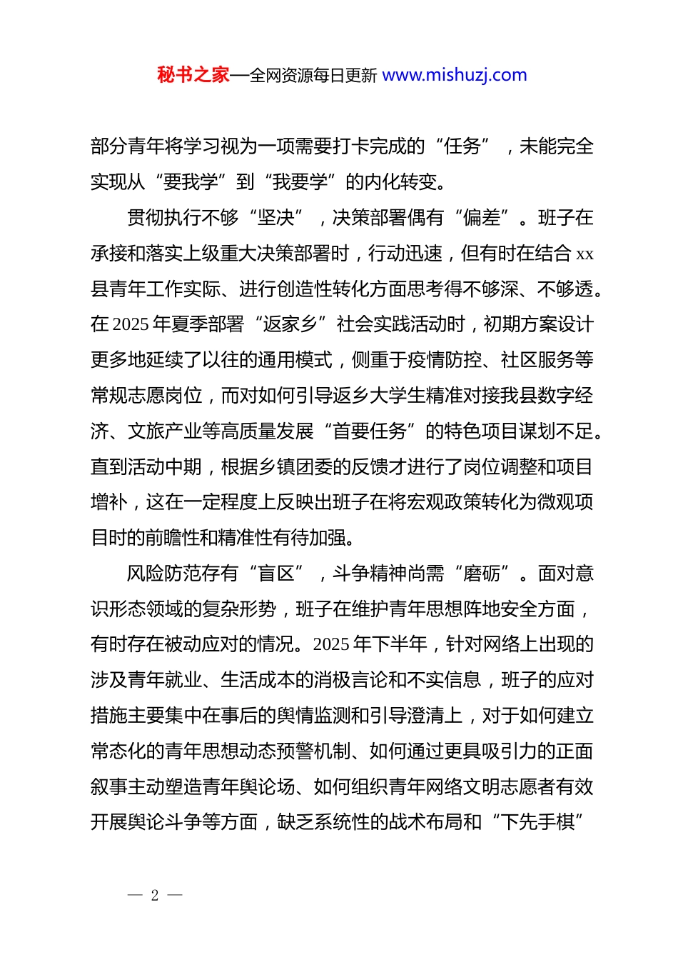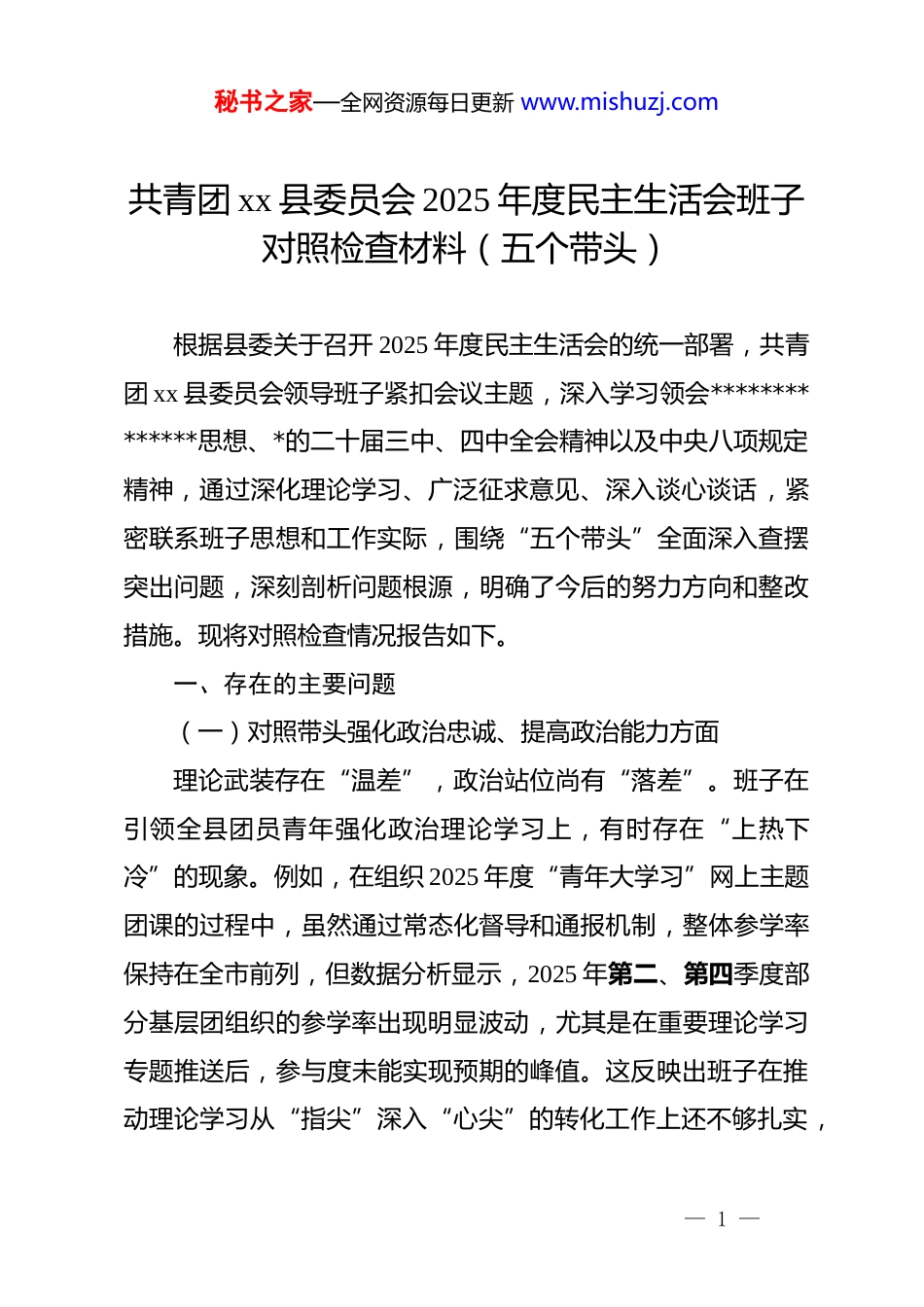 秘书之家—全网资源每日更新 www.mishuzj.com共青团 xx 县委员会 2025 年度民主生活会班子对照检查材料(五个带头)根据县委关于召开 2025 年度民主生活会的统一部署,共青团 xx 县委员会领导班子紧扣会议主题,深入学习领会**************思想、*的二十届三中、四中全会精神以及中央八项规定精神,通过深化理论学习、广泛征求意见、深入谈心谈话,紧密联系班子思想和工作实际,围绕“五个带头”全面深入查摆突出问题,深刻剖析问题根源,明确了今后的努力方向和整改措施。现将对照检查情况报告如下。一、存在的主要问题(一)对照带头强化政治忠诚、提高政治能力方面理论武装存在“温差”,政治站位尚有“落差”。班子在引领全县团员青年强化政治理论学习上,有时存在“上热下冷”的现象。例如,在组织 2025 年度“青年大学习”网上主题团课的过程中,虽然通过常态化督导和通报机制,整体参学率保持在全市前列,但数据分析显示,2025 年第二、第四季度部分基层团组织的参学率出现明显波动,尤其是在重要理论学习专题推送后,参与度未能实现预期的峰值。这反映出班子在推动理论学习从“指尖”深入“心尖”的转化工作上还不够扎实,— 1 —秘书之家—全网资源每日更新 www.mishuzj.com部分青年将学习视为一项需要打卡完成的“任务”,未能完全实现从“要我学”到“我要学”的内化转变。贯彻执行不够“坚决”,决策部署偶有“偏差”。班子在承接和落实上级重大决策部署时,行动迅速,但有时在结合 xx县青年工作实际、进行创造性转化方面思考得不够深、不够透。在 2025 年夏季部署“返家乡”社会实践活动时,初期方案设计更多地延续了以往的通用模式,侧重于疫情防控、社区服务等常规志愿岗位,而对如何引导返乡大学生精准对接我县数字经济、文旅产业等高质量发展“首要任务”的特色项目谋划不足。直到活动中期,根据乡镇团委的反馈才进行了岗位调整和项目增补,这在一定程度上反映出班子在将宏观政策转化为微观项目时的前瞻性和精准性有待加强。风险防范存有“盲区”,斗争精神尚需“磨砺”。面对意识形态领域的复杂形势,班子在维护青年思想阵地安全方面,有时存在被动应对的情况。2025 年下半年,针对网络上出现的涉及青年就业、生活成本的消极言论和不实信息,班子的应对措施主要集中在事后的舆情监测和引导澄清上,对于如何建立常态化的青年思想动态预警机制、如何通过更具吸引力的正面叙事主动塑造青年舆论场、如何组织青年网络文明志愿者有效开展舆论斗争等方面,缺乏系统性的战术布局和“下先手棋”— 2 —秘书之家—全网资源每日更新 www.mishuzj.com的战略主动。(二)对照带头固本培元、增强*性方面理想信念教育方式“传统”,*性修养锤炼途径“单一”。班子在组织机关*员干部和团干部进行*性教育时,对传统的“三会两制一课”、集中学习等方式较为依赖,形式创新不足。2025 年 5 月,在组织学习新修订的《中国共产 dj 律处分条例》时,主要采用了领学宣讲和个人自学的模式。虽然完成了规定动作,但未能有效结合团干部年轻、思想活跃的特点,设计情景模拟、案例辨析等更具代入感的学习环节,导致部分年轻干部对 dj*规的理解停留在“不触碰红线”的浅层认知,未能深刻领会其背后蕴含的*性原则和精神实质。精神谱系传承有所“弱化”,红色基因融入尚欠“深化”。xx 县拥有丰富的红色文化资源,班子也注重利用这些资源开展青年教育活动。但在具体实践中,有时存在“重形式、轻实效”的倾向。2025 年清明节期间,组织了一批新入团的优秀中学生前往 xx 革命烈士陵园开展纪念活动,活动流程完整、场面庄重,但活动结束后,对于如何引导学生将现场的感动和震撼转化为持久的学习动力和报国之志,缺乏系统的后续设计,如主题征文、分享交流会、红色故事微视频创作等延伸活动未能及时跟进,使得红色教育的效果打了折扣。— 3 —秘书之家—全网资源每日更新 www.mishuzj.com价值观念引导浮于“说教”,道德品质涵养流于“表面”。在推动社会主义核心价值观融入青年日常生活方面,工作抓手不够具体,存在一定的“空对空”现象。例如,2025 年在全...