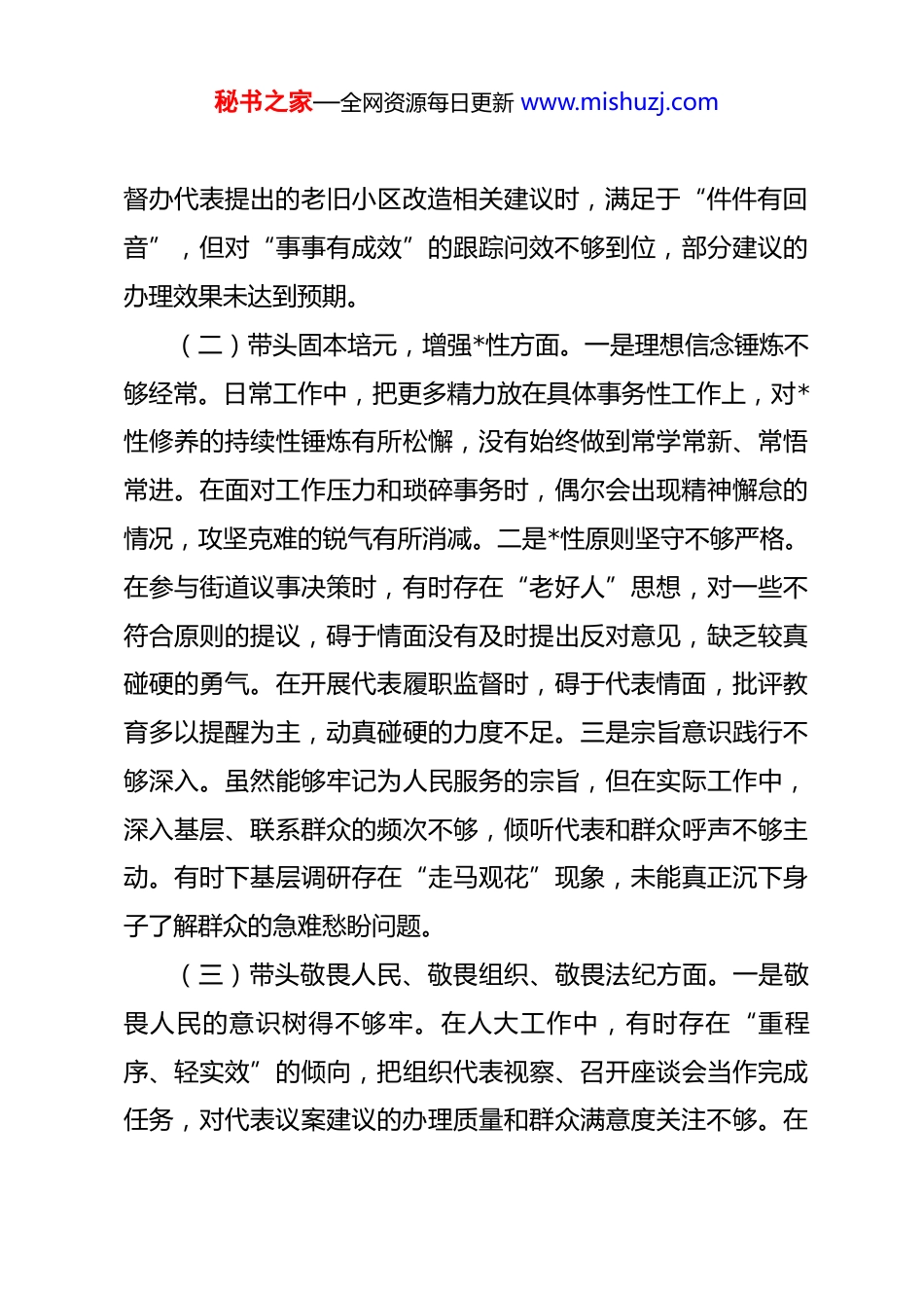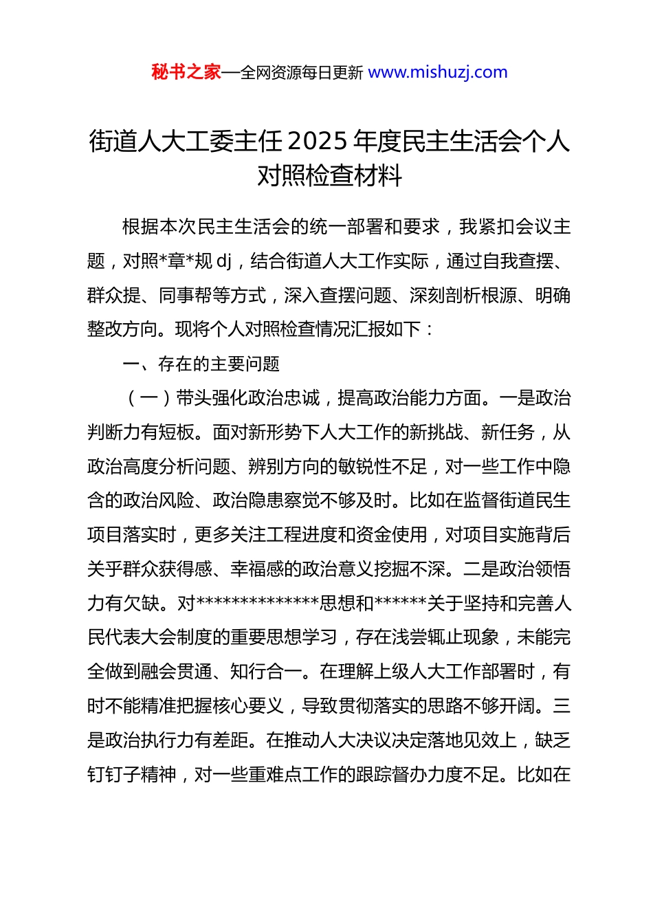 秘书之家—全网资源每日更新 www.mishuzj.com街道人大工委主任 2025 年度民主生活会个人对照检查材料根据本次民主生活会的统一部署和要求,我紧扣会议主题,对照*章*规 dj,结合街道人大工作实际,通过自我查摆、群众提、同事帮等方式,深入查摆问题、深刻剖析根源、明确整改方向。现将个人对照检查情况汇报如下:一、存在的主要问题(一)带头强化政治忠诚,提高政治能力方面。一是政治判断力有短板。面对新形势下人大工作的新挑战、新任务,从政治高度分析问题、辨别方向的敏锐性不足,对一些工作中隐含的政治风险、政治隐患察觉不够及时。比如在监督街道民生项目落实时,更多关注工程进度和资金使用,对项目实施背后关乎群众获得感、幸福感的政治意义挖掘不深。二是政治领悟力有欠缺。对**************思想和******关于坚持和完善人民代表大会制度的重要思想学习,存在浅尝辄止现象,未能完全做到融会贯通、知行合一。在理解上级人大工作部署时,有时不能精准把握核心要义,导致贯彻落实的思路不够开阔。三是政治执行力有差距。在推动人大决议决定落地见效上,缺乏钉钉子精神,对一些重难点工作的跟踪督办力度不足。比如在秘书之家—全网资源每日更新 www.mishuzj.com督办代表提出的老旧小区改造相关建议时,满足于“件件有回音”,但对“事事有成效”的跟踪问效不够到位,部分建议的办理效果未达到预期。(二)带头固本培元,增强*性方面。一是理想信念锤炼不够经常。日常工作中,把更多精力放在具体事务性工作上,对*性修养的持续性锤炼有所松懈,没有始终做到常学常新、常悟常进。在面对工作压力和琐碎事务时,偶尔会出现精神懈怠的情况,攻坚克难的锐气有所消减。二是*性原则坚守不够严格。在参与街道议事决策时,有时存在“老好人”思想,对一些不符合原则的提议,碍于情面没有及时提出反对意见,缺乏较真碰硬的勇气。在开展代表履职监督时,碍于代表情面,批评教育多以提醒为主,动真碰硬的力度不足。三是宗旨意识践行不够深入。虽然能够牢记为人民服务的宗旨,但在实际工作中,深入基层、联系群众的频次不够,倾听代表和群众呼声不够主动。有时下基层调研存在“走马观花”现象,未能真正沉下身子了解群众的急难愁盼问题。(三)带头敬畏人民、敬畏组织、敬畏法纪方面。一是敬畏人民的意识树得不够牢。在人大工作中,有时存在“重程序、轻实效”的倾向,把组织代表视察、召开座谈会当作完成任务,对代表议案建议的办理质量和群众满意度关注不够。在秘书之家—全网资源每日更新 www.mishuzj.com接待群众来访时,有时缺乏耐心细致的态度,未能真正站在群众的立场思考问题、解决问题。二是敬畏组织的观念守得不够严。对组织作出的决策部署,能够坚决执行,但在执行过程中,有时存在等靠观望思想,主动担当作为的意识不够强。在向组织汇报工作时,存在报喜多、报忧少的情况,对工作中存在的问题和不足,有时避重就轻、遮遮掩掩。三是敬畏法纪的思维筑得不够实。虽然能够严格遵守 dj 国法,但在日常工作中,对一些细微之处的纪律要求执行不够严格,存在“小节不拘”的思想。比如在公务接待、办公用品使用等方面,有时未能完全做到精打细算、厉行节约。(四)带头干事创业,担当作为方面。一是斗争精神不足。面对街道人大工作中的难点问题,比如代表履职积极性不高、监督工作缺乏刚性等,缺乏迎难而上、攻坚克难的勇气,习惯于按部就班开展工作,不敢打破常规、大胆探索。在面对一些不合理的诉求时,缺乏敢于说“不”的底气和魄力。二是创新锐气不够。在人大工作的方式方法上,存在路径依赖,习惯于沿用老套路、老办法,缺乏创新意识和创新举措。比如在代表履职培训上,形式单一,多以集中授课为主,缺乏互动性和实践性,导致培训效果不佳。在监督工作中,监督方式较为传统,缺乏运用信息化手段提升监督实效的探索。三是落实韧秘书之家—全网资源每日更新 www.mishuzj.com劲不强。在推动各项工作落实时,存在“虎头蛇尾”现象,对一些重点工作,前期部署轰轰烈烈,但后期跟踪督办不够有力,导致工作成效打折扣。比如在推进“无废城市”建设相关监督工作时,前期组织代...