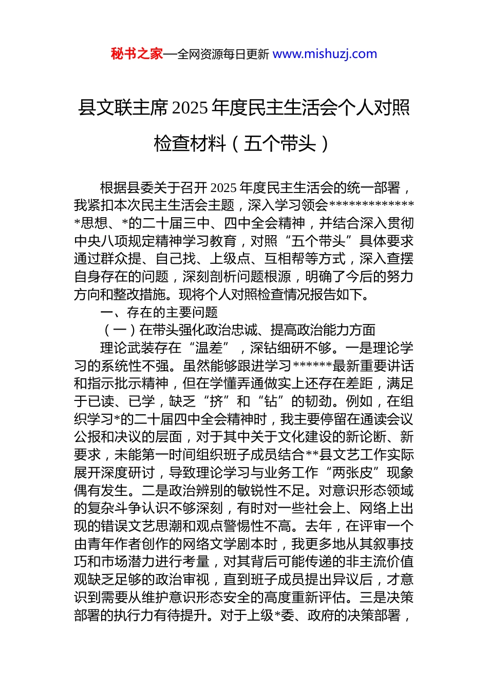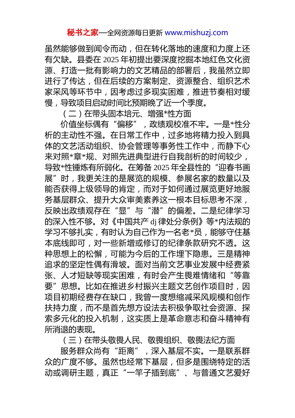 秘书之家—全网资源每日更新 www.mishuzj.com县文联主席 2025 年度民主生活会个人对照检查材料(五个带头)根据县委关于召开 2025 年度民主生活会的统一部署,我紧扣本次民主生活会主题,深入学习领会**************思想、*的二十届三中、四中全会精神,并结合深入贯彻中央八项规定精神学习教育,对照“五个带头”具体要求通过群众提、自己找、上级点、互相帮等方式,深入查摆自身存在的问题,深刻剖析问题根源,明确了今后的努力方向和整改措施。现将个人对照检查情况报告如下。一、存在的主要问题(一)在带头强化政治忠诚、提高政治能力方面理论武装存在“温差”,深钻细研不够。一是理论学习的系统性不强。虽然能够跟进学习******最新重要讲话和指示批示精神,但在学懂弄通做实上还存在差距,满足于已读、已学,缺乏“挤”和“钻”的韧劲。例如,在组织学习*的二十届四中全会精神时,我主要停留在通读会议公报和决议的层面,对于其中关于文化建设的新论断、新要求,未能第一时间组织班子成员结合**县文艺工作实际展开深度研讨,导致理论学习与业务工作“两张皮”现象偶有发生。二是政治辨别的敏锐性不足。对意识形态领域的复杂斗争认识不够深刻,有时对一些社会上、网络上出现的错误文艺思潮和观点警惕性不高。去年,在评审一个由青年作者创作的网络文学剧本时,我更多地从其叙事技巧和市场潜力进行考量,对其背后可能传递的非主流价值观缺乏足够的政治审视,直到班子成员提出异议后,才意识到需要从维护意识形态安全的高度重新评估。三是决策部署的执行力有待提升。对于上级*委、政府的决策部署,秘书之家—全网资源每日更新 www.mishuzj.com虽然能够做到闻令而动,但在转化落地的速度和力度上还有欠缺。县委在 2025 年初提出要深度挖掘本地红色文化资源、打造一批有影响力的文艺精品的部署后,我虽然立即进行了传达,但在后续的方案制定、资源整合、组织艺术家采风等环节中,因考虑过多现实困难,推进节奏相对缓慢,导致项目启动时间比预期晚了近一个季度。(二)在带头固本培元、增强*性方面价值坐标偶有“偏移”,政绩观校准不牢。一是*性分析的主动性不强。在日常工作中,过多地将精力投入到具体的文艺活动组织、协会管理等事务性工作中,而静下心来对照*章*规、对照先进典型进行自我剖析的时间较少,导致*性锤炼有所弱化。在筹备 2025 年全县性的“迎春书画展”时,我更关注的是展览的规模、参展名家的数量以及能否获得上级领导的肯定,而对于如何通过展览更好地服务基层群众、提升大众审美素养这一根本目标思考不深,反映出政绩观存在“显”与“潜”的偏差。二是纪律学习的深入性不够。对《中国共产 dj 律处分条例》等*内法规的学习不够扎实,有时认为自己作为一名老*员,能够守住基本底线即可,对一些新增或修订的纪律条款研究不透。这种思想上的松懈,可能为今后的工作埋下隐患。三是精神追求的坚定性偶有滑坡。面对当前文艺事业发展中经费紧张、人才短缺等现实困难,有时会产生畏难情绪和“等靠要”思想。比如在推进乡村振兴主题文艺创作项目时,因项目初期经费存在缺口,我曾一度想缩减采风规模和创作扶持力度,而不是首先想方设法去积极争取社会资源、探索多元化的投入机制,这实质上是革命意志和奋斗精神有所消退的表现。(三)在带头敬畏人民、敬畏组织、敬畏法纪方面服务群众尚有“距离”,深入基层不实。一是联系群众的广度不够。虽然也经常下基层,但多是围绕特定的活动或调研主题,真正“一竿子插到底”、与普通文艺爱好秘书之家—全网资源每日更新 www.mishuzj.com者和基层群众面对面交流的机会不多。“四下基层”制度落实得不够到位,存在走“规定路线”、看“示范盆景”的现象。2025 年组织的数次“文艺下乡”活动行程安排得比较满,与当地群众的互动多停留在活动现场的短暂交流未能抽出足够时间坐下来倾听他们对文联工作的真实意见和对精神文化生活的新期盼。二是执行民主的程序不严。在班子内部决策时,虽然坚持民主集中制原则,但有时在一些自己比较熟悉的领域,会不自觉地带有主观倾向。例如,在 2025 年一次讨论各协会年度活动经费...