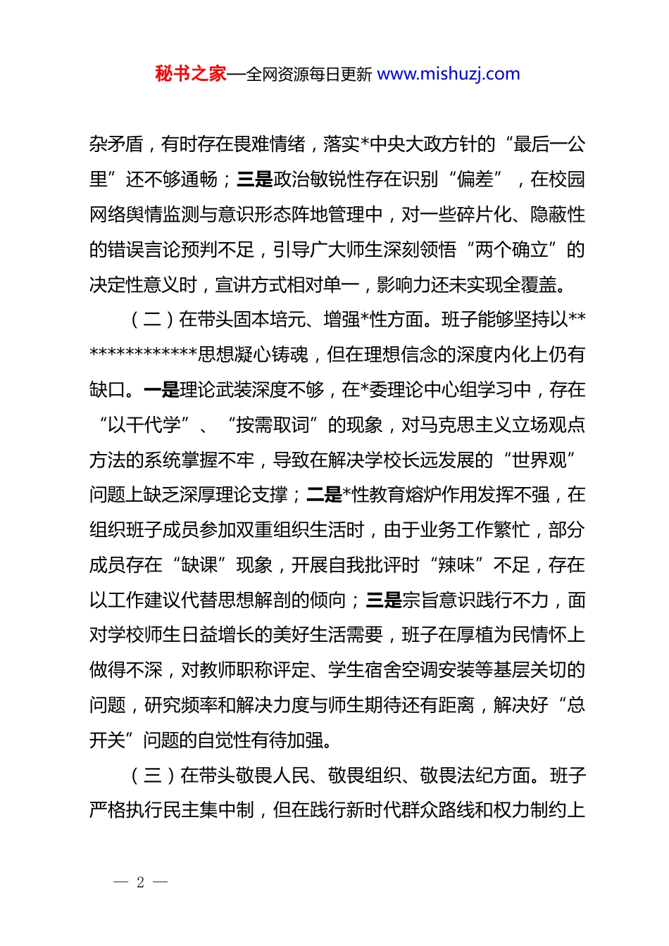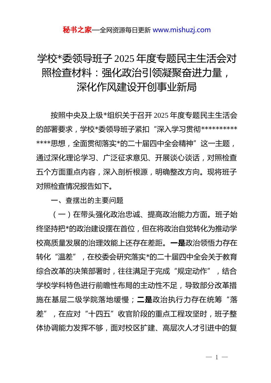 秘书之家—全网资源每日更新 www.mishuzj.com学校*委领导班子 2025 年度专题民主生活会对照检查材料:强化政治引领凝聚奋进力量,深化作风建设开创事业新局按照中央及上级*组织关于召开 2025 年度专题民主生活会的部署要求,学校*委领导班子紧扣“深入学习贯彻**************思想,全面贯彻落实*的二十届四中全会精神”这一主题,通过深化理论学习、广泛征求意见、开展谈心谈话,对照检查五个方面重点内容,深入剖析根源,明确整改方向。现将班子对照检查情况报告如下。一、查摆出的主要问题(一)在带头强化政治忠诚、提高政治能力方面。班子始终坚持把*的政治建设摆在首位,但在将政治自觉转化为推动学校高质量发展的治理效能上还存在差距。一是政治领悟力存在转化“温差”,在校委会研究落实*的二十届四中全会关于教育综合改革的决策部署时,往往满足于完成“规定动作”,结合学校学科特色进行前瞻性布局的主动性不足,导致部分改革措施在基层二级学院落地缓慢;二是政治执行力存在统筹“落差”,在应对“十四五”收官阶段的重点工程攻坚时,班子整体协调能力发挥不够,面对校区扩建、高层次人才引进中的复— 1 —秘书之家—全网资源每日更新 www.mishuzj.com杂矛盾,有时存在畏难情绪,落实*中央大政方针的“最后一公里”还不够通畅;三是政治敏锐性存在识别“偏差”,在校园网络舆情监测与意识形态阵地管理中,对一些碎片化、隐蔽性的错误言论预判不足,引导广大师生深刻领悟“两个确立”的决定性意义时,宣讲方式相对单一,影响力还未实现全覆盖。(二)在带头固本培元、增强*性方面。班子能够坚持以**************思想凝心铸魂,但在理想信念的深度内化上仍有缺口。一是理论武装深度不够,在*委理论中心组学习中,存在“以干代学”、“按需取词”的现象,对马克思主义立场观点方法的系统掌握不牢,导致在解决学校长远发展的“世界观”问题上缺乏深厚理论支撑;二是*性教育熔炉作用发挥不强,在组织班子成员参加双重组织生活时,由于业务工作繁忙,部分成员存在“缺课”现象,开展自我批评时“辣味”不足,存在以工作建议代替思想解剖的倾向;三是宗旨意识践行不力,面对学校师生日益增长的美好生活需要,班子在厚植为民情怀上做得不深,对教师职称评定、学生宿舍空调安装等基层关切的问题,研究频率和解决力度与师生期待还有距离,解决好“总开关”问题的自觉性有待加强。(三)在带头敬畏人民、敬畏组织、敬畏法纪方面。班子严格执行民主集中制,但在践行新时代群众路线和权力制约上— 2 —秘书之家—全网资源每日更新 www.mishuzj.com还有薄弱环节。一是“四下基层”制度落实不平衡,班子成员走进教室、走进食堂、走进教师家庭的深度不够,调研往往集中在重点学科和行政中心,对偏远教学点及后勤一线员工的疾苦掌握不及时,密切*群干群关系存在死角;二是民主集中制质量有待提高,在讨论重大基建招标、大额资金分配等敏感议题时,班子成员之间沟通酝酿有时不够充分,虽然符合程序要求,但在广泛吸纳基层学术组织、教代会意见方面做得不够细致,科学决策的民主基础需进一步夯实;三是权力运行监督存在盲区,在招标采购、招生录取等高风险领域,制度的“笼子”扎得不够紧,对特权思想和特权现象的警惕性有所下降,在落实“敬畏法纪”要求上尚未实现全过程、全方位的刚性约束。(四)在带头干事创业、担当作为方面。面对“十五五”规划开局的新形势,班子在识变应变求变和斗争精神上仍需磨炼。一是正确政绩观树得不牢,在推动高质量发展过程中,班子有时偏重于抓能出显赫成绩、快见成效的项目,如申报国家级科研奖项、提升排名等,而对于事关学校长治久安的基础建设、学风建设等“潜绩”关注度偏低;二是战略定力与忧患意识不足,面对当前高等教育竞争加剧的形势,班子在筹划“十五五”开局工作时,缺乏敢于斗争的魄力,在打破学科壁垒、推进产教融合等方面创新招数不多,存在“等靠要”思想;三— 3 —秘书之家—全网资源每日更新 www.mishuzj.com是底线思维落实不到位,在校园安全防范、学生心理健康预警等工作中,班子习惯于听汇报、看报表,深入一线检查隐...