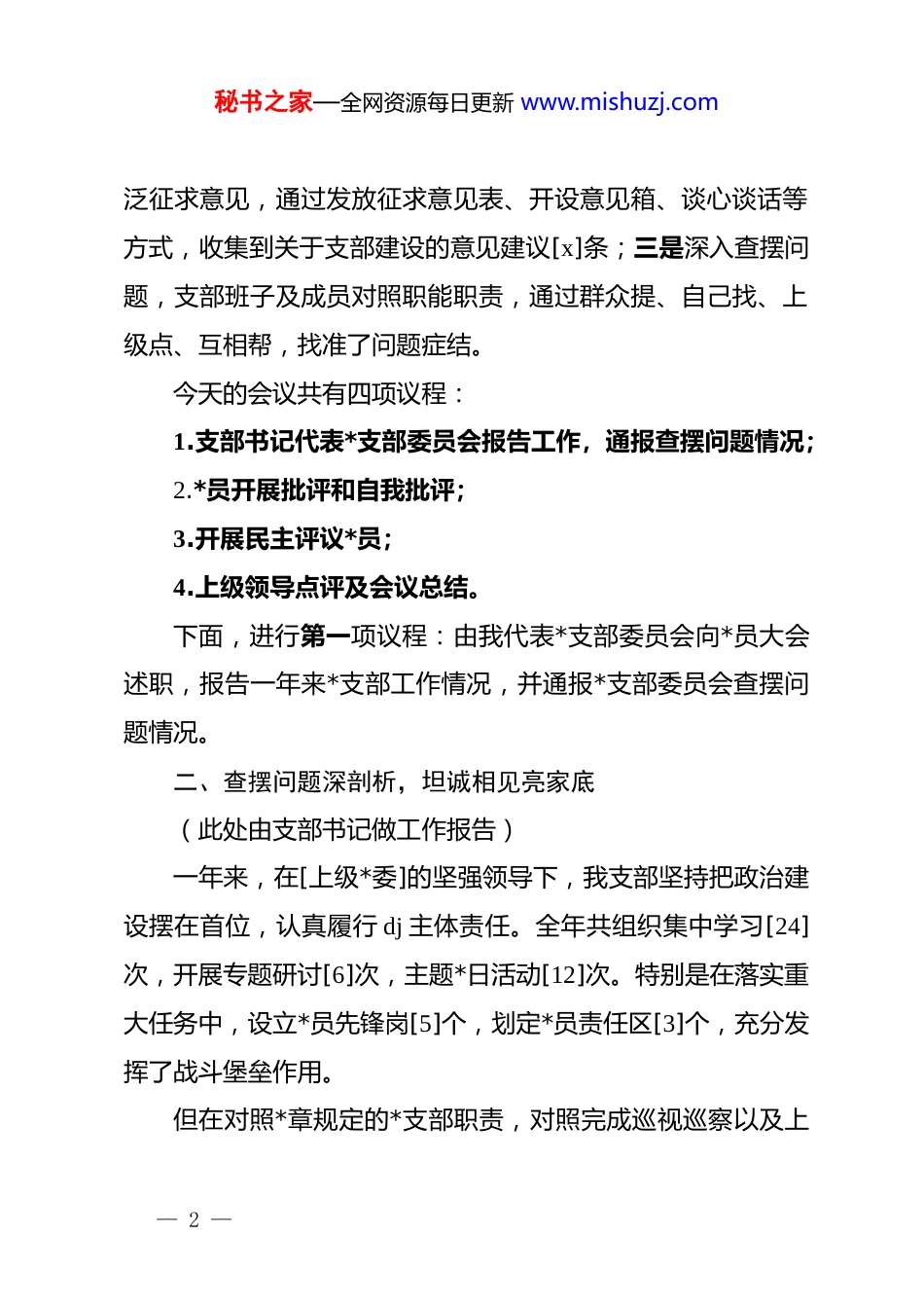 秘书之家—全网资源每日更新 www.mishuzj.com组织生活会全过程主持词:涤荡心灵尘埃铸忠诚 凝聚奋进力量担使命同志们:按照上级*组织关于召开组织生活会和开展民主评议*员工作的统一部署,结合我支部具体实施方案,今天我们在此召开年度专题组织生活会。本次会议的主要任务是:坚持以**************思想为指导,紧紧围绕深入学习贯彻*的二十大精神,深刻领悟“两个确立”的决定性意义,增强“四个意识”、坚定“四个自信”、做到“两个维护”,弘扬伟大建*精神,坚持自我革命,严肃开展批评和自我批评。今天,上级*委督导组组长[姓名]同志一行莅临我支部指导工作,让我们以热烈的掌声表示欢迎!一、严守程序做准备,把准方向定基调本次会议应到*员[xx]名,实到[xx]名,其中有表决权的*员[xx]名,符合《中国共产*章程》和《中国共产*基层组织选举工作条例》关于召开组织生活会的规定人数,可以开会。为开好这次组织生活会,支部委员会高度重视,会前做了充分准备:一是深化学习研讨,通过“三会一课”、主题*日等形式,组织*员集中学习了规定篇目,夯实了思想基础;二是广— 1 —秘书之家—全网资源每日更新 www.mishuzj.com泛征求意见,通过发放征求意见表、开设意见箱、谈心谈话等方式,收集到关于支部建设的意见建议[x]条;三是深入查摆问题,支部班子及成员对照职能职责,通过群众提、自己找、上级点、互相帮,找准了问题症结。今天的会议共有四项议程:1.支部书记代表*支部委员会报告工作,通报查摆问题情况;2.*员开展批评和自我批评;3.开展民主评议*员;4.上级领导点评及会议总结。下面,进行第一项议程:由我代表*支部委员会向*员大会述职,报告一年来*支部工作情况,并通报*支部委员会查摆问题情况。二、查摆问题深剖析,坦诚相见亮家底(此处由支部书记做工作报告)一年来,在[上级*委]的坚强领导下,我支部坚持把政治建设摆在首位,认真履行 dj 主体责任。全年共组织集中学习[24]次,开展专题研讨[6]次,主题*日活动[12]次。特别是在落实重大任务中,设立*员先锋岗[5]个,划定*员责任区[3]个,充分发挥了战斗堡垒作用。但在对照*章规定的*支部职责,对照完成巡视巡察以及上— 2 —秘书之家—全网资源每日更新 www.mishuzj.com级点评反馈的问题,对照人民群众的期待方面,支部委员会经深刻检视,主要存在以下三个方面的问题:(一)政治功能发挥尚存差距在理论武装上存在“温差”,部分学习流于形式,满足于读文件、听报告,在学懂弄通做实上下功夫不够。例如,在将**************思想转化为指导实践、推动工作的强大力量方面,结合不够紧密,存在“两张皮”现象。在贯彻落实上级决策部署时,有时存在按部就班、因循守旧的思想,缺乏创造性开展工作的锐气。(二)组织生活质效有待提升*内政治生活的政治性、时代性、原则性、战斗性还不够强。组织生活形式较为单一,多以会议传达为主,缺乏吸引力和感染力。谈心谈话制度落实不够到位,往往是“工作约谈”多、“思想交心”少,对*员的思想动态掌握不够精准,对困难*员的帮扶关爱还停留在节日慰问层面,缺乏长效机制。(三)服务群众能力亟需增强在联系服务群众“最后一公里”上还存在堵点。主动服务意识不强,坐等群众上门多、主动下沉一线少。针对群众反映强烈的[具体业务痛点]和[办事流程繁琐]等问题,解决力度不够大,整改措施不够硬,导致部分问题反复出现,群众满意度还— 3 —秘书之家—全网资源每日更新 www.mishuzj.com有提升空间。针对以上问题,支部委员会制定了如下整改措施:一是强化政治引领,建立常态化长效化学习机制,确保*的创新理论入脑入心;二是创新活动载体,丰富“dj+”模式,增强组织生活的吸引力;三是转变工作作风,推行“一线工作法”,切实解决群众急难愁盼问题。(请各位*员对支部工作报告进行审议,如有意见建议请直接提出。如无异议,我们将把整改清单作为下一步工作的重点。)三、刀刃向内求真言,辣味十足触灵魂下面,进行第二项议程:开展批评和自我批评。本次组织生活会要遵循“团结—批评—团结”的方针,坚持刀刃向内、自我革命。自我批评要直奔主题、解剖深刻;相互批...