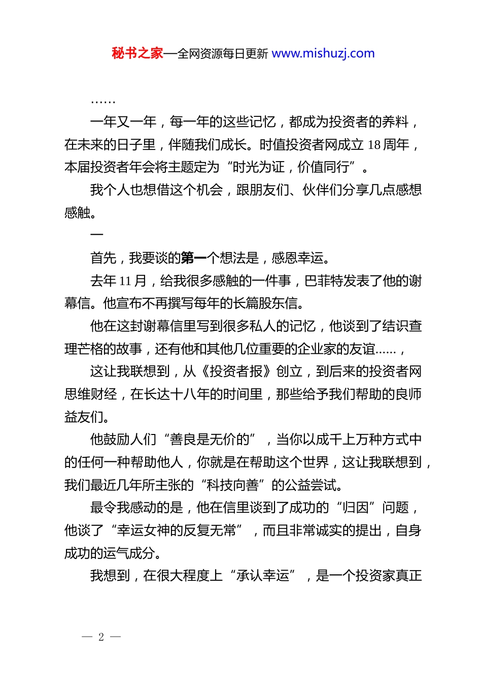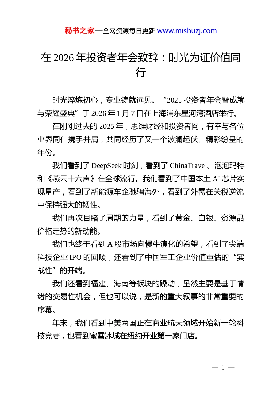 秘书之家—全网资源每日更新 www.mishuzj.com在 2026 年投资者年会致辞:时光为证价值同行时光淬炼初心,专业铸就远见。“2025 投资者年会暨成就与荣耀盛典”于 2026 年 1 月 7 日在上海浦东星河湾酒店举行。在刚刚过去的 2025 年,思维财经和投资者网,有幸与各位业界同仁携手并肩,共同经历了又一个波澜起伏、精彩纷呈的年份。我们看到了 DeepSeek 时刻,看到了 ChinaTravel、泡泡玛特和《燕云十六声》在全球流行。我们看到了中国本土 AI 芯片实现量产,看到了新能源车企驰骋海外,看到了外需在关税逆流中保持强大的韧性。我们再次目睹了周期的力量,看到了黄金、白银、资源品价格走势的新动能。我们也终于看到 A 股市场向慢牛演化的希望,看到了尖端科技企业 IPO 的回暖,还看到了中国军工企业价值重估的“实战性”的开端。我们还看到福建、海南等板块的躁动,虽然主要是基于情绪的交易性机会,但也可以说,是新的重大叙事的非常重要的序幕。年末,我们看到中美两国正在商业航天领域开始新一轮科技竞赛,也看到蜜雪冰城在纽约开业第一家门店。— 1 —秘书之家—全网资源每日更新 www.mishuzj.com……一年又一年,每一年的这些记忆,都成为投资者的养料,在未来的日子里,伴随我们成长。时值投资者网成立 18 周年,本届投资者年会将主题定为“时光为证,价值同行”。我个人也想借这个机会,跟朋友们、伙伴们分享几点感想感触。一首先,我要谈的第一个想法是,感恩幸运。去年 11 月,给我很多感触的一件事,巴菲特发表了他的谢幕信。他宣布不再撰写每年的长篇股东信。他在这封谢幕信里写到很多私人的记忆,他谈到了结识查理芒格的故事,还有他和其他几位重要的企业家的友谊……,这让我联想到,从《投资者报》创立,到后来的投资者网思维财经,在长达十八年的时间里,那些给予我们帮助的良师益友们。他鼓励人们“善良是无价的”,当你以成千上万种方式中的任何一种帮助他人,你就是在帮助这个世界,这让我联想到,我们最近几年所主张的“科技向善”的公益尝试。最令我感动的是,他在信里谈到了成功的“归因”问题,他谈了“幸运女神的反复无常”,而且非常诚实的提出,自身成功的运气成分。我想到,在很大程度上“承认幸运”,是一个投资家真正— 2 —秘书之家—全网资源每日更新 www.mishuzj.com成熟的标志。因为我们从事的是每天与概率打交道的行业,在整个职业生涯里无数次的推演策略、做出决策,都是为了获得一个更确定的结果。但是,往往是那些内心保持冷静、谦逊、敬畏的时期,我们才更容易获得良好的、甚至优秀的成绩。时光为证,十八年来,思维财经和投资者网有幸见证了中国资本市场的风风雨雨。我们不能不发自内心地感恩。也不能不更加珍惜,这么多年来,与各位同仁一起打造的这个交流的平台。我们希望能继续踏踏实实、不骄不躁地,把这份坚守继续下去。2023 年 10 月,一纸禁令切断了英伟达与中国最重要的商业链路。旗舰产品 A100、H100 的全面禁售,让中国的大模型公司一夜之间面临“断炊”风险,各大云厂商的算力扩张计划也戛然而止。二第二个感想是,我们行业里最耳熟能详的一个词组:逢低买入。对于逢低买入,我有两个层面的定义。首先一个层面是关于当下,我们怎么看待目前市场争论的两个焦点议题:一个是 AI 叙事,由 AI 基础设施投资主导的科技牛市,是否还能继续支撑美国经济的增长?AI 泡沫是否已经运行到风险巨大的阶段?— 3 —秘书之家—全网资源每日更新 www.mishuzj.com另一个是地缘风险,全球化终结,阵营化、碎片化带来的供应链安全挑战,该如何应对?大国博弈,乃至对抗升级,是否会将世界引向更危险的局面?我们现在没有确定的答案。但我相信,在大趋势的许多阶段性的波折里,“逢低买入”依然能帮到我们。2025 年的例子就摆在眼前,沪指正是关税战爆发后,开始了向 4000 点的爬升。逢低买入,也就是我们多年来一直奉行的长期主义和乐观主义。在顺风顺水之中,总还是怀有一份审慎。而越在风险突现的时候,越要保持乐观。因为危机总会发生,而风险资产的魅力,总是在危机后展现出它最美妙的样子。再一...