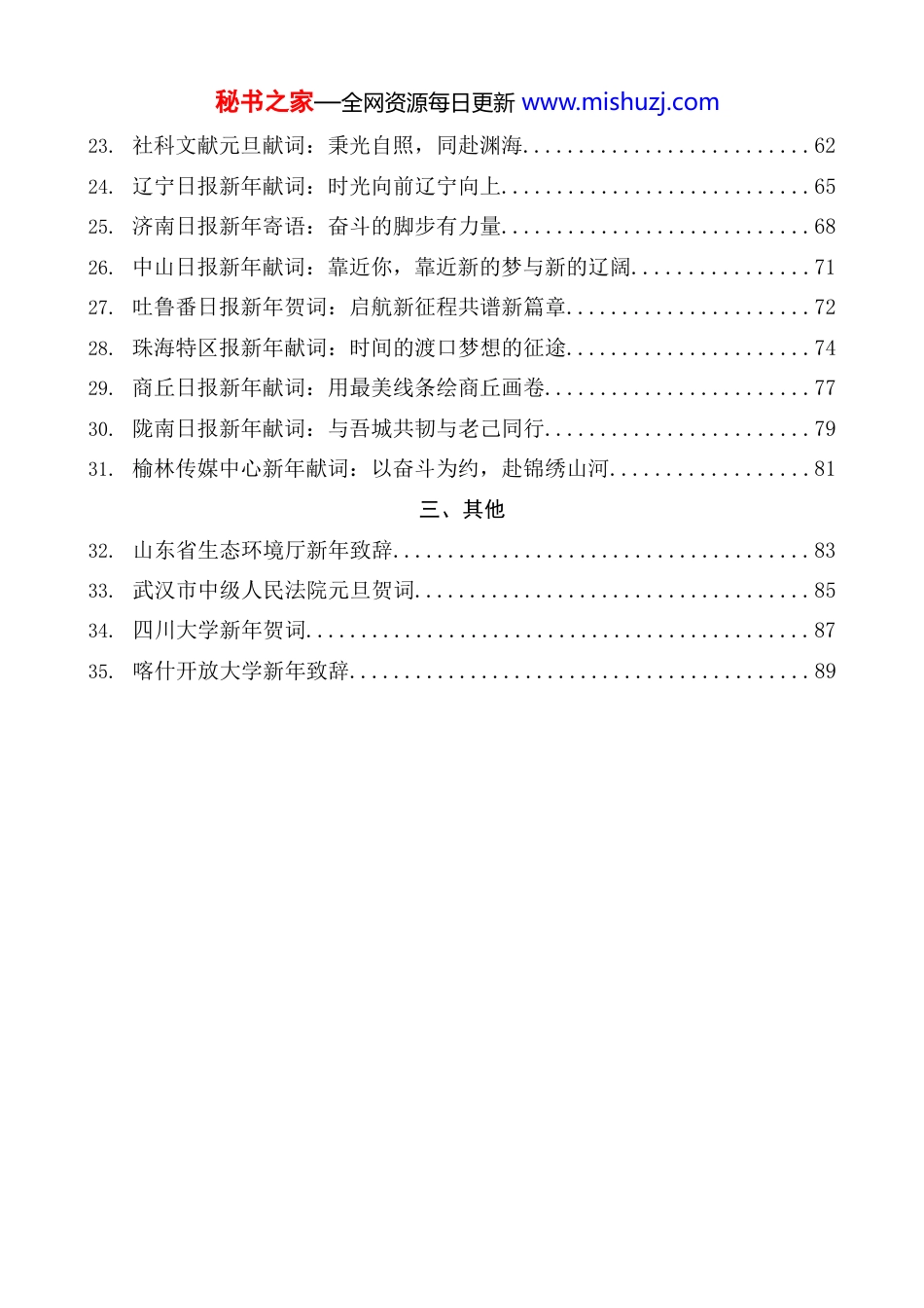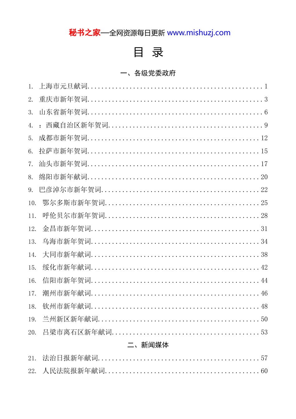 秘书之家—全网资源每日更新 www.mishuzj.com目 录一、各级党委政府1. 上海市元旦献词..................................................1 2. 重庆市新年贺词..................................................3 3. 山东省新年贺词..................................................6 4. :西藏自治区新年贺词............................................9 5. 成都市新年贺词.................................................12 6. 拉萨市新年贺词.................................................15 7. 汕头市新年贺词.................................................17 8. 绵阳市新年献词.................................................20 9. 巴彦淖尔市新年贺词.............................................22 10. 鄂尔多斯市新年贺词............................................25 11. 呼伦贝尔市新年贺词............................................28 12. 金昌市新年贺词................................................31 13. 乌海市新年贺词................................................34 14. 大同市新年献词................................................38 15. 绥化市新年献词................................................42 16. 信阳市新年贺词................................................44 17. 潮州市新年献词................................................46 18. 钦州市新年献词................................................48 19. 兰州新区新年献词..............................................50 20. 吕梁市离石区新年献词..........................................53 二、新闻媒体21. 法治日报新年献词..............................................57 22. 人民法院报新年献词............................................60 秘书之家—全网资源每日更新 www.mishuzj.com23. 社科文献元旦献词:秉光自照,同赴渊海..........................62 24. 辽宁日报新年献词:时光向前辽宁向上............................65 25. 济南日报新年寄语:奋斗的脚步有力量............................68 26. 中山日报新年献词:靠近你,靠近新的梦与新的辽阔................71 27. 吐鲁番日报新年贺词:启航新征程共谱新篇章......................72 28. 珠海特区报新年献词:时间的渡口梦想的征途......................74 29. 商丘日报新年献词:用最美线条绘商丘画卷........................77 30. 陇南日报新年献词:与吾城共韧与老己同行........................79 31. 榆林传媒中心新年献词:以奋斗为约,赴锦绣山河..................81 三、其他32. 山东省生态环境厅新年致辞......................................83 33. 武汉市中级人民法院元旦贺词....................................85 34. 四川大学新年贺词..............................................87 35. 喀什开放大学新年致辞..........................................89秘书之家—全网资源每日更新 www.mishuzj.com上海市元旦献词(2026 年 1 月 1 日)市民们,同志们,朋友们:一元复始,华章日新。在这辞旧迎新的美好时刻,我谨代表上海市人民政府,向全市人民和关心支持上海发展的海内外朋友,致以新年的问候和诚挚的祝福!2025 年,是“十四五”规划冲刺收官之年,是“十五五”规划谋篇布局之年。习近平总书记再次亲临上海考察指导,对上海发展作出新的战略擘画、战略指引,赋予为国担当、勇为尖兵的重大使命,全市人民备受鼓舞、倍感振奋。这一年,我们全力促进经济平稳健康发展,经济稳中向好势头巩固拓展。稳增长、促转型的一揽子政策举措落地见效,消费品以旧换新、“乐·上海” 服务消费券等扩消费政策聚力增效,文旅商体展加速融合,一系列文博大展、体育赛事、消费节庆亮点纷呈;科技创新引领新质生产力发展壮大,集成电路...