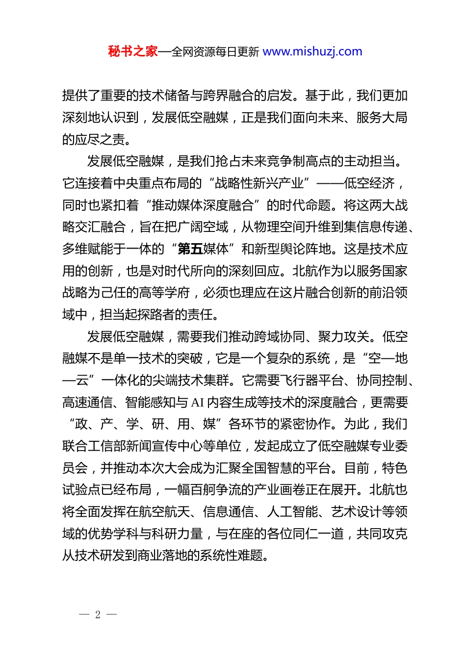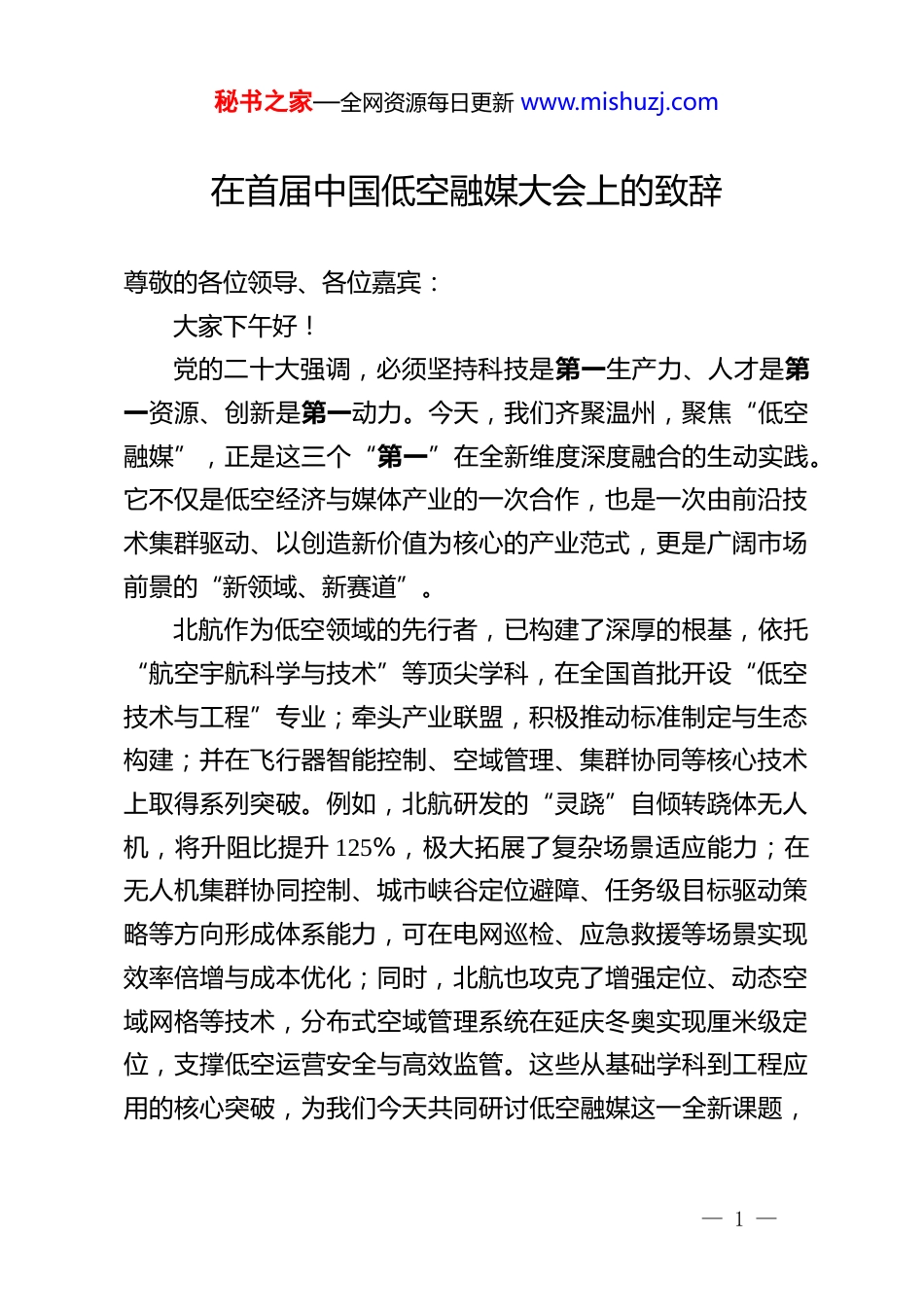 秘书之家—全网资源每日更新 www.mishuzj.com在首届中国低空融媒大会上的致辞尊敬的各位领导、各位嘉宾:大家下午好!党的二十大强调,必须坚持科技是第一生产力、人才是第一资源、创新是第一动力。今天,我们齐聚温州,聚焦“低空融媒”,正是这三个“第一”在全新维度深度融合的生动实践。它不仅是低空经济与媒体产业的一次合作,也是一次由前沿技术集群驱动、以创造新价值为核心的产业范式,更是广阔市场前景的“新领域、新赛道”。北航作为低空领域的先行者,已构建了深厚的根基,依托“航空宇航科学与技术”等顶尖学科,在全国首批开设“低空技术与工程”专业;牵头产业联盟,积极推动标准制定与生态构建;并在飞行器智能控制、空域管理、集群协同等核心技术上取得系列突破。例如,北航研发的“灵跷”自倾转跷体无人机,将升阻比提升 125%,极大拓展了复杂场景适应能力;在无人机集群协同控制、城市峡谷定位避障、任务级目标驱动策略等方向形成体系能力,可在电网巡检、应急救援等场景实现效率倍增与成本优化;同时,北航也攻克了增强定位、动态空域网格等技术,分布式空域管理系统在延庆冬奥实现厘米级定位,支撑低空运营安全与高效监管。这些从基础学科到工程应用的核心突破,为我们今天共同研讨低空融媒这一全新课题,— 1 —秘书之家—全网资源每日更新 www.mishuzj.com提供了重要的技术储备与跨界融合的启发。基于此,我们更加深刻地认识到,发展低空融媒,正是我们面向未来、服务大局的应尽之责。发展低空融媒,是我们抢占未来竞争制高点的主动担当。它连接着中央重点布局的“战略性新兴产业”——低空经济,同时也紧扣着“推动媒体深度融合”的时代命题。将这两大战略交汇融合,旨在把广阔空域,从物理空间升维到集信息传递、多维赋能于一体的“第五媒体”和新型舆论阵地。这是技术应用的创新,也是对时代所向的深刻回应。北航作为以服务国家战略为己任的高等学府,必须也理应在这片融合创新的前沿领域中,担当起探路者的责任。发展低空融媒,需要我们推动跨域协同、聚力攻关。低空融媒不是单一技术的突破,它是一个复杂的系统,是“空—地—云”一体化的尖端技术集群。它需要飞行器平台、协同控制、高速通信、智能感知与 AI 内容生成等技术的深度融合,更需要“政、产、学、研、用、媒”各环节的紧密协作。为此,我们联合工信部新闻宣传中心等单位,发起成立了低空融媒专业委员会,并推动本次大会成为汇聚全国智慧的平台。目前,特色试验点已经布局,一幅百舸争流的产业画卷正在展开。北航也将全面发挥在航空航天、信息通信、人工智能、艺术设计等领域的优势学科与科研力量,与在座的各位同仁一道,共同攻克从技术研发到商业落地的系统性难题。— 2 —秘书之家—全网资源每日更新 www.mishuzj.com发展低空融媒,目标在于创造价值、服务社会。展望未来低空融媒的生命力,不仅存在视觉层面,更多的是走向实用服务。它可以是应急救援时的空中指引灯塔,是文旅景区里沉浸式的文化叙事者,是城市天空中实时互动的信息服务站,甚至是连接全球华人情感的“侨乡天幕”。本次大会所筹备的系列工作,其核心目的,更是为了构建一个健康、可持续的产业生态,让技术创新的成果,最终转化为服务千行百业、惠及千家万户的新质生产力。各位来宾,朋友们!低空之上,融合新生。本届大会,既是一次行业的集结与定义,更是一次面向未来的共同约定。我们期待,以本次大会为起点,与各方携手,将“低空融媒”从一个创新的概念,加速推动成为一个清晰、繁荣、具有国际竞争力的战略性新兴产业集群。最后,预祝首届中国低空融媒大会取得圆满成功!谢谢大家!— 3 —